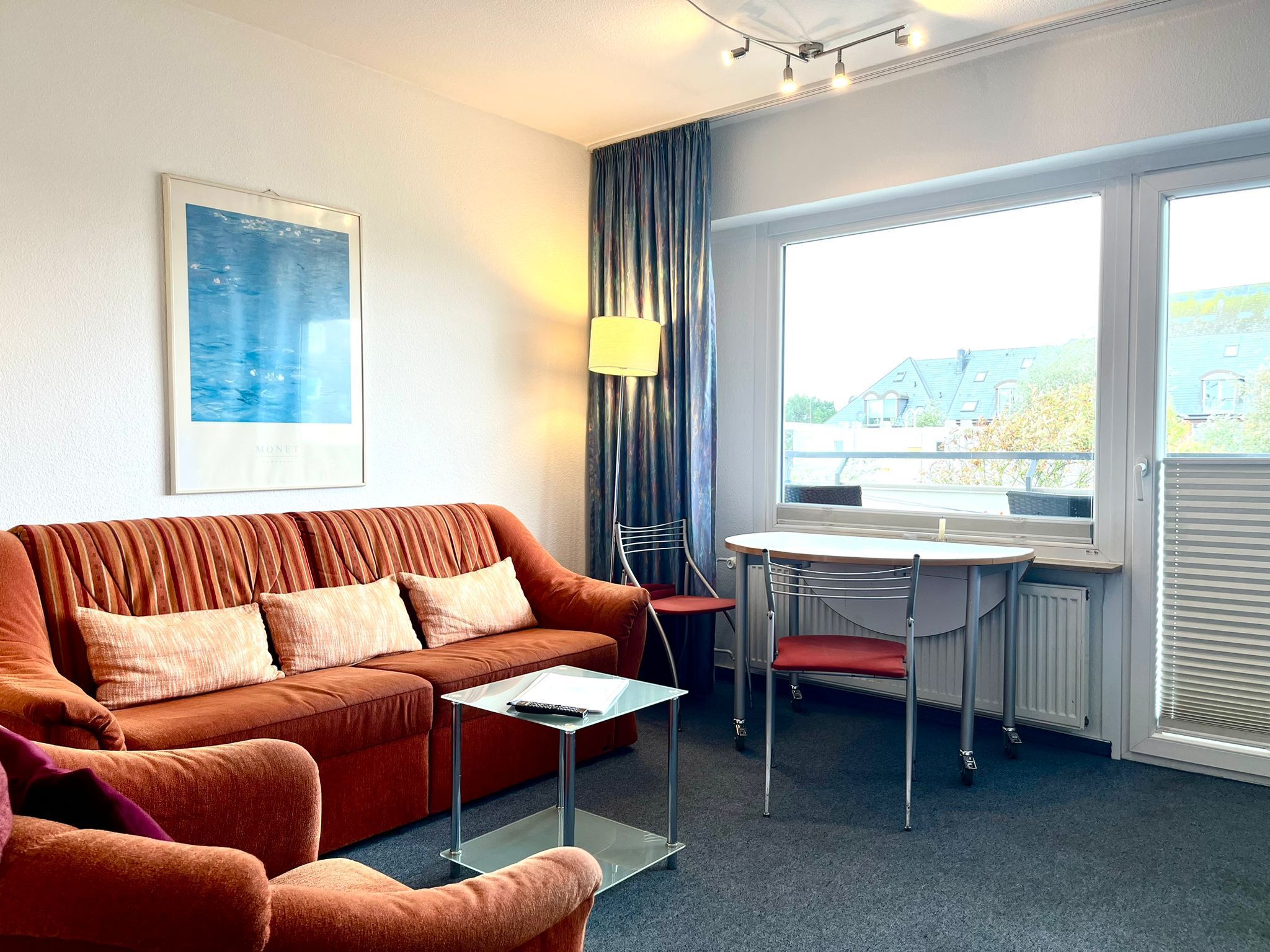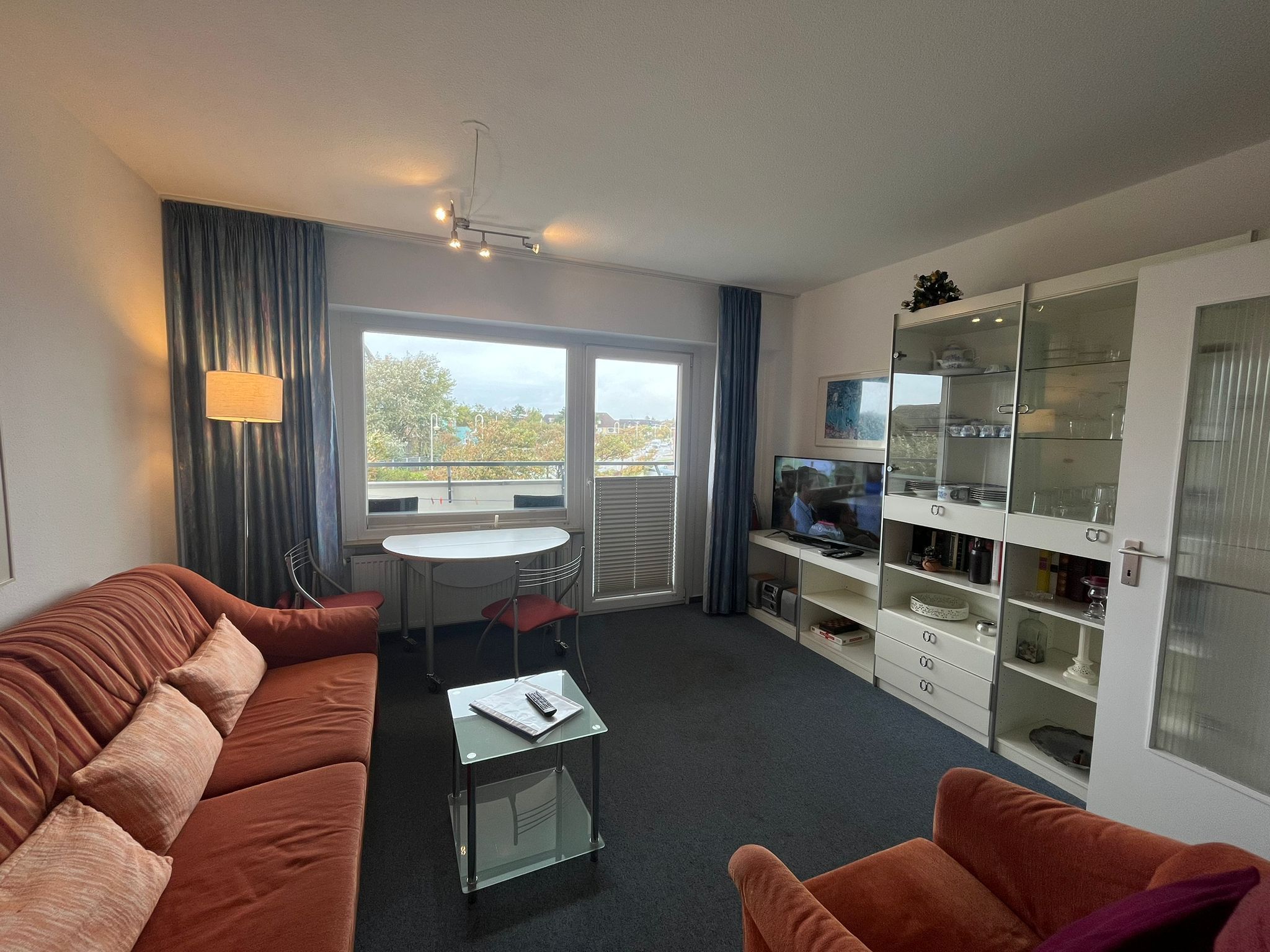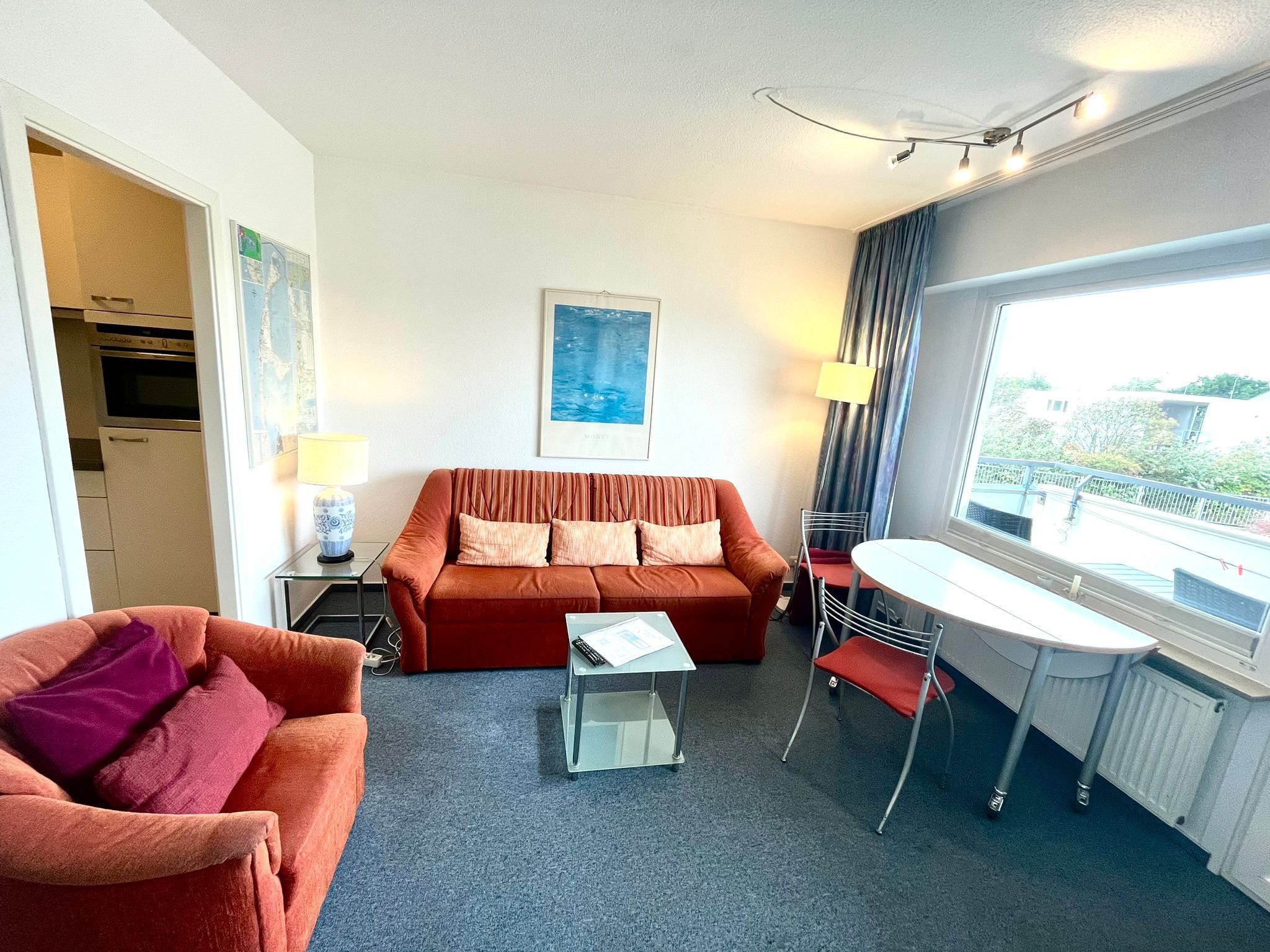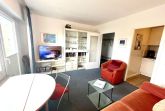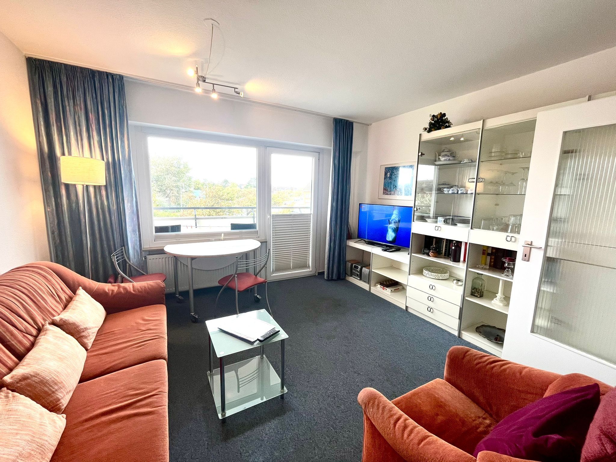 Ein helles Wohnzimmer mit Couchgarnitur sowie Essecke mit 4 Stühlen, Kabel-TV mit Flachbildschirm ist der Mittelpunkt der Wohnung.