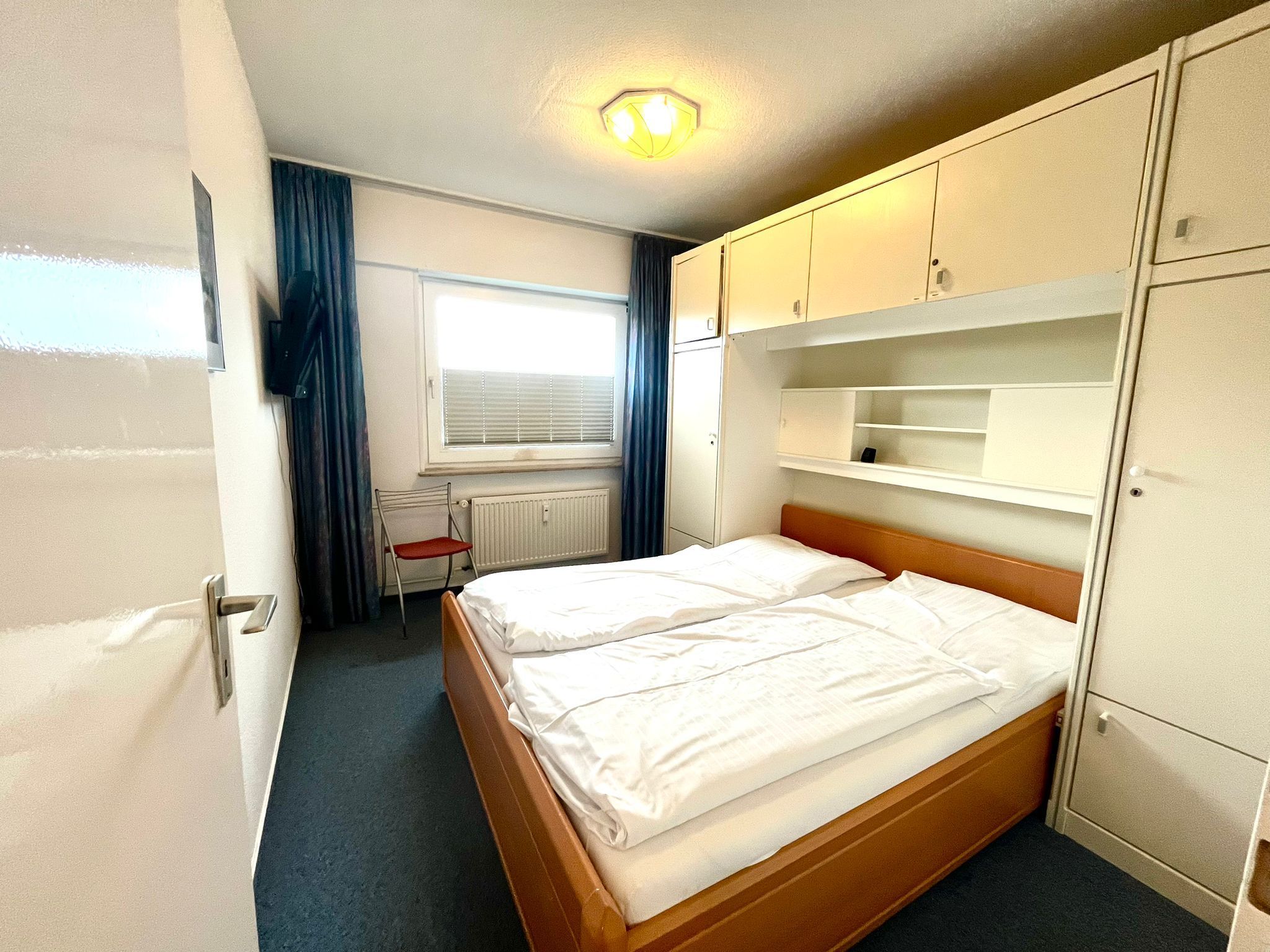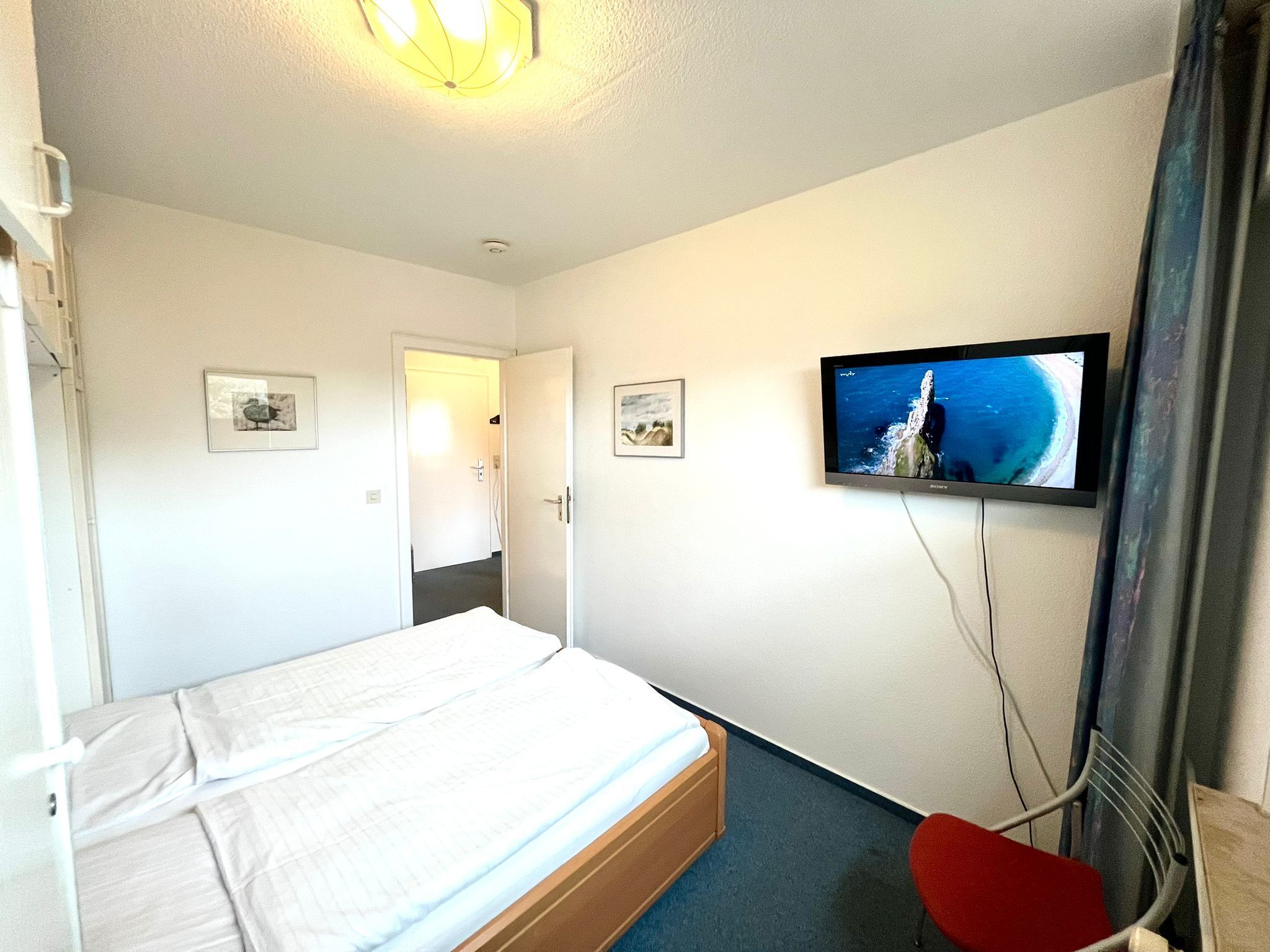 Schlafzimmer mit Doppelschrankbett und Flachbild- TV.