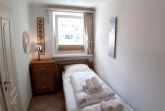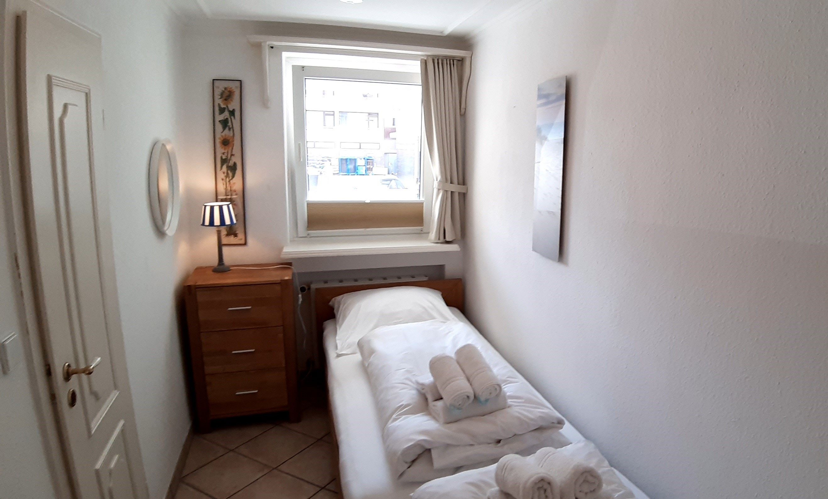 Das Schlafzimmer dient mit zwei hintereinanderstehenden Betten (90x190cm) und einer kleinen Kommode zu Ihrem allgemeinen Wohlbefinden. Bettwäsche und Handtücher sind im Endpreis enthalten.