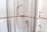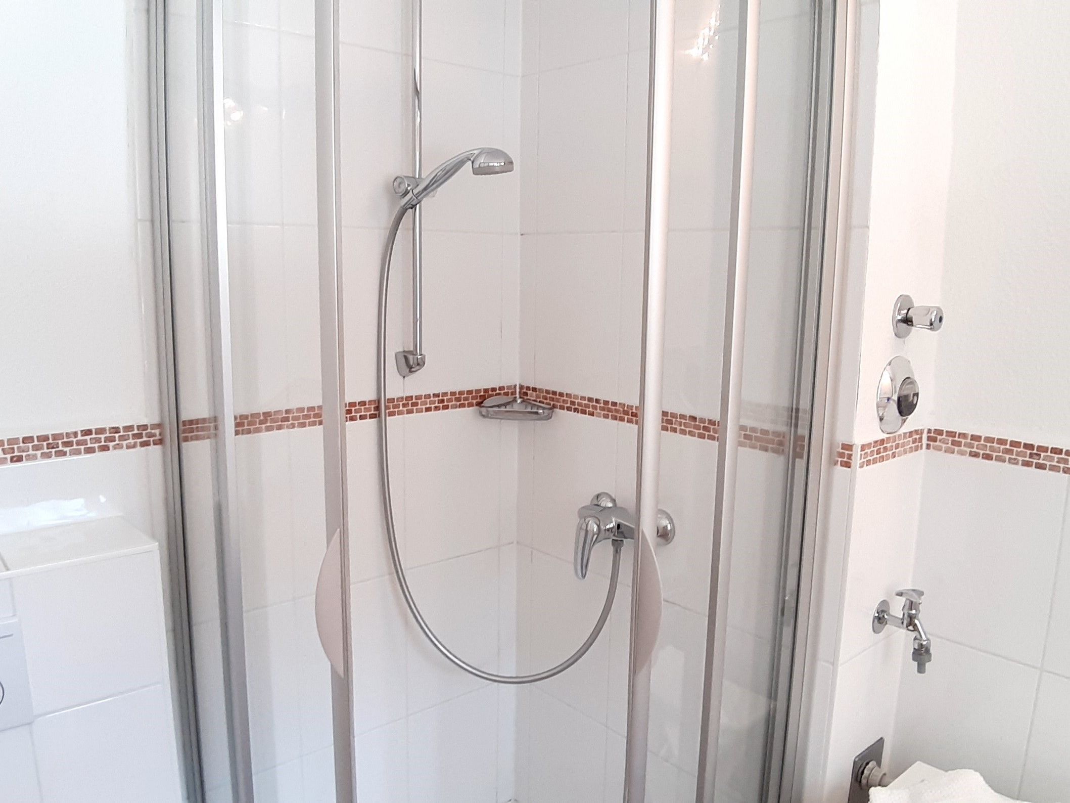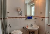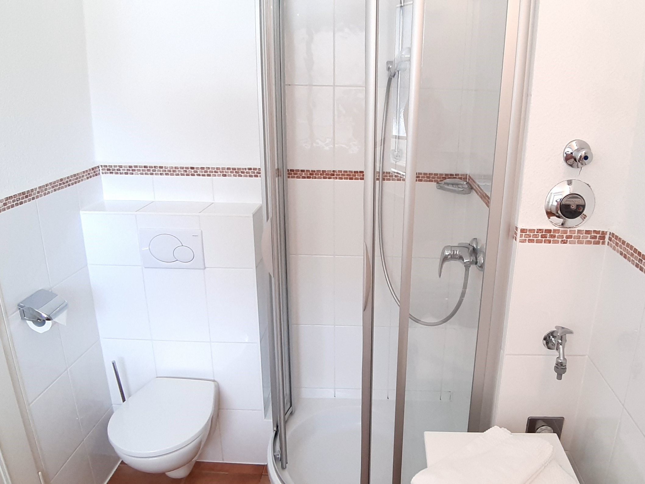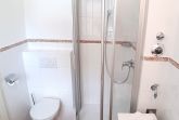 Ein helles Bad mit Waschbecken, Runddusche, WC und Außenfenster.