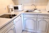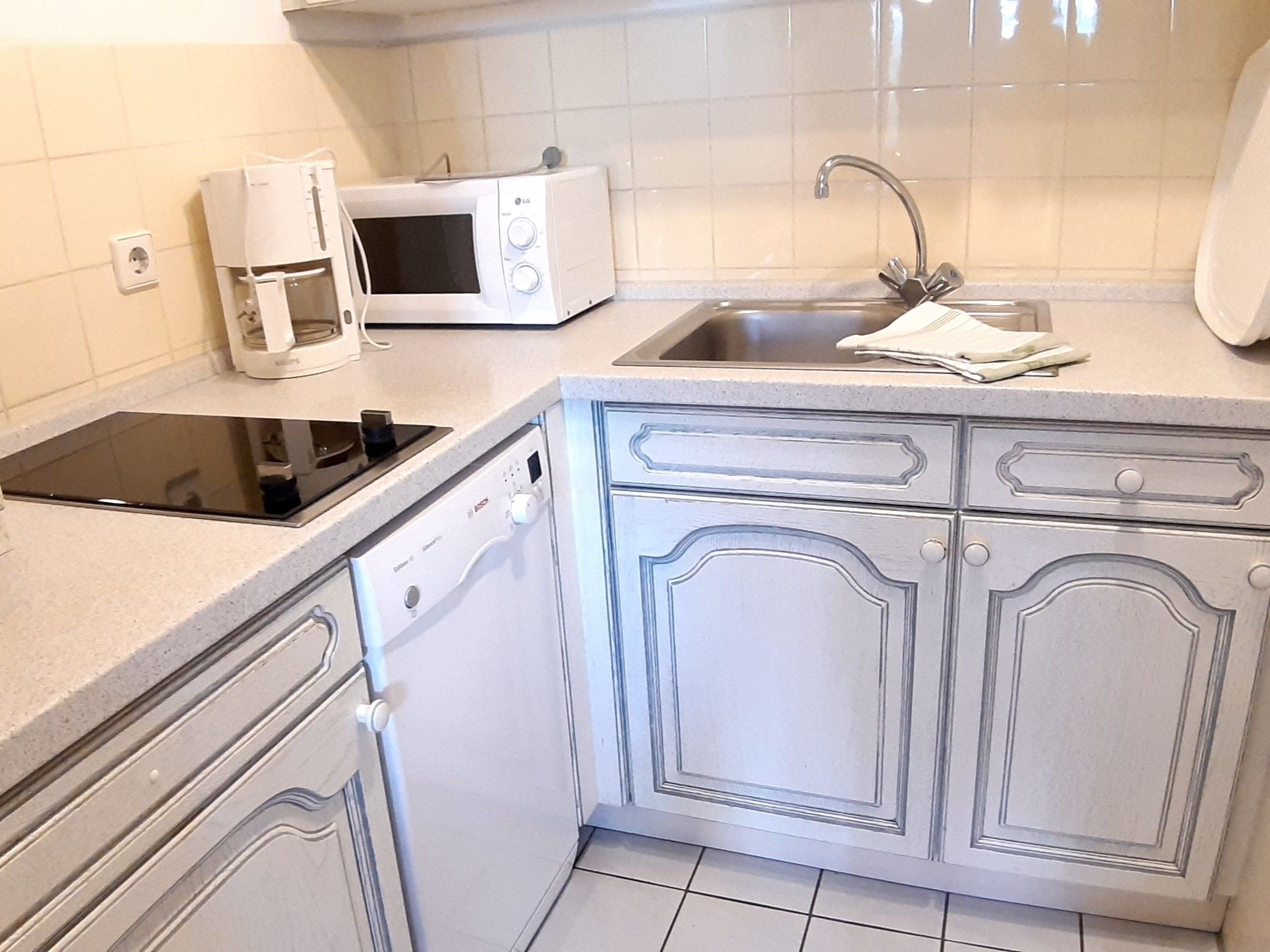 Eine separate Küche ausgestattet mit Cerankochfeld, Geschirrspüler, Kühlschrank mit Gefrierfach, Mikrowelle, Kaffeemaschine, Toaster, Wasserkocher und Geschirr für den täglichen Gebrauch.