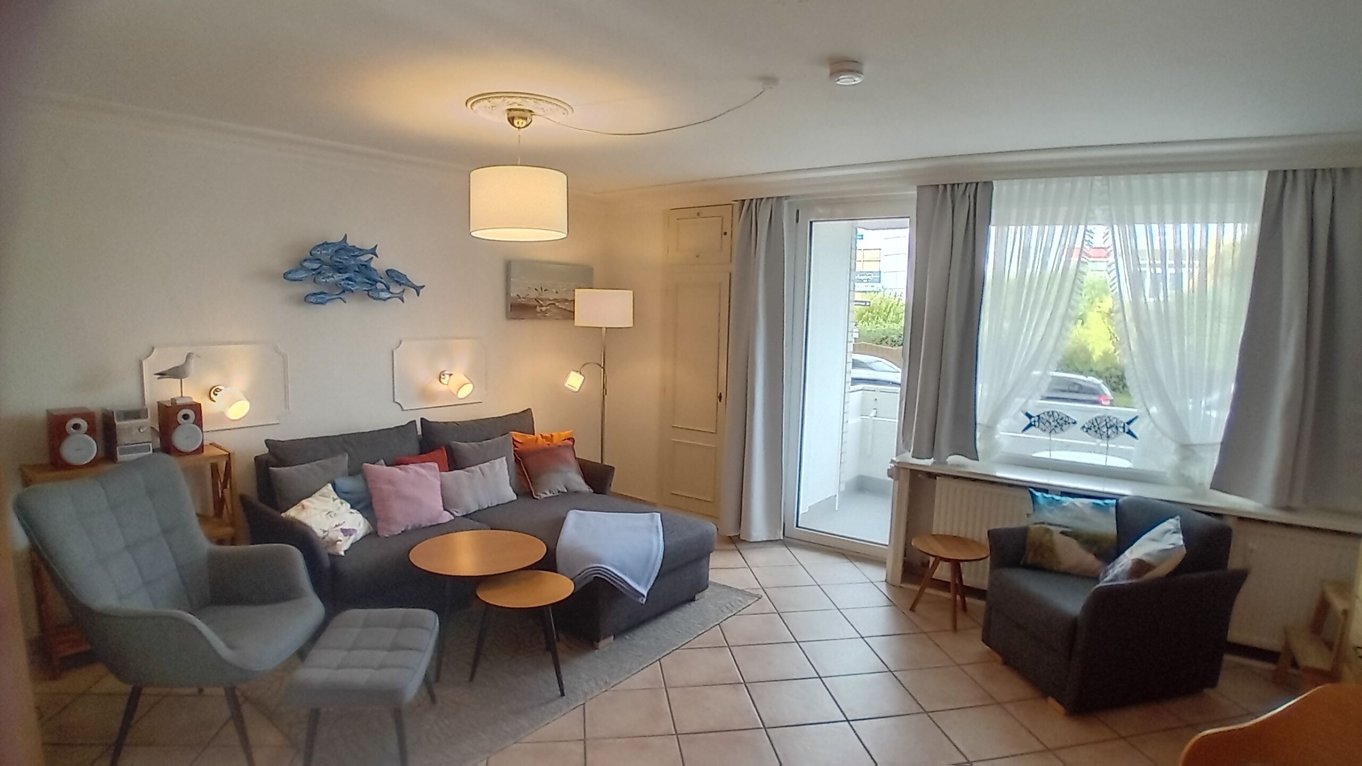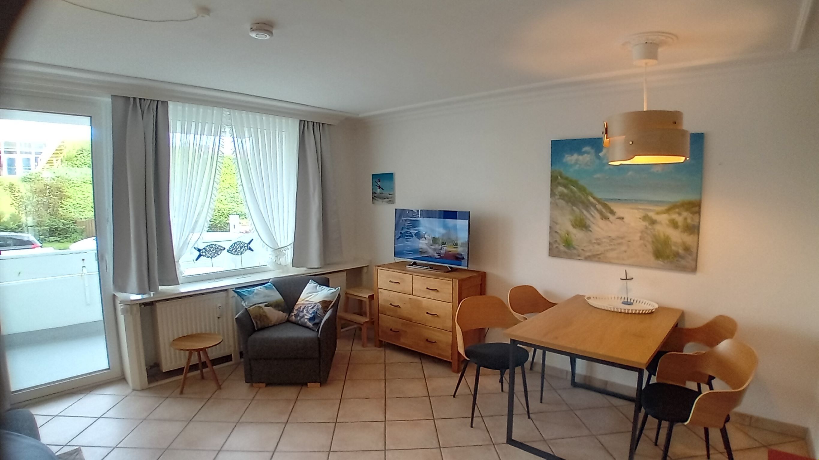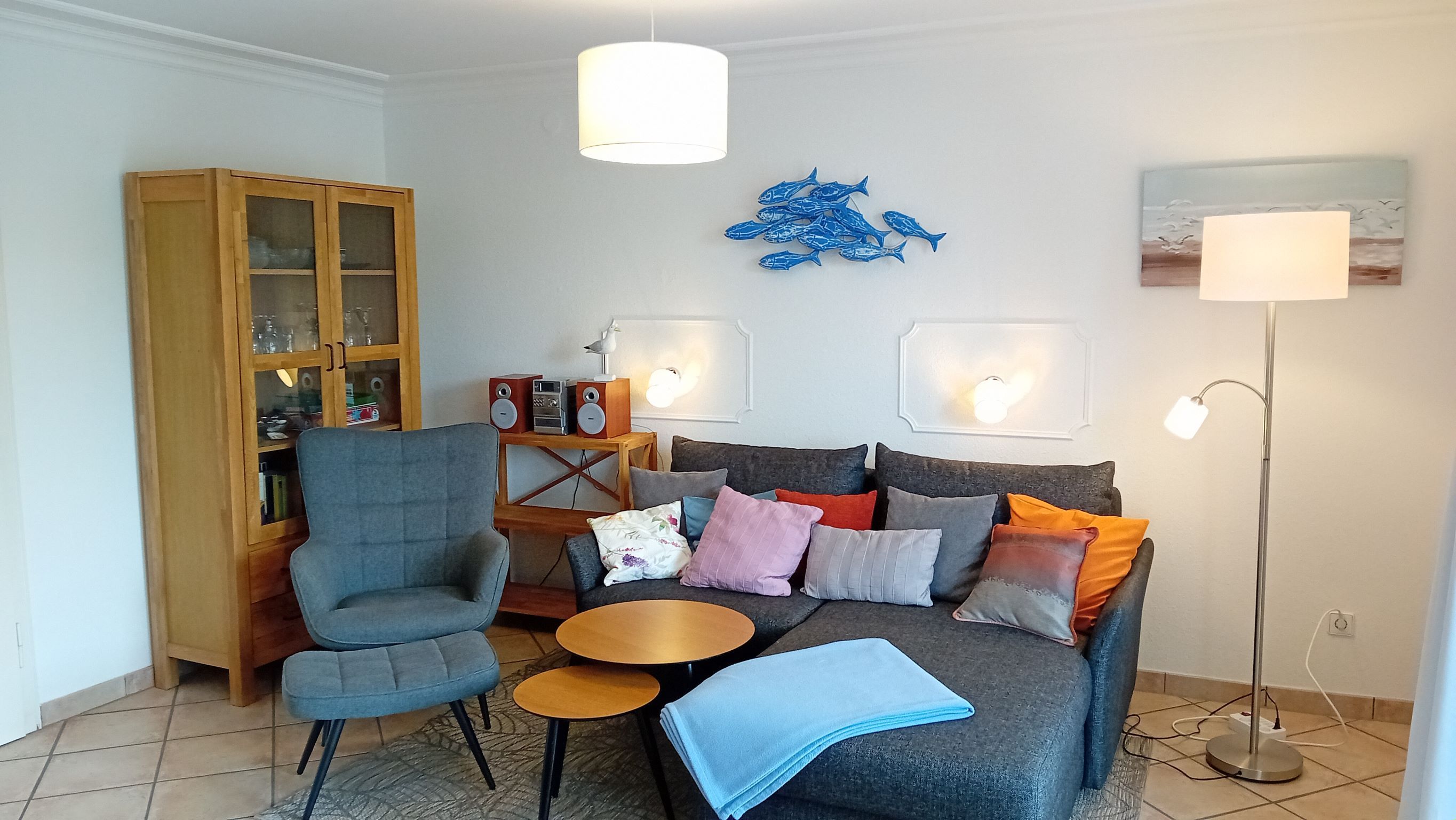 Das freundliche Wohnzimmer bietet eine Sitzgarnitur mit Couch und Sessel, Wohnzimmerschrank, Sideboard, Flachbild-TV, Stereoanlage und Essbereich mit 4 Stühlen. Des Weiteren finden Sie hier einige Bücher und Spiele.