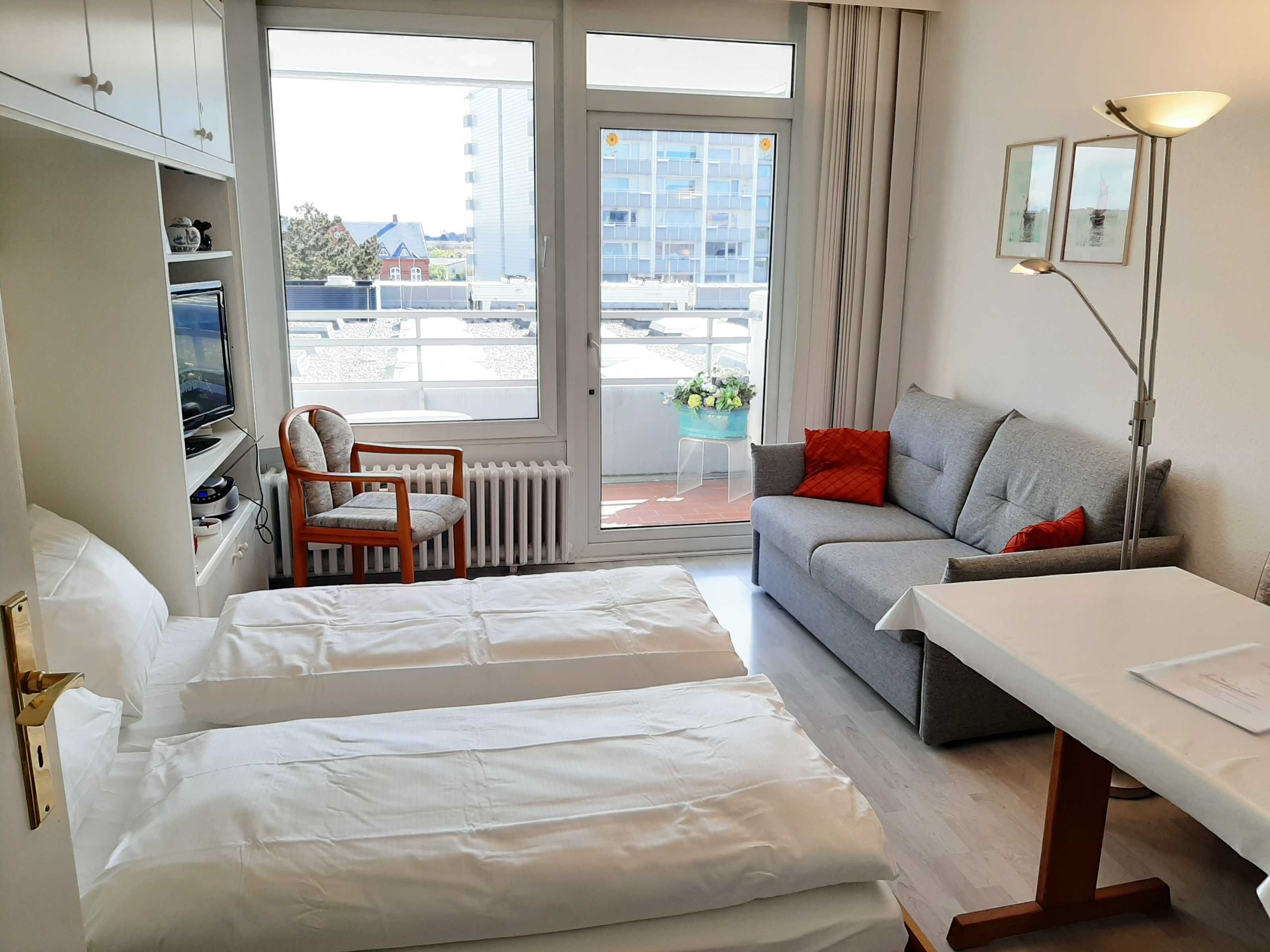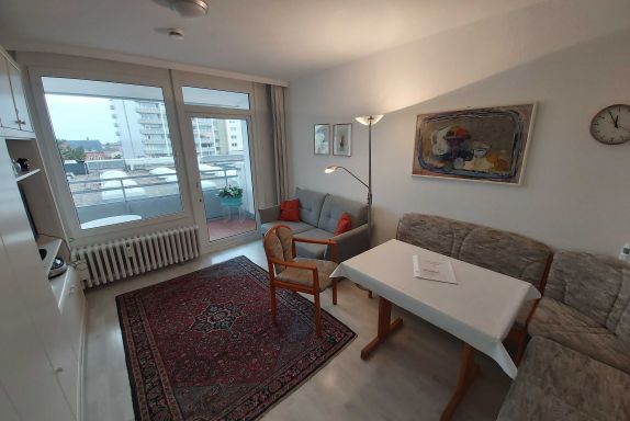 Das mitten im Zentrum Westerlands gelegene 1-Zimmerappartement mit einfacher Ausstattung, befindet sich in der 1. Etage (1W) eines 7-geschossigen Appartementhauses und ist bequem mit dem Aufzug zu erreichen. Die ca 29m² große Nichtraucher-Wohnung besteht aus einem kombiniertem Wohn/Schlafraum, Küche, Dusche/WC, Balkon Parkplatz auf dem Parkdeck Nr. 57. Kostenfreies W-Lan.