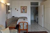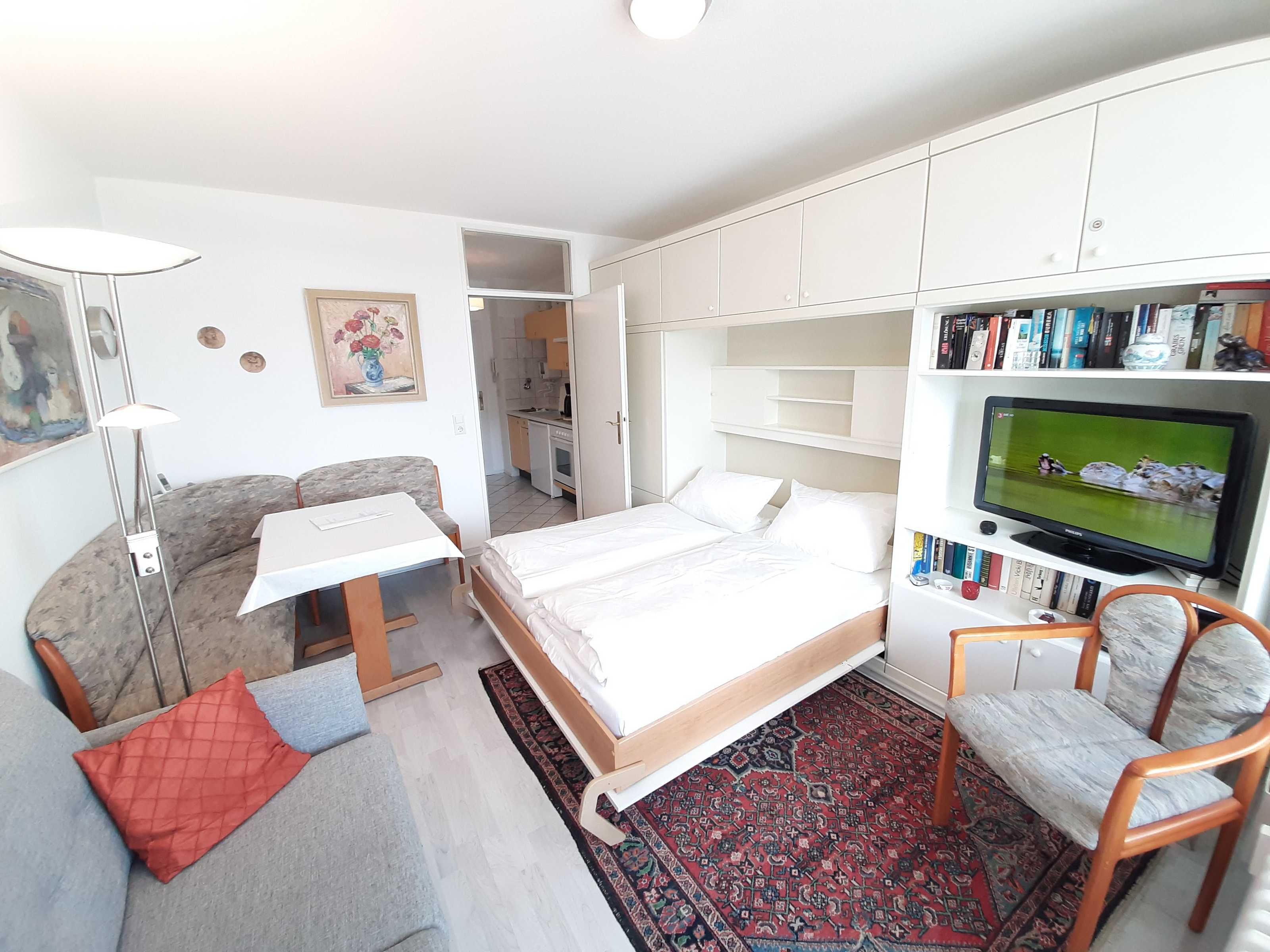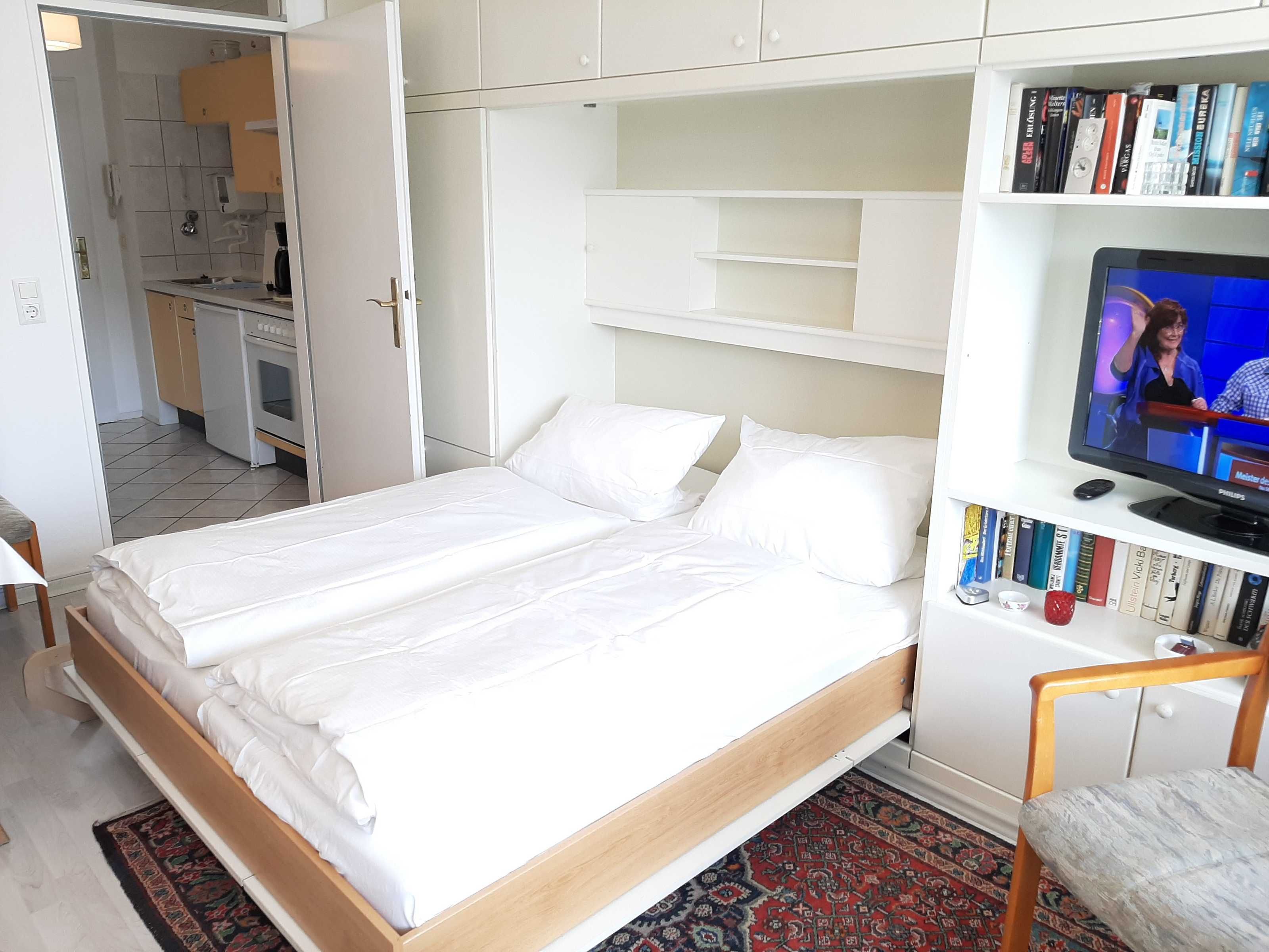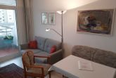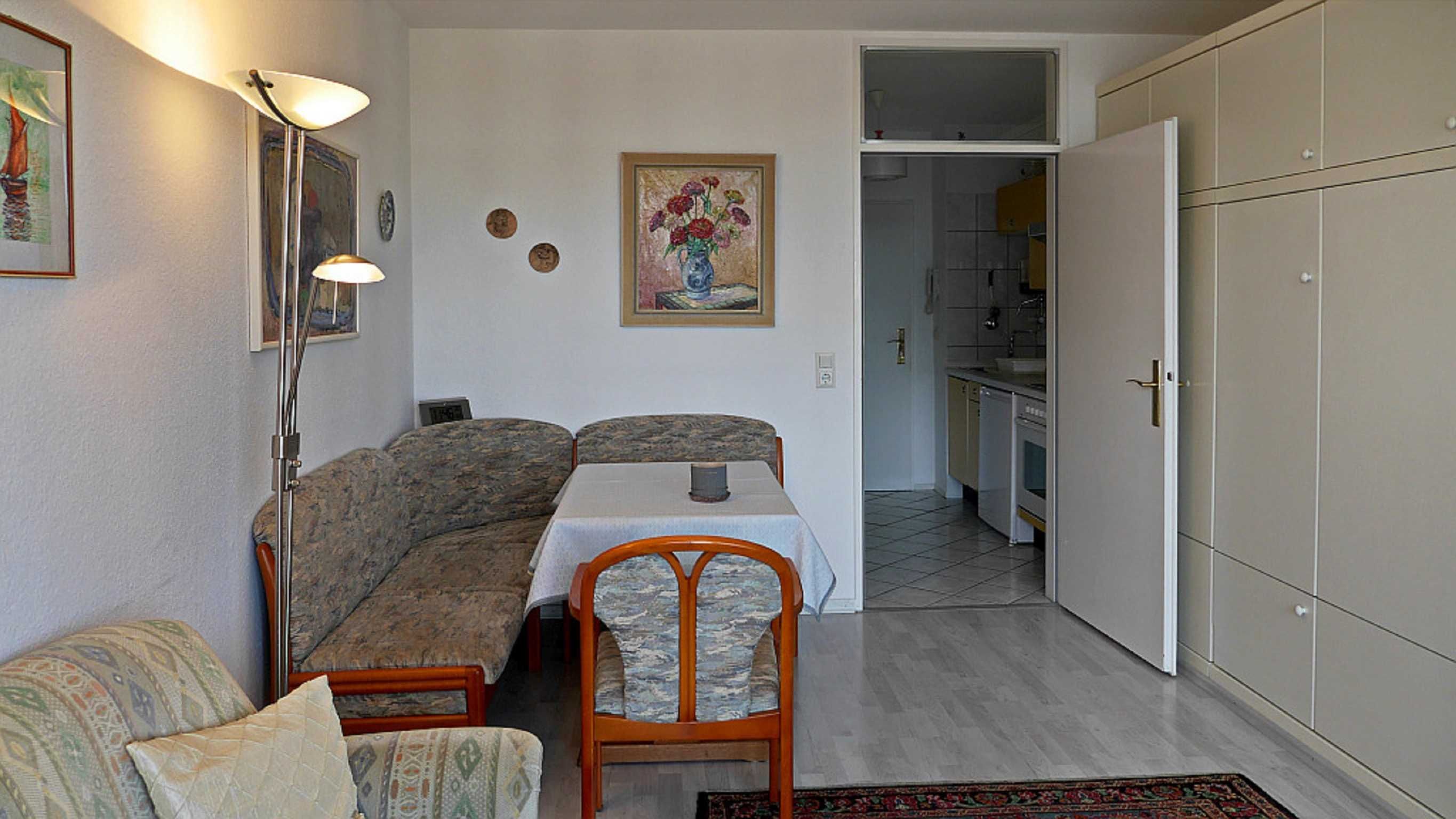Die Nichtraucher-Einraum-Wohnung für 1-2 Personen befindet sich in der 1. Etage des Appartementhauses (Fahrstuhl vorhanden). Sie hat eine Größe von ca.29,5m² und mit einfacher Ausstattung eingerichtet. Der kombinierte Wohn-Schlafraum verfügt über ein Doppelschrankbett (1,60 x 1,90 m) einen Esstisch mit Essecke, sowie einem Sofa und einem Farb-TV (Flachbildschirm). Die Küchenzeile mit Elektroherd, Kühlschrank und Spüle befindet sich im Flurbereich. Badezimmer mit Dusche/WC. Die Wohnung verfügt über einen überdachten Balkon (Loggia) Richtung Osten mit Balkonmöbeln. W-LAN vorhanden. Waschmaschinen und Trocknernutzung im Haus vorhanden! Haustiere sind nicht erlaubt!