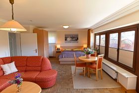Ein schöner Wohn/ Schlafraum mit Sitzgarnitur, Flachbild-TV, Essecke und Doppelbett ist der Mittelpunkt der Wohnung.