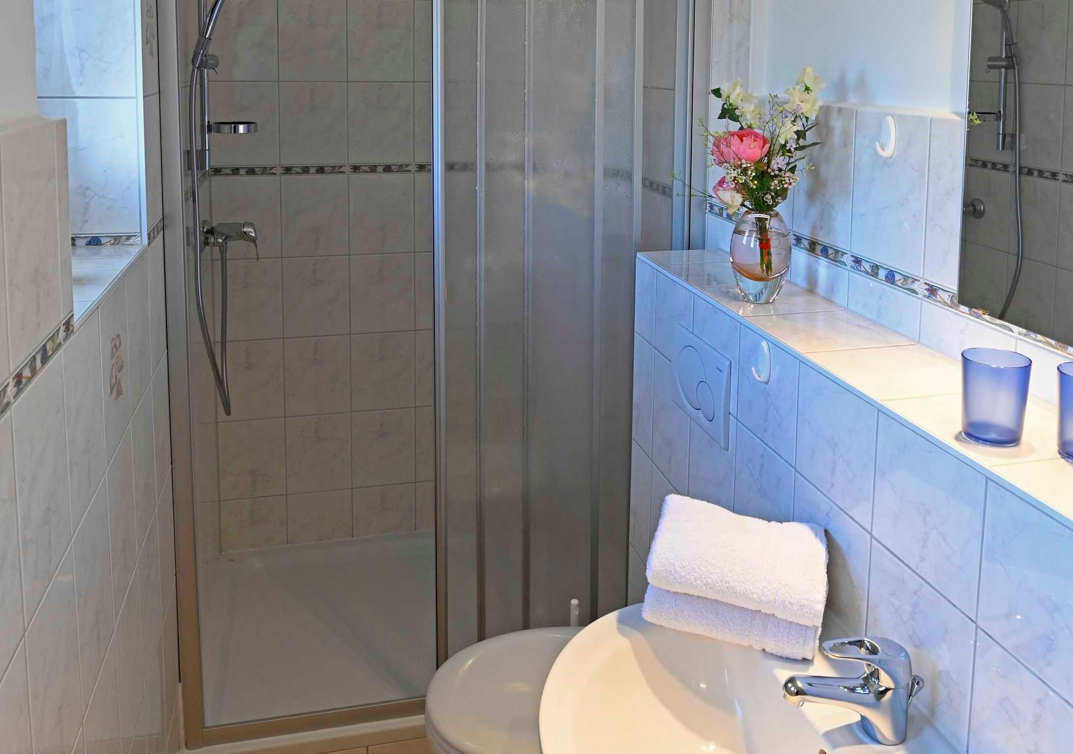 Ein Bad mit Dusche, WC, Waschbecken und Fön.