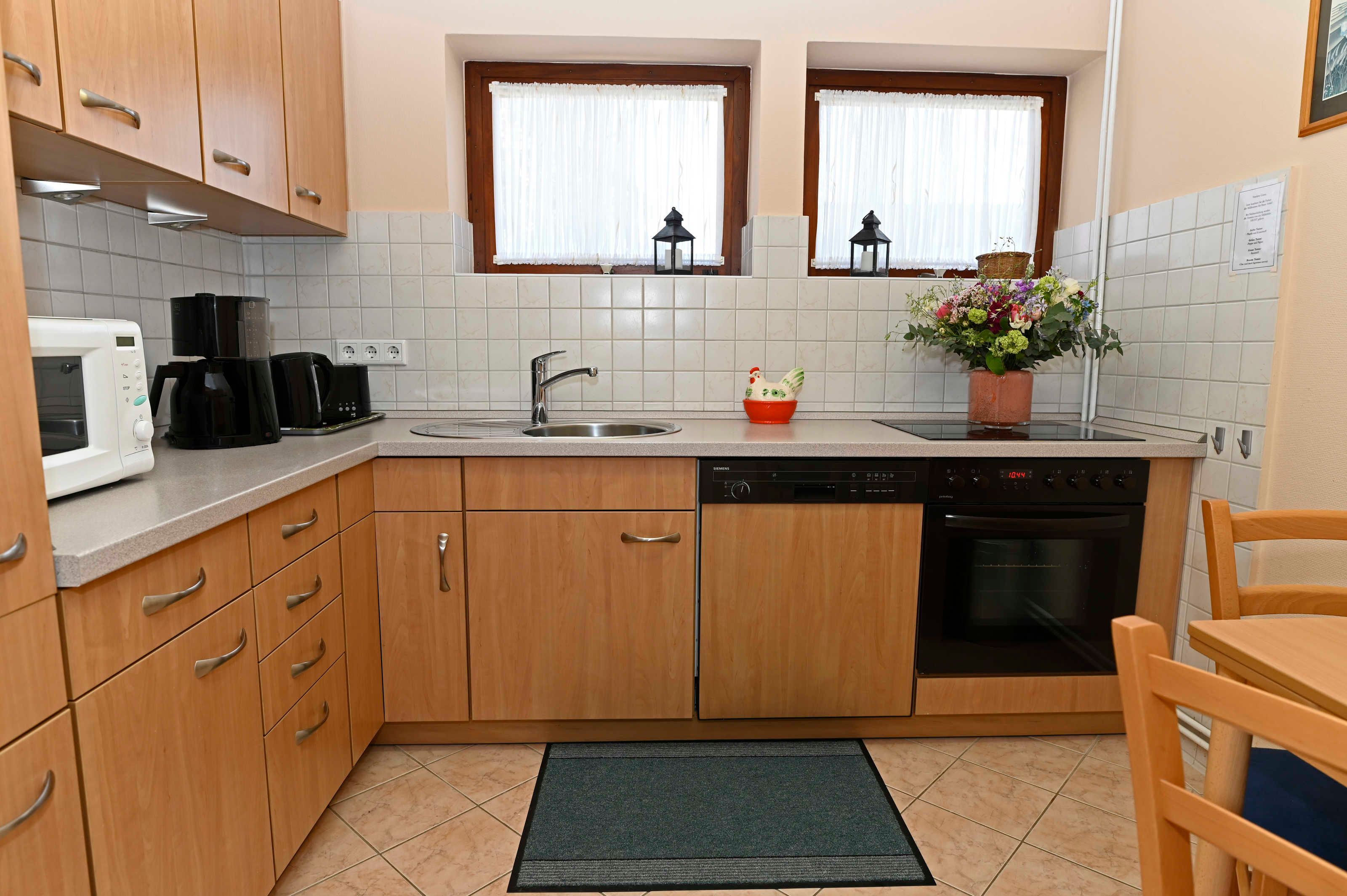 Separate Küche mit Essecke, Ceran-Kochfeld, Backofen, Geschirrspüler, Filter-Kaffeemaschine, elektrischer Wasserkocher, Toaster und Geschirr für den täglichen Bedarf sind selbstverständlich.