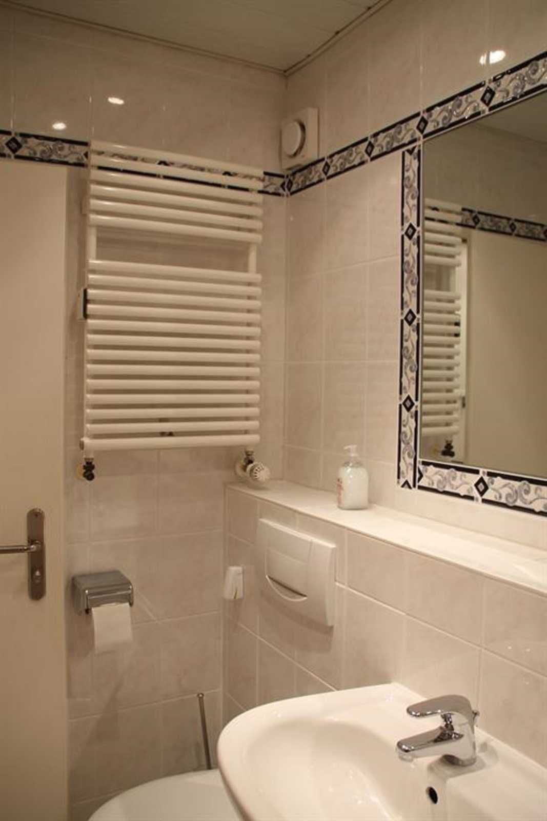 Ein helles Bad mit Waschbecken, Dusche, WC, Handtuchwärmer.
