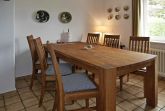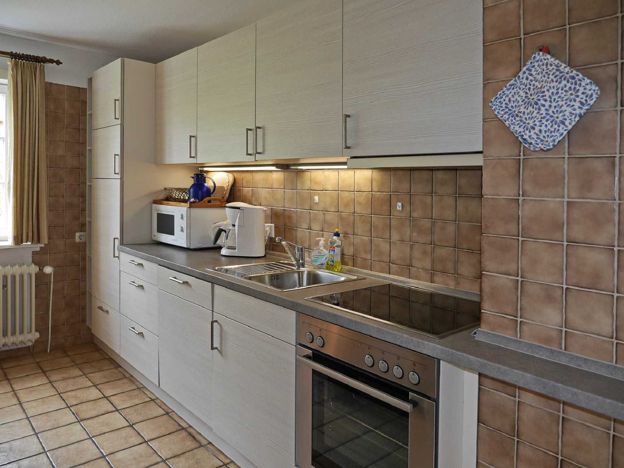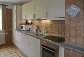 Separate Küche eingerichtet mit Essecke, Ceran-Kochfeld, Backofen, Mikrowelle, Geschirrspüler, Filter-Kaffeemaschine, elektrischer Wasserkocher, Toaster und Geschirr für den täglichen Bedarf.