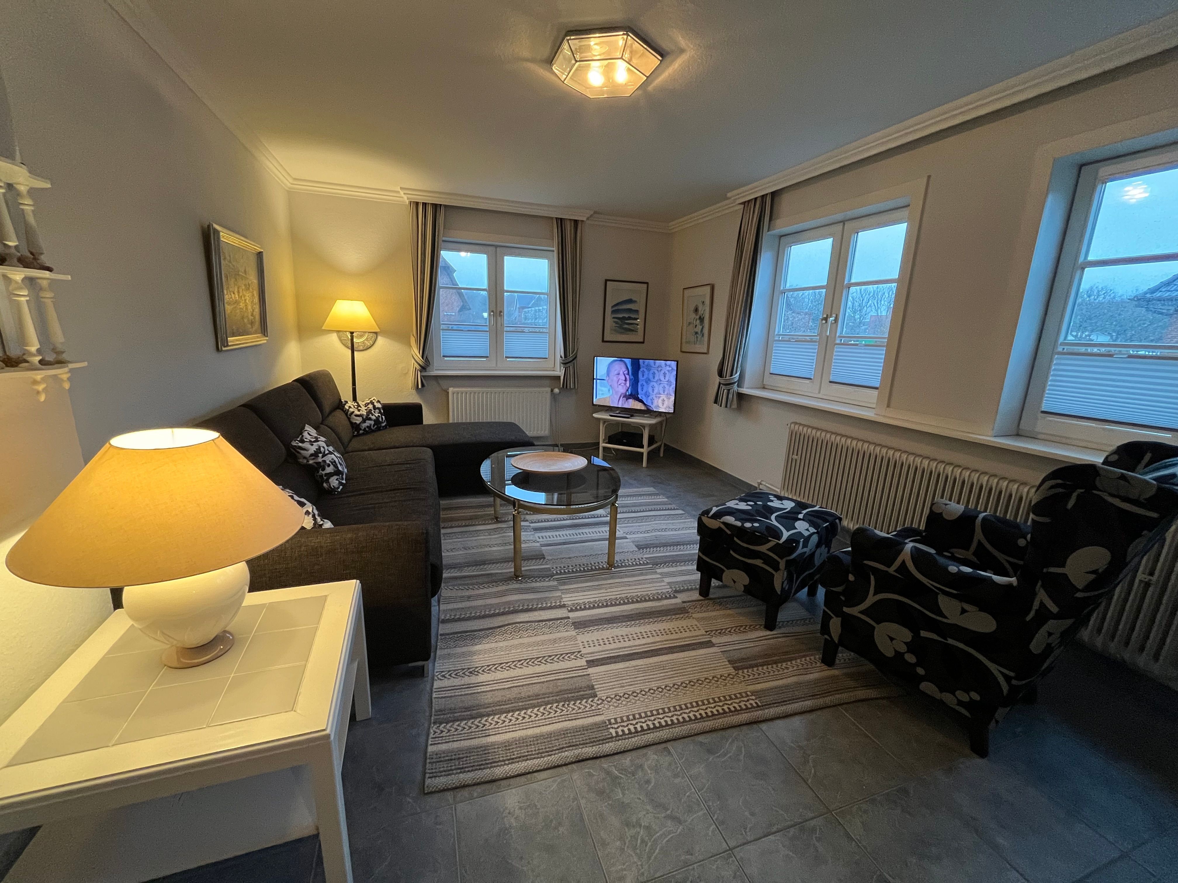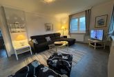 Ein Wohnzimmer mit Sitzgarnitur (bequeme Schlafcouch) und Flachbild- TV ist der Mittelpunkt der Wohnung.
