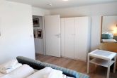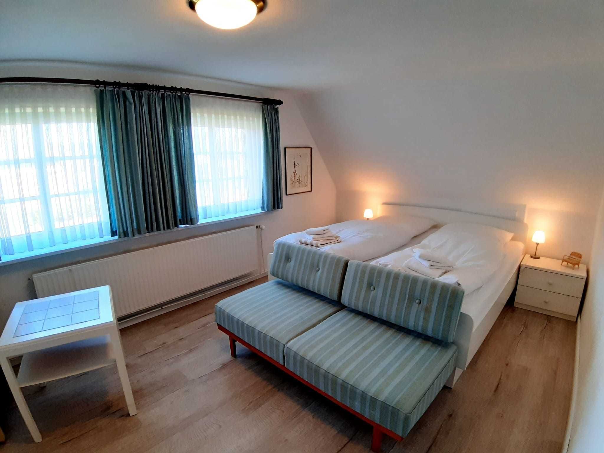 Ein Schlafzimmer mit Doppelbett 180x200m offenes Fußende, Nachttisch, Leselampen, Couch, Kleiderschrank.