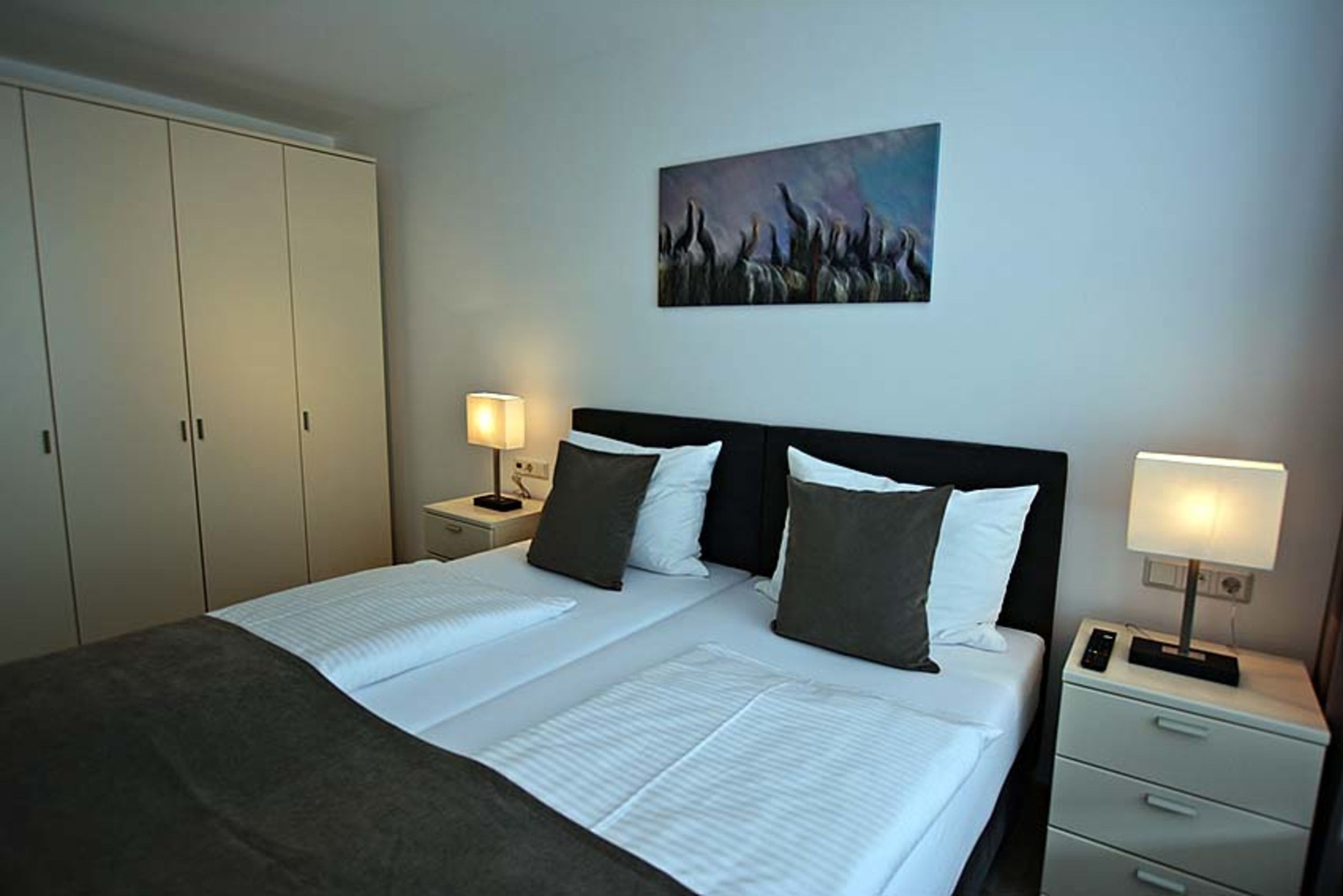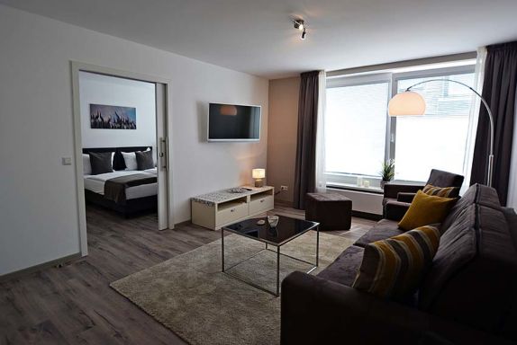 Großzügiges Komfort App. mit exclusiver Ausstattung, 52 qm groß mit Balkon. Großes Bad mit begehbarer Dusche. TV in Wohn und Schlafzimmer. Komplett eingegrichtete moderne Küche.