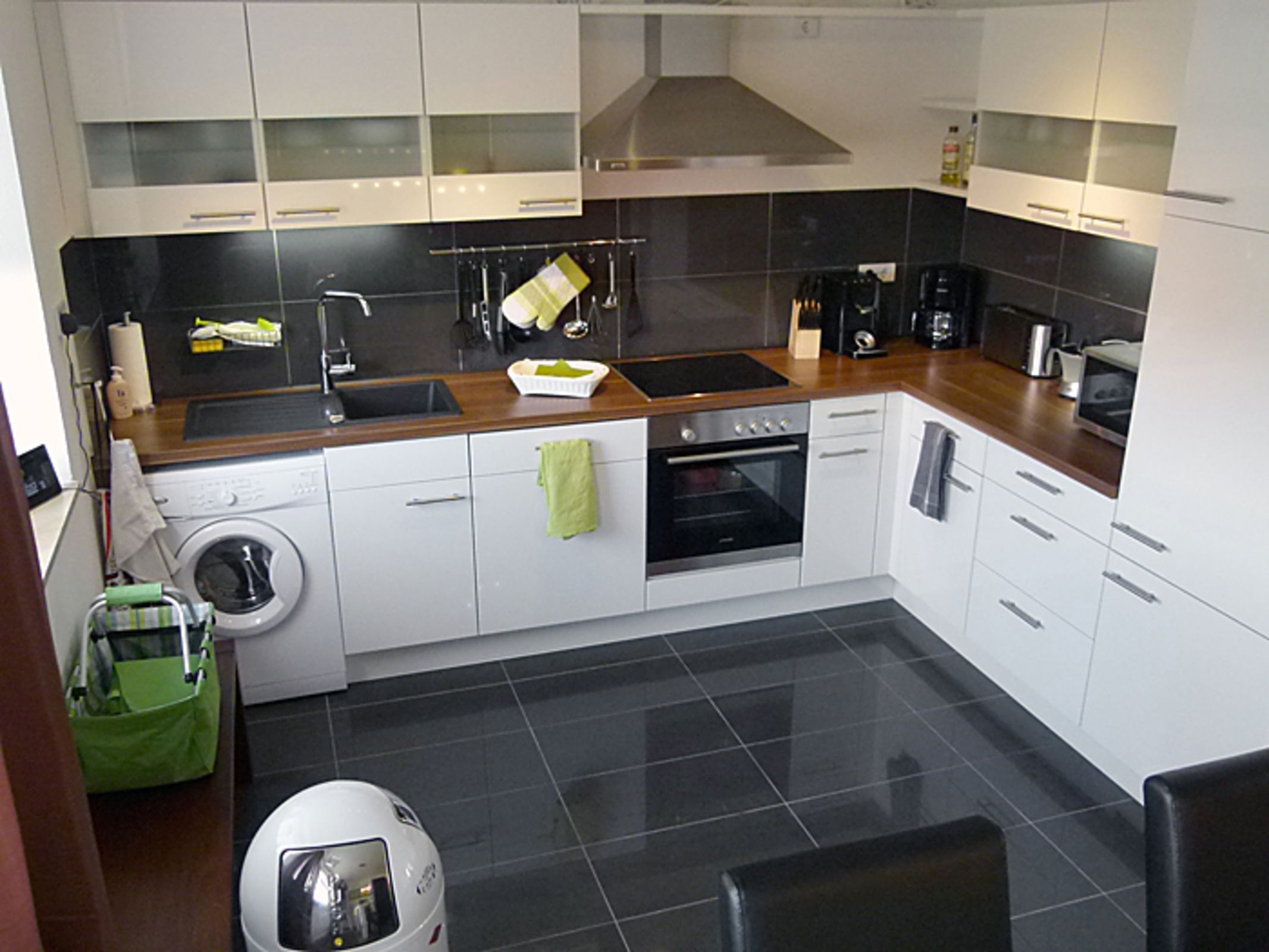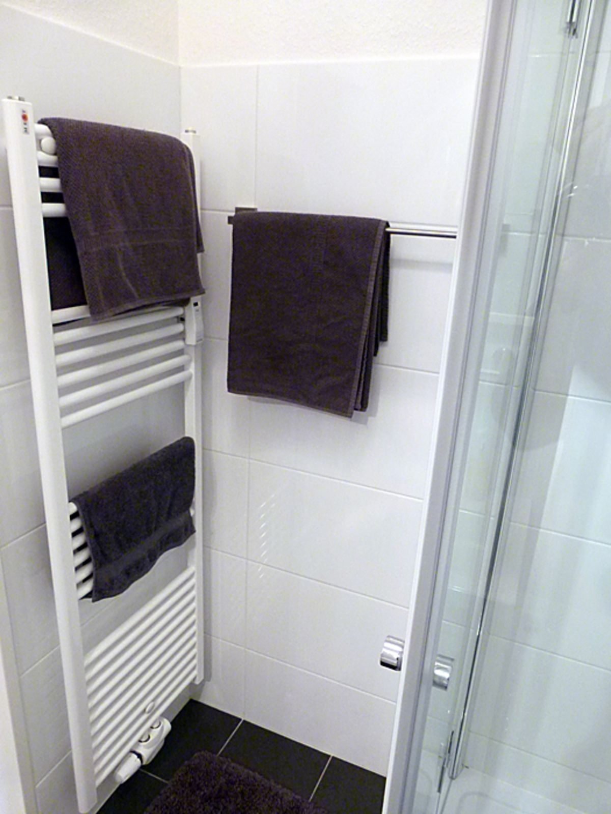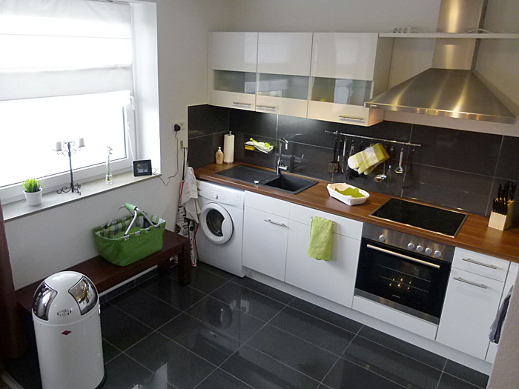 Der Eingangsflur, die Küche sowie Duschbad und separates WC sind mit hochwertigen Bodenfliesen in hochglanz-anthrazit ausgestattet. Die restlichen Bodenbeläge bestehen aus hochwertigem Laminat in Walnuss. Das Wohnzimmer lädt mit Ohrensessel und Relaxliege im Loungecharackter zum entspannten Lesen und Verweilen ein.