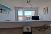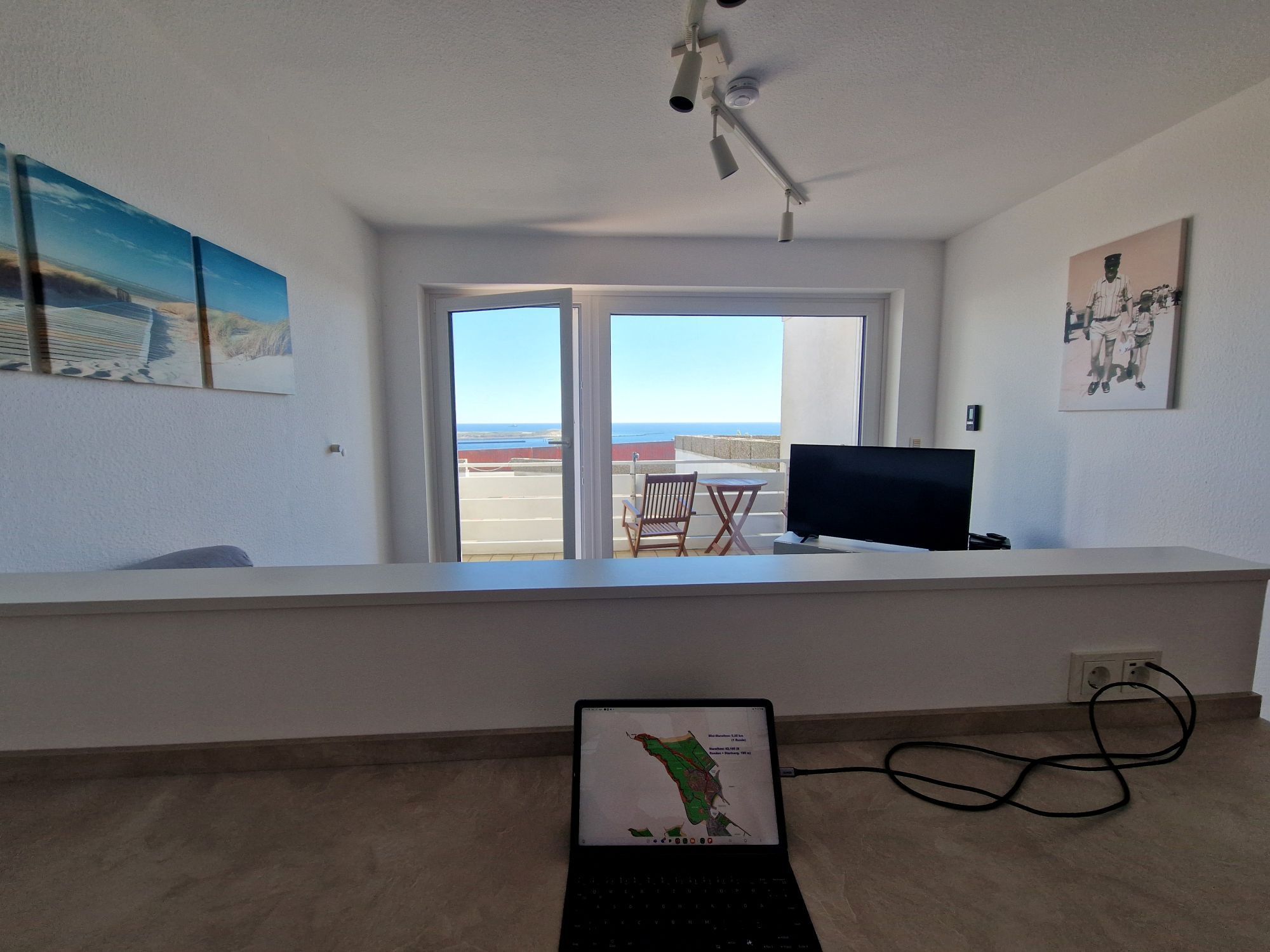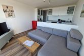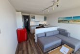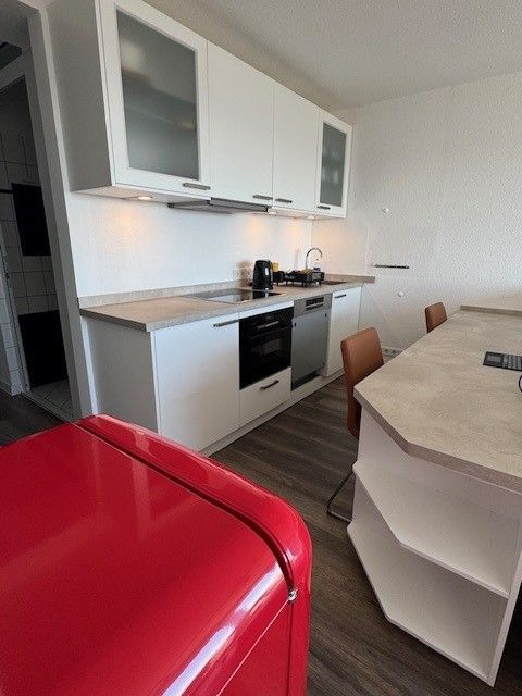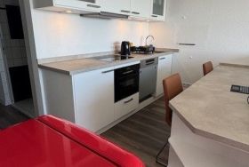 -Küchenbereich mit Geschirrspüler, Kochfeld mit 4 Platten, Backofen mit Mikrowellenfunktion, Kühlschrank mit Gefrierfach, Tresen in Tischhöhe zwischen Küchen- und Wohnbereich, als Ess- und Arbeitsplatz,
