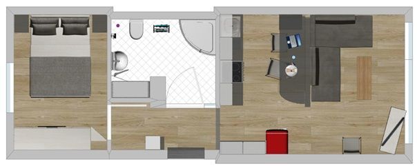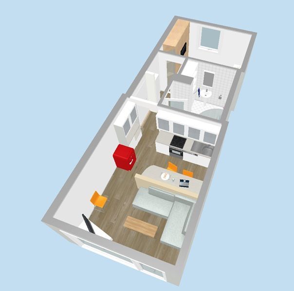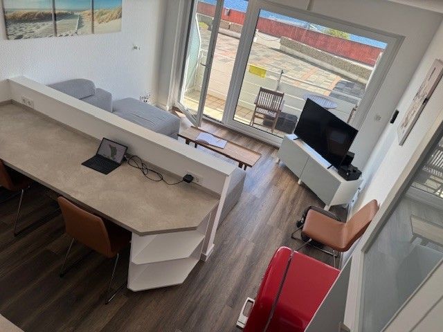 -Wohnbereich mit zwei ineinander stehenden Récamieren, Fernseher, BluRay Player und einen Stereo-Radio-Recorder,