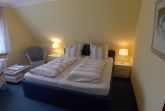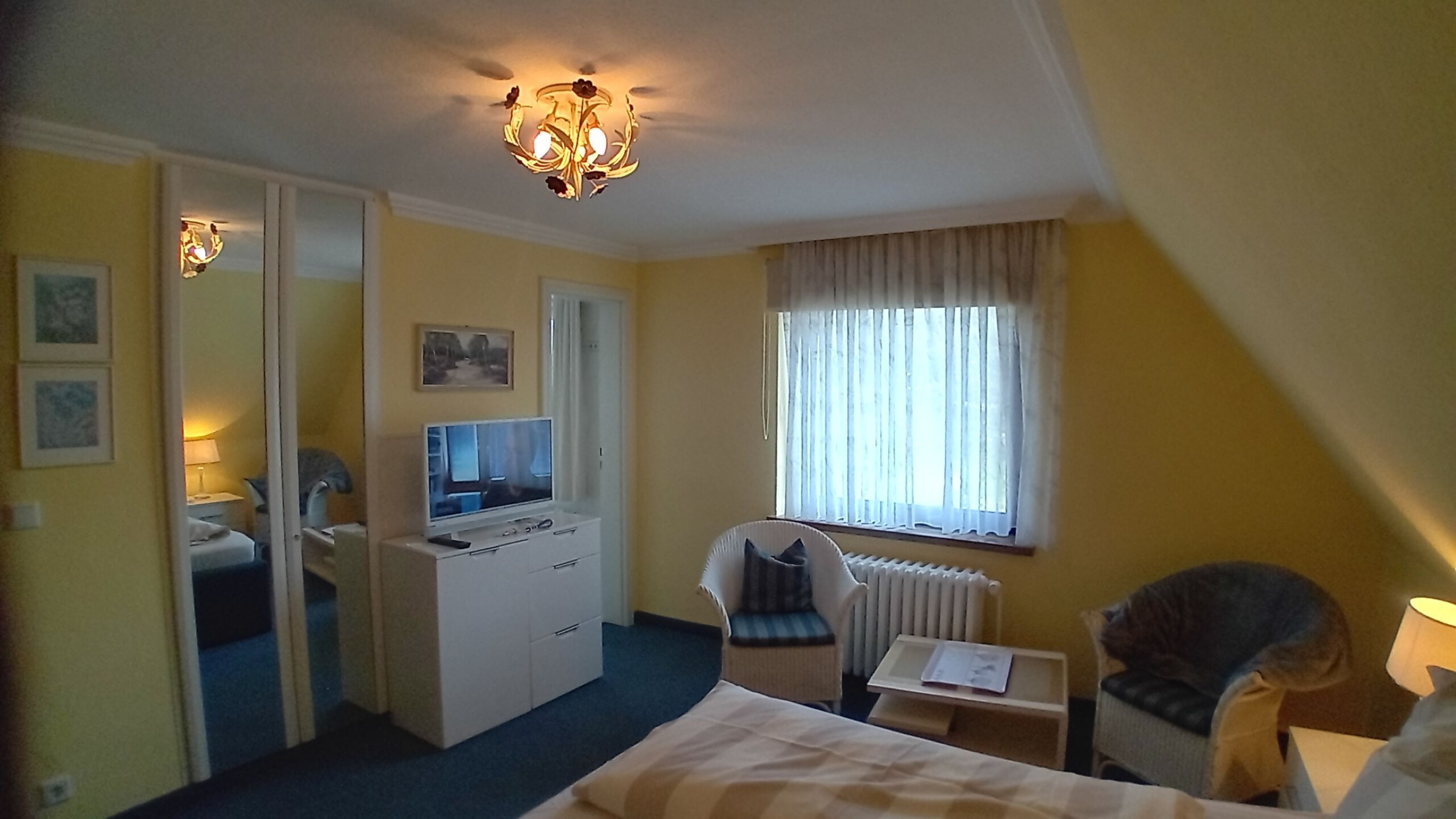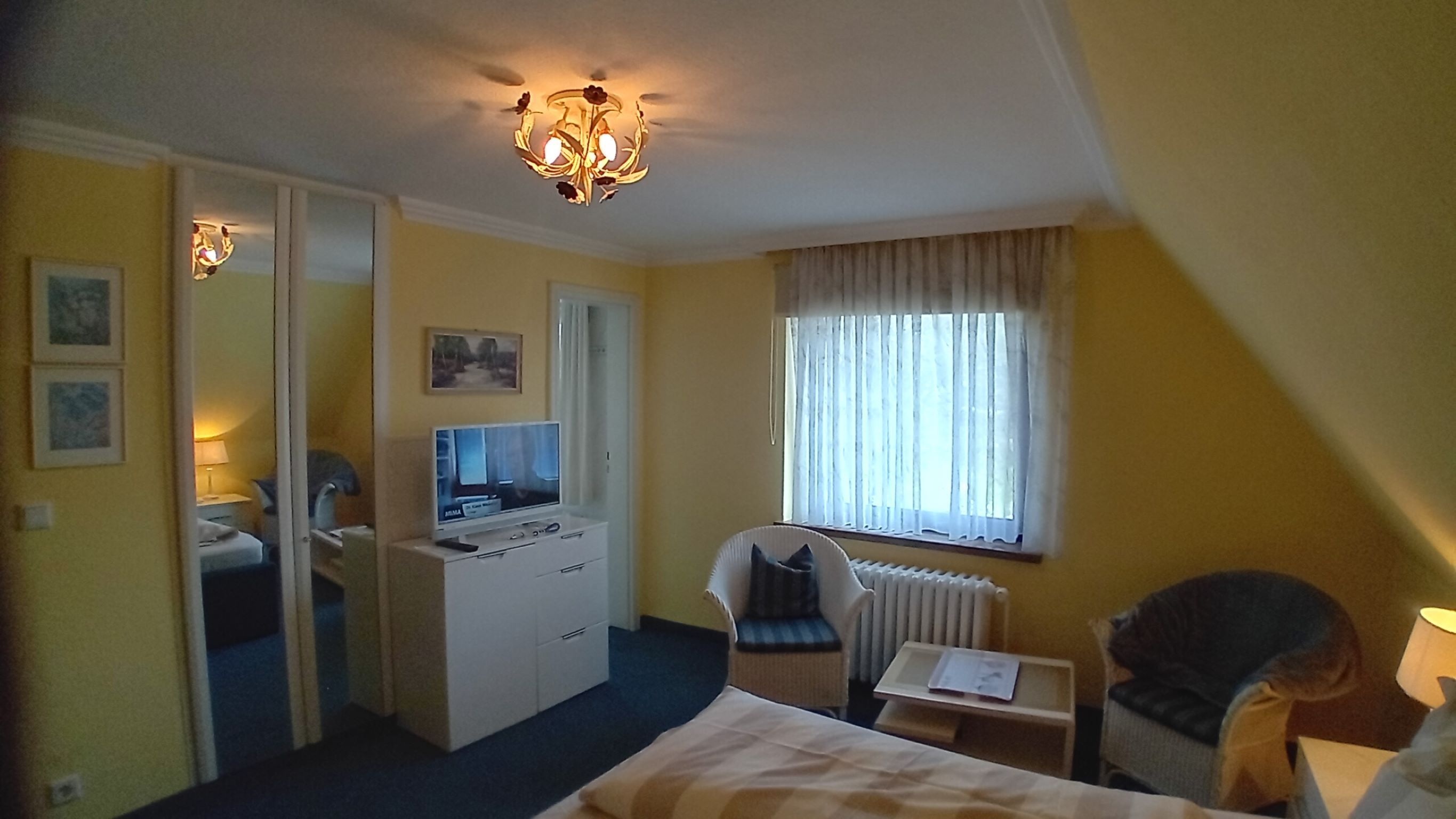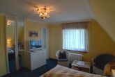 Doppelzimmer in der ersten Etage mit Dusche/WC (modern hell renoviert). Das hochwertige Doppelbett mit offenem Fußende läd zum erholsamen Schlaf ein, Kleiderschrank, Teppichboden, 2 Sessel und Tisch, Flachbild TV sind selbstverständlich. Der wundervollem Ausblick lässt Raum für Träume offen.