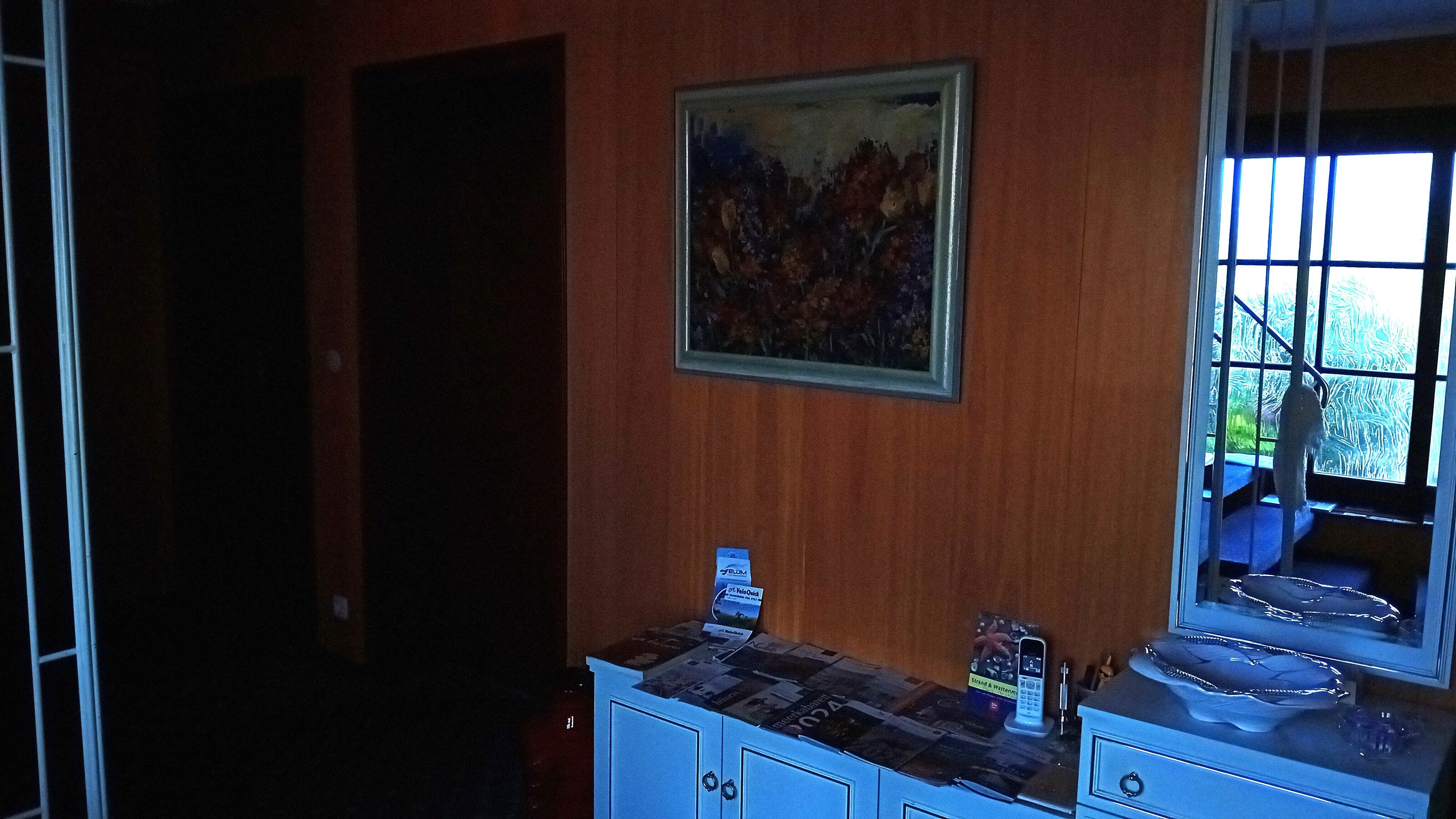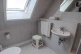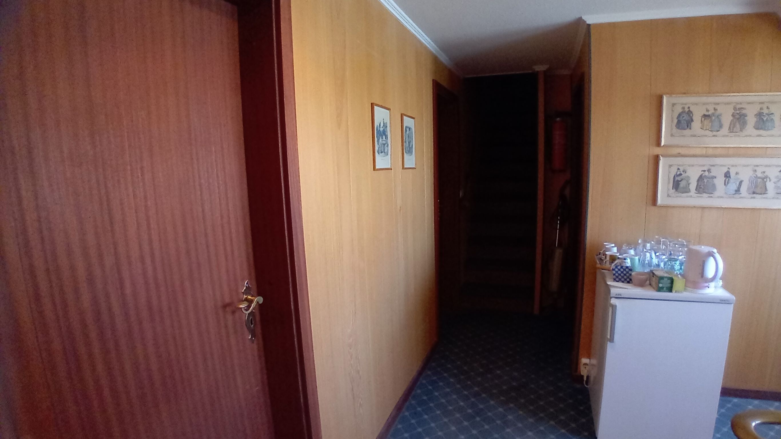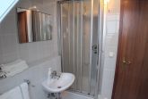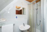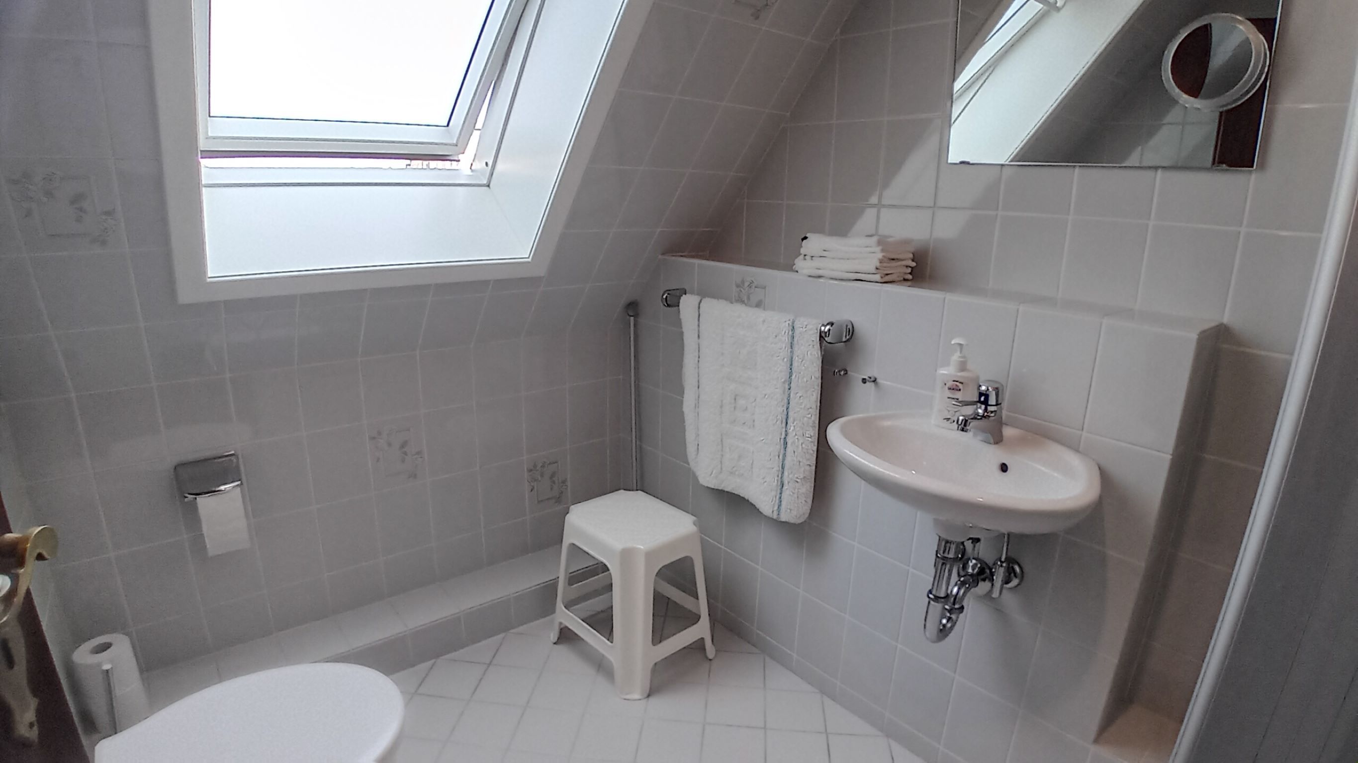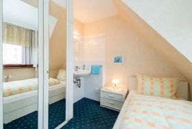 Einzelzimmer im 1.OG ist mit einem Kleiderschrank, Sessel und Tisch, Flachbild TV sowie mit einem Waschbecken ausgestattet. Das Badezimmer befindet sich nur wenige Schritte vom Zimmer auf der Etage entfernt, Sie nutzen es mit einer weiteren Person aus dem 2. Einzelzimmer.