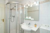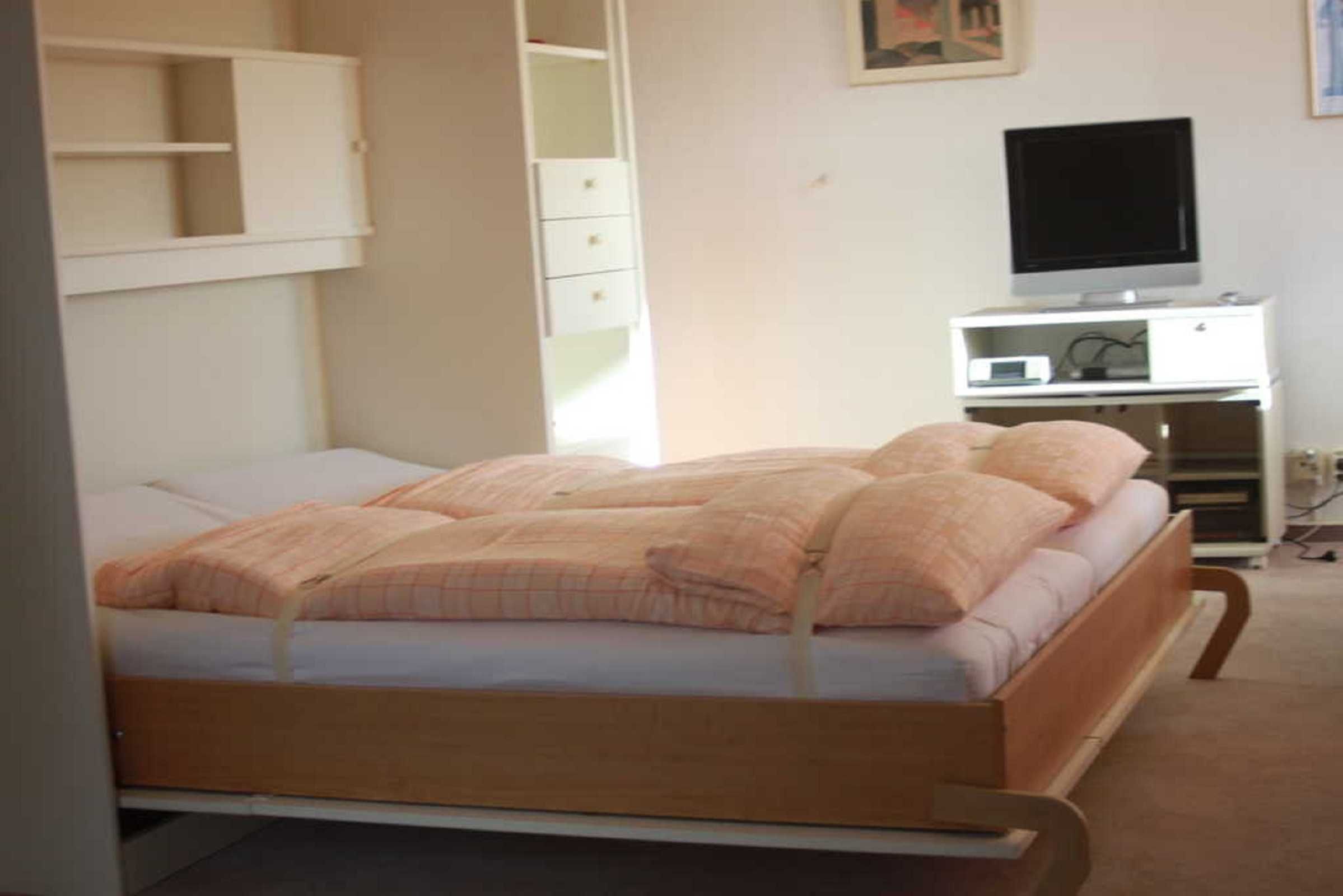 Appartement im Obergeschoss für 2 Personen. Geräumiges Wohn-Esszimmer mit Doppel-Schrankbett, Essecke, Sitzgarnitur, Flachbild TV. Separate Küche mit 2 Plattenkochherd, Kühlschrank mit Gefrierfach, Mikrowelle, Kaffeemaschine, Toaster, Wasserkocher, Geschirr und Töpfe. Badezimmer mit Dusche, WC, Waschbecken, Handtuchtrockner und Fön.