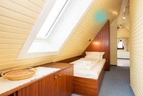 Das 1 Zimmerappartement befindet sich im Dachgeschoss. Hier haben Sie die gesamte Etage für sich allein. Ausgestattet für 2 Personen mit zwei getrennt stehenden Betten (90x190cm), 2 Korbsesseln und Tisch, Flachbild TV. Eine separate Küche mit Essgelegenheit, einem 2 Plattenkochherd, Kühlschrank mit Gefrierfach, Mikrowelle, Kaffeemaschine, Geschirr und Töpfe. Ein kleines Badezimmer mit Dusche/WC steht Ihnen zur Verfügung.