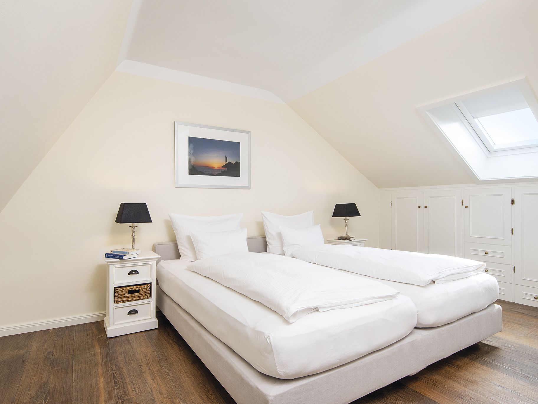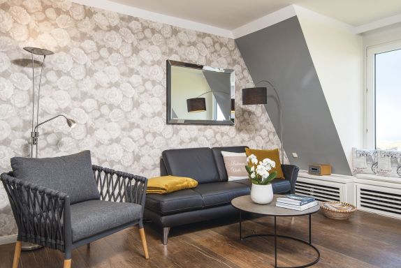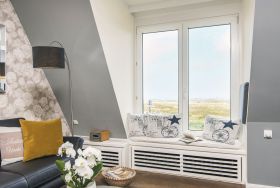 Ein Traumblick gleich über beide Meere bis zum Quermarkenfeuer und weiter hoch in den Norden über das Wattenmeer nach List bietet sich aus dem tiefen, von Sitzkissen gesäumten Panoramafenster des Wohnzimmers. Der große Vorzug des Appartementhauses Kampbarg ist seine Lage in der Kurhausstraße, im Herzen des renommierten Dorfes. Die Wohnung Nummer 36 liegt im ersten Stock und ist hochwertig, modern und originell eingerichtet. Neben dem Wohnzimmer befindet sich auf dieser Ebene zudem eine kleine separate Küche und ein Duschwannenbad unter der Schräge. Eine schmale Treppe führt hinauf in das behagliche und hochwertig eingerichtete Doppelschlafzimmer und hat einen traumhaften Blick durch das Dachfenster in den Sternenhimmel.
