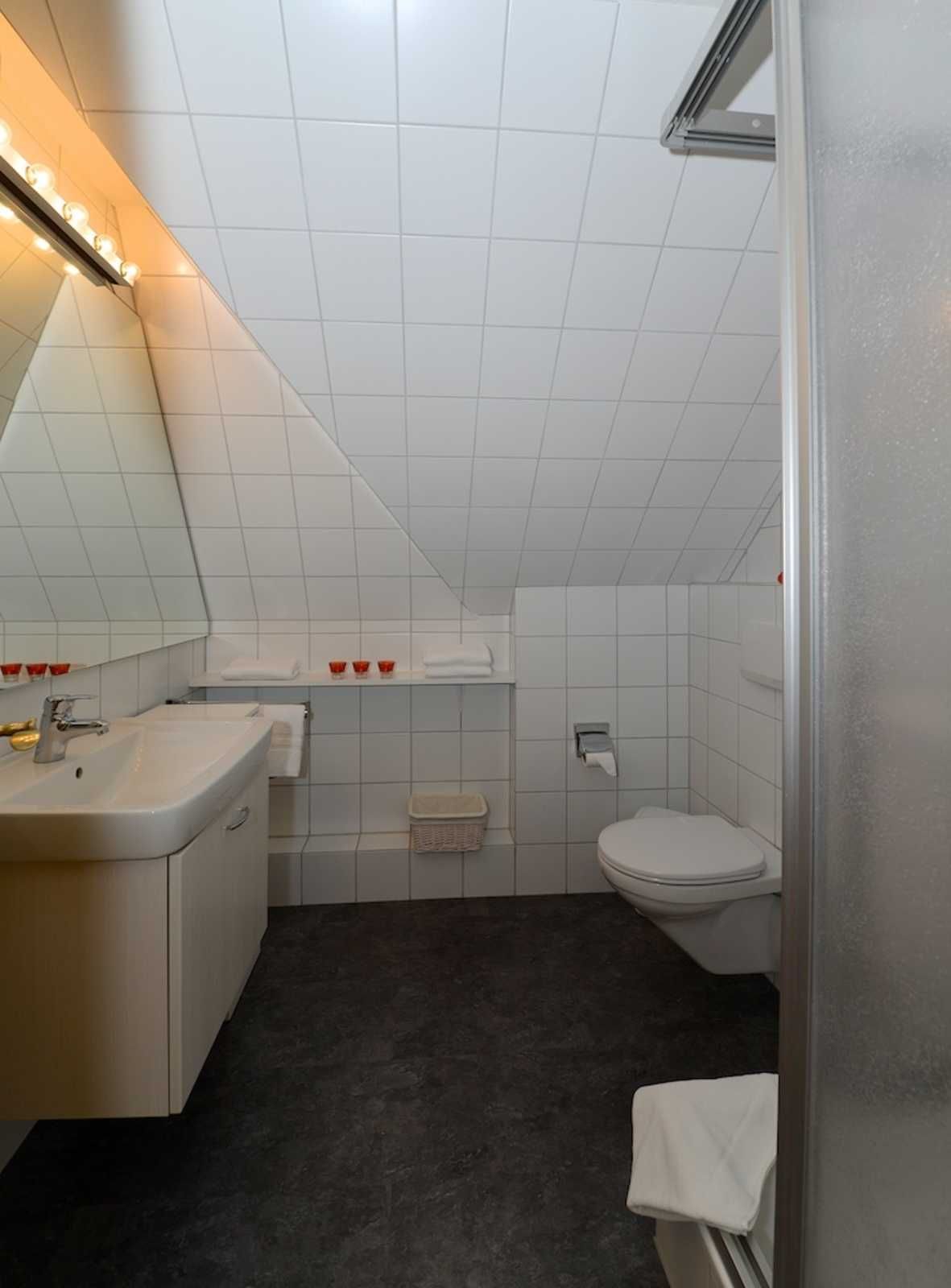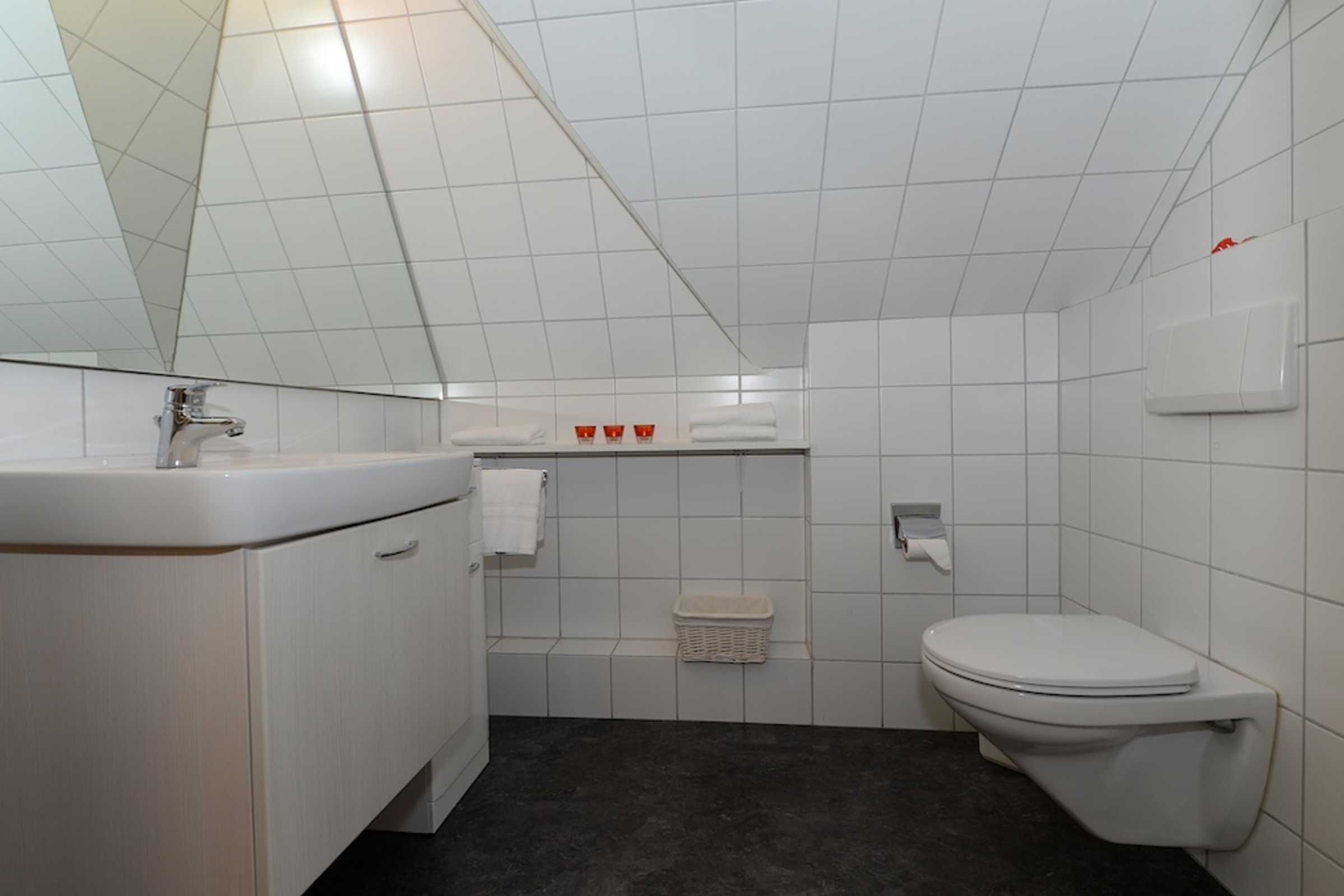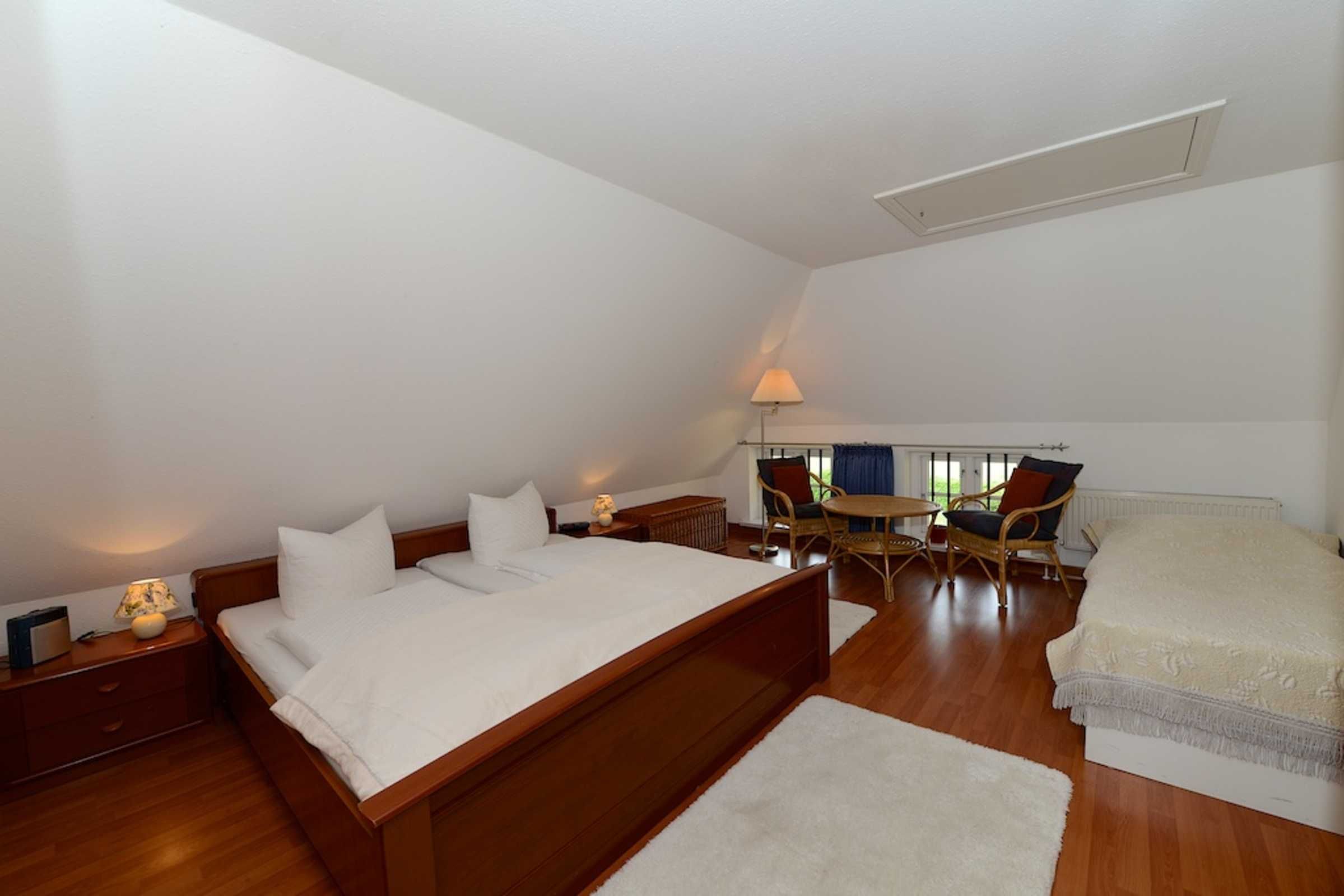 Im Obergeschoss befindet sich das Duschbad und das Schlafzimmer mit Doppelbett (Boxspring) und einem Einzelbett.