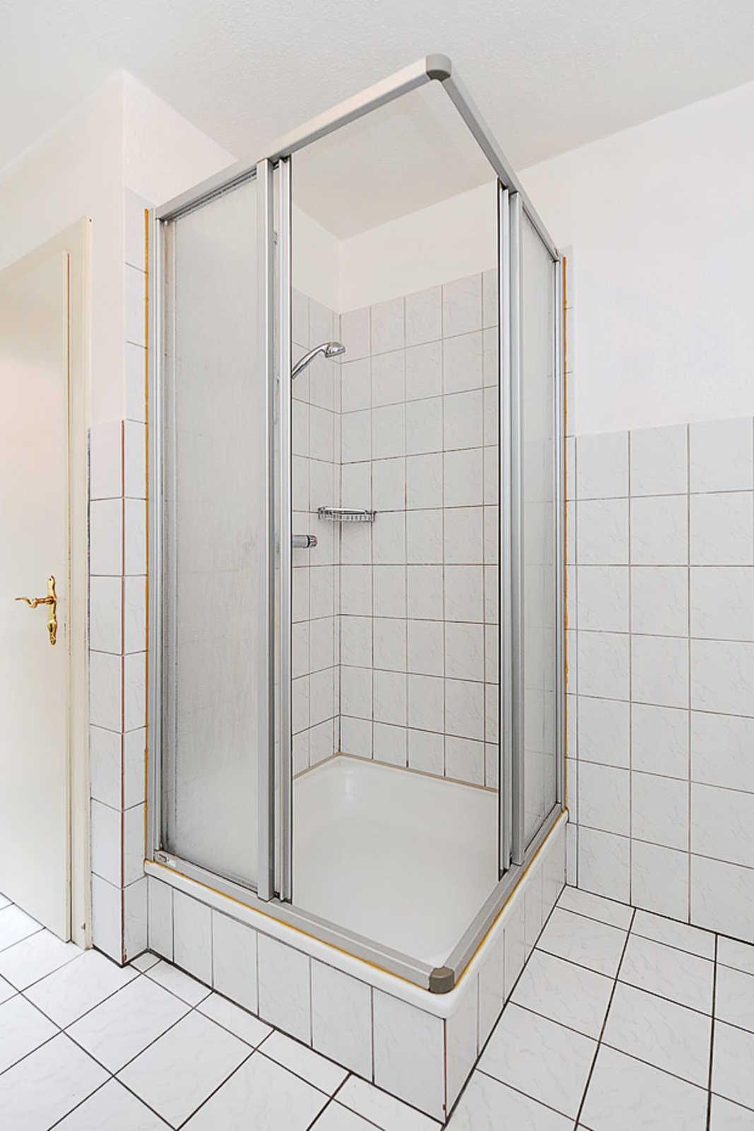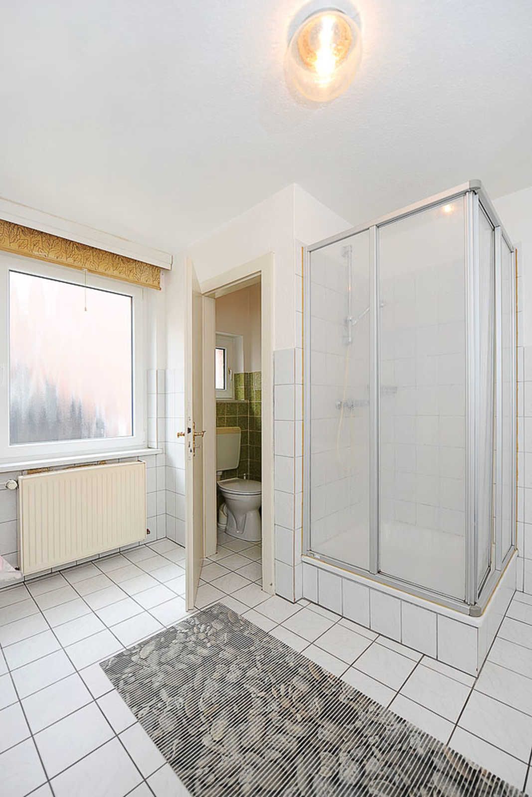 Badezimmer mit Dusche, Waschtisch und WC