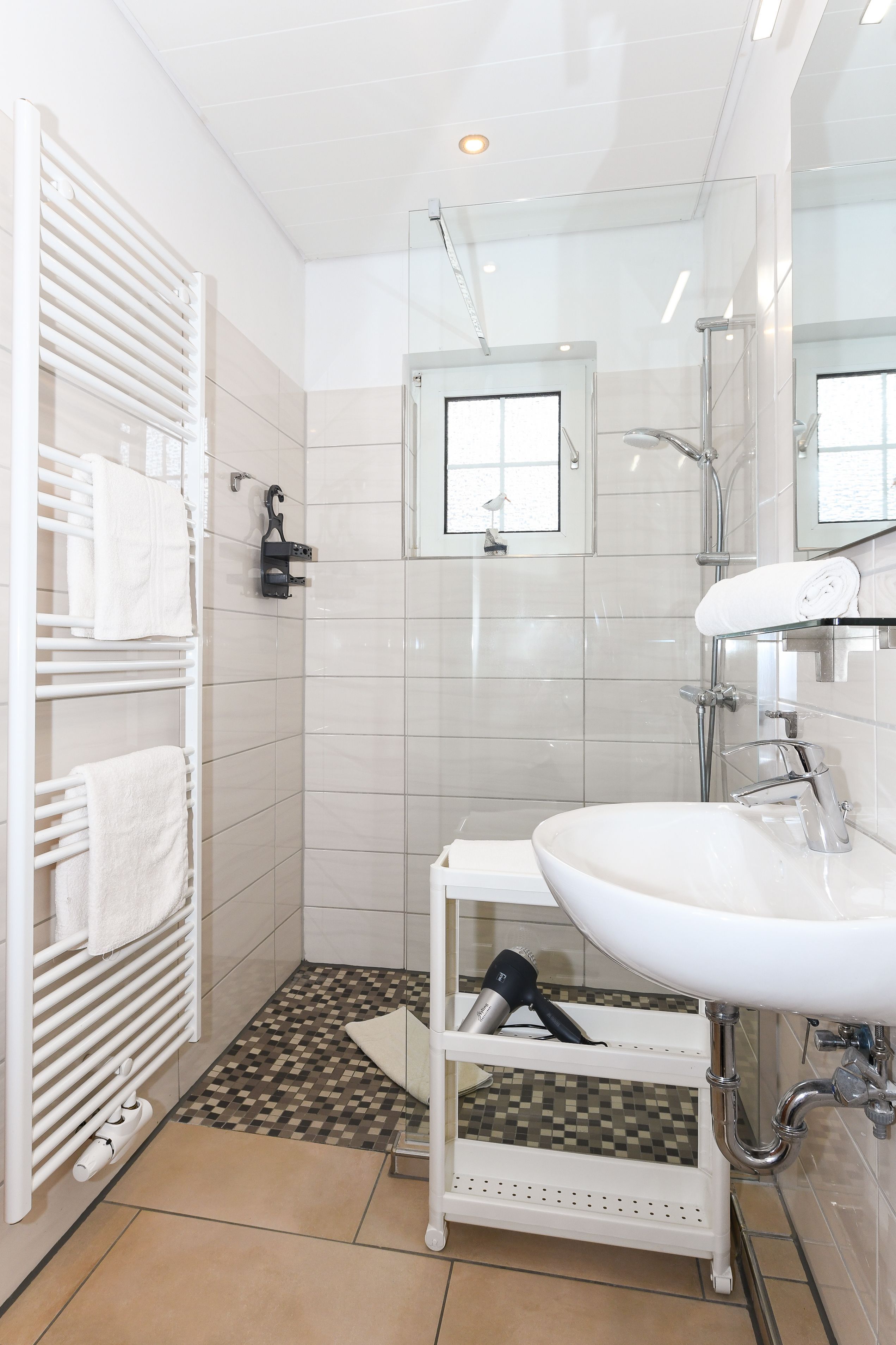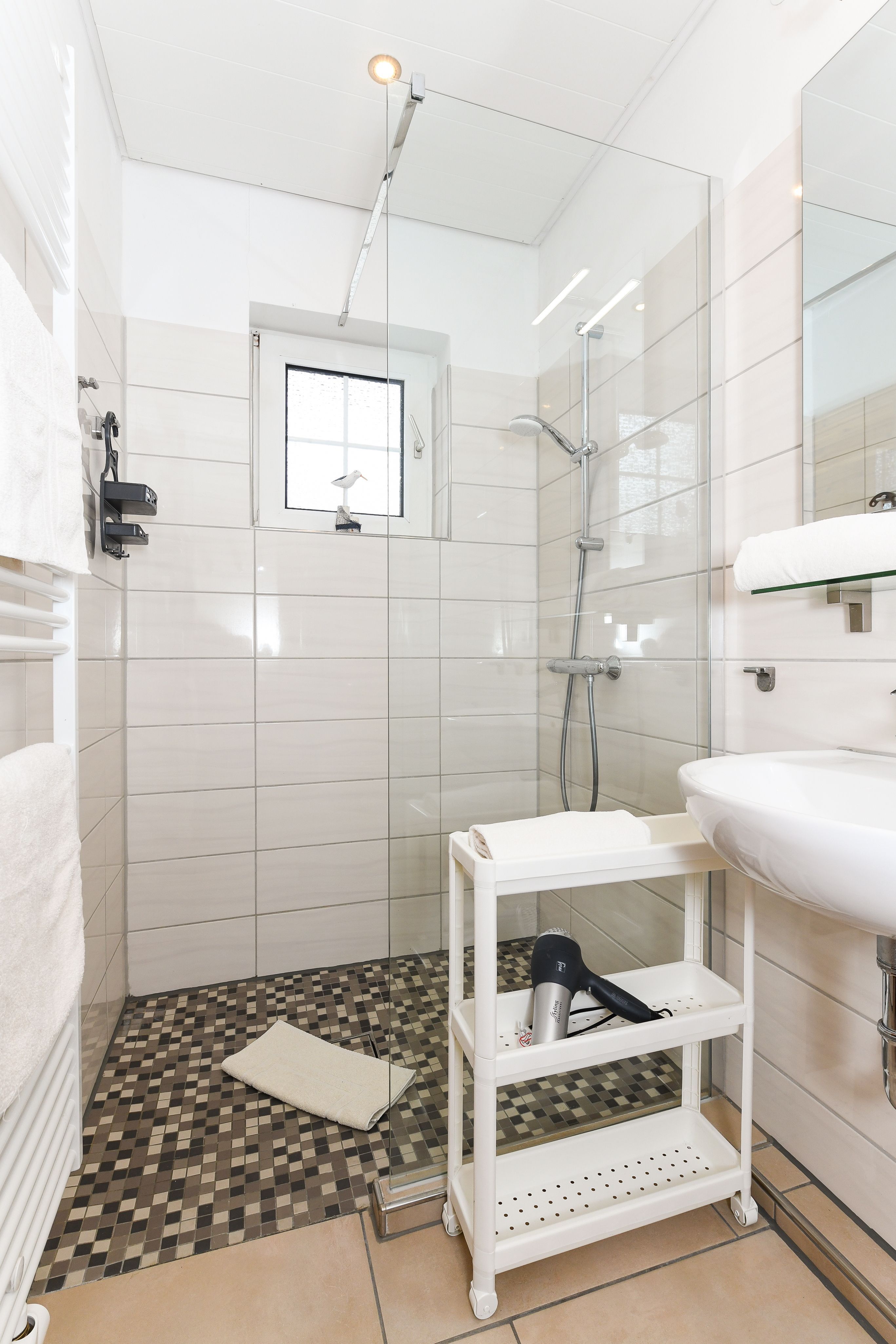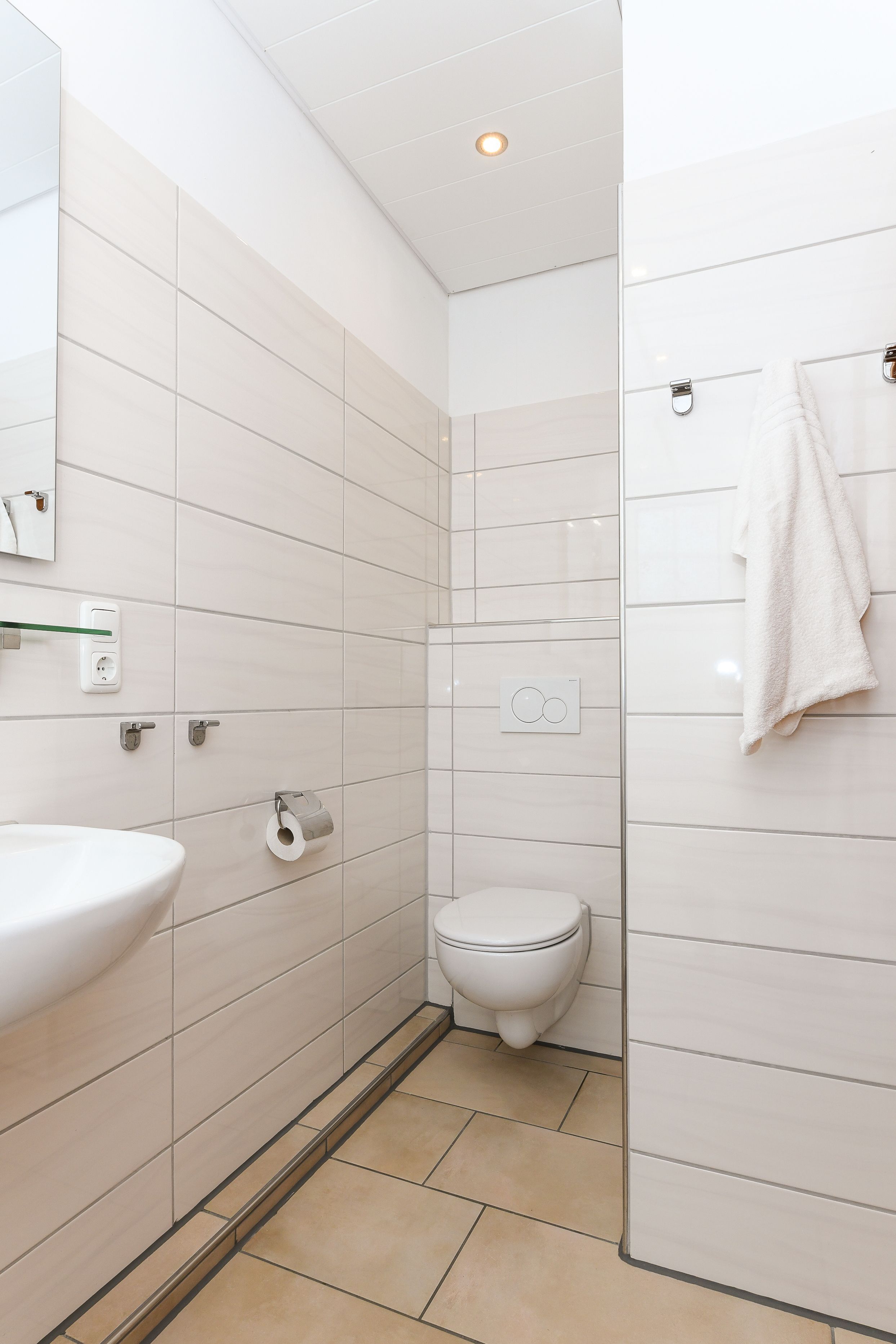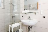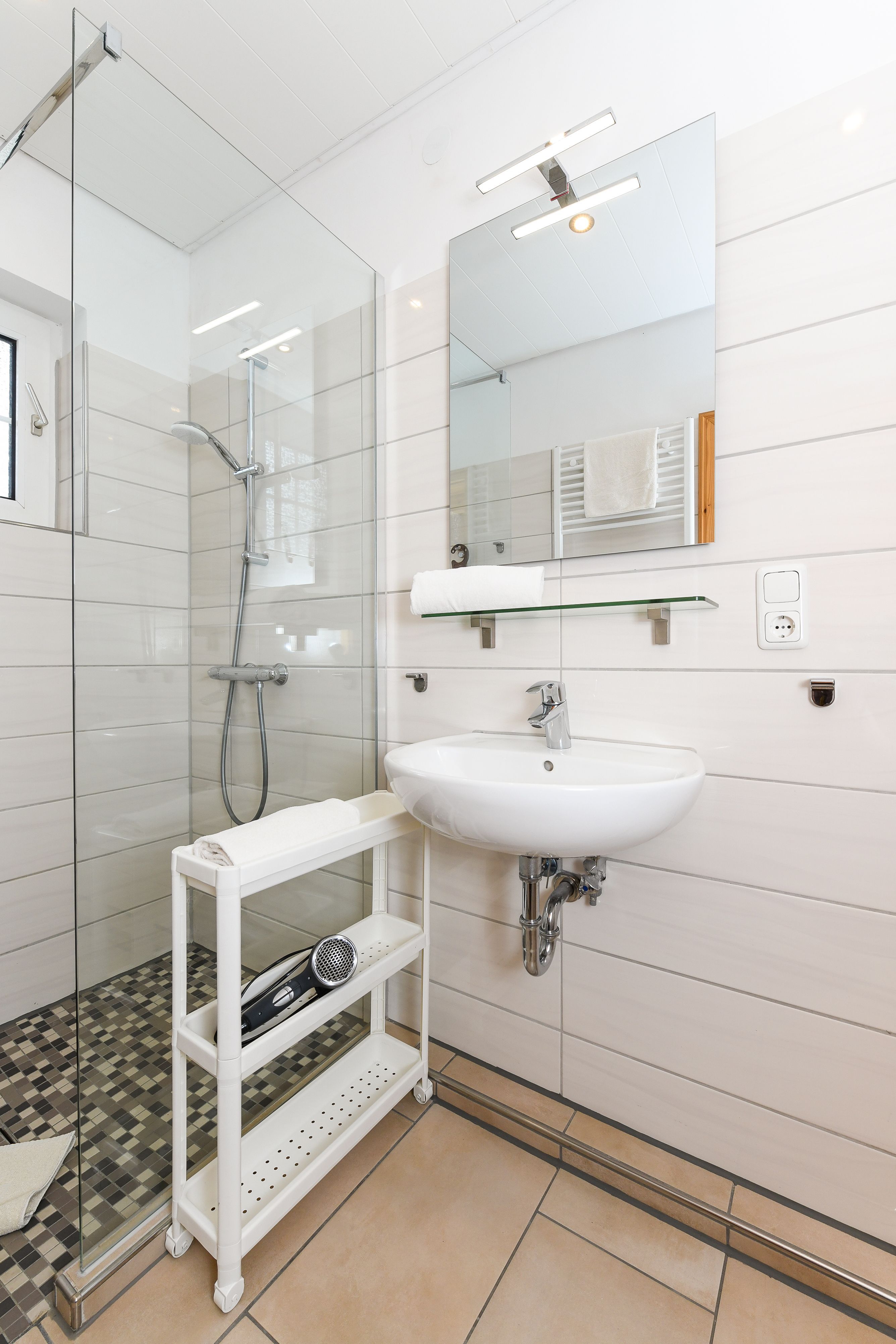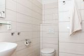 Badezimmer mit Dusche, Waschtisch und WC