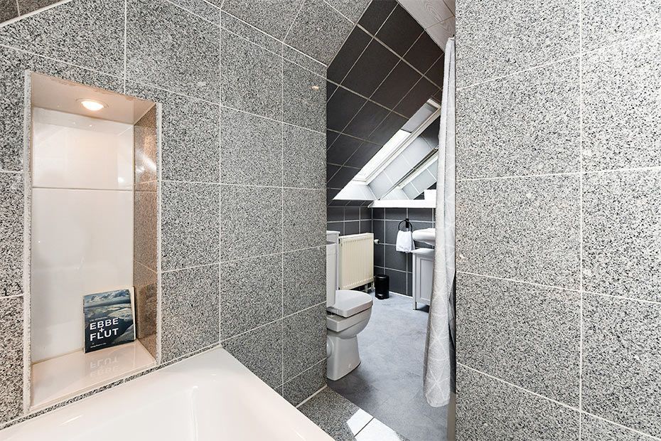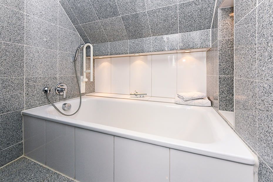 Badezimmer mit Badewanne, Dusche, Waschtisch und WC