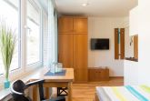 In dem Wohn - Schlafraum befindet sich ein moderner Flachbild - Fernseher.