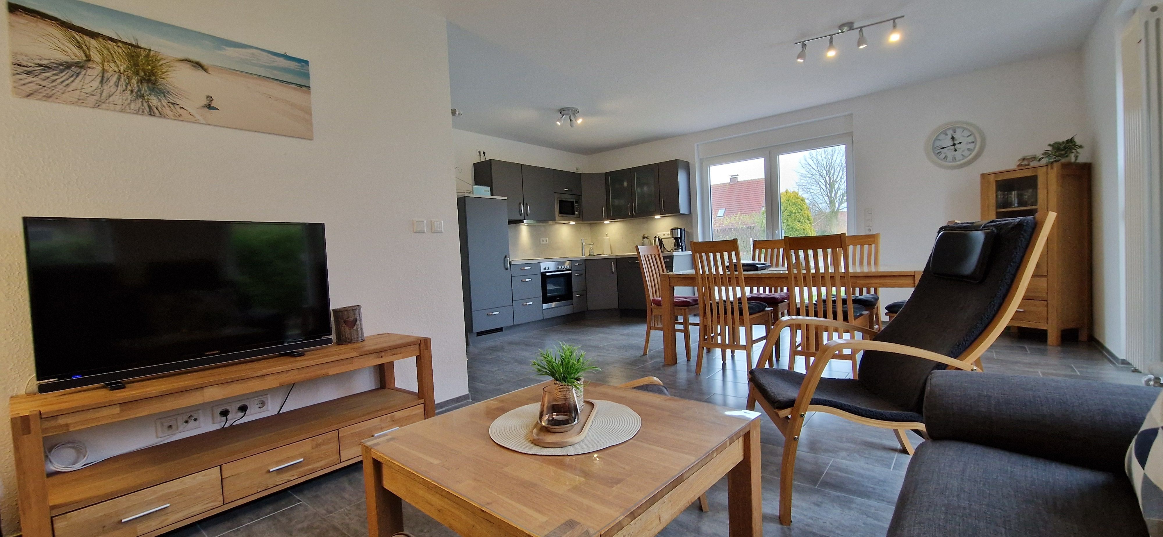 Diese neuwertige Doppelhaushälfte bietet Ihnen höchsten Komfort. Im Erdgeschoss befinden sind ein großzügiger und freundlicher Bereich für Kochen, Essen und Wohnen, sowie ein Badezimmer mit bodengleicher Dusche. Das Obergeschoss verfügt über drei Schlafzimmer mit Fliegenschutz an den Fenstern (1x Doppelbett, 1x 1,40m-Bett, 1x2 Einzelbetten) und ein großzügiges 2. Bad mit Badewanne und bodengleicher Dusche. Alle Fenster sind mit Rollläden, die Böden mit Fliesen bzw. Laminat ausgestattet. WLAN steht Ihnen kostenlos zur Verfügung. Eine hochwertige Ausführung und attraktive Ausstrahlung sorgen für entsprechende Wohnqualität.