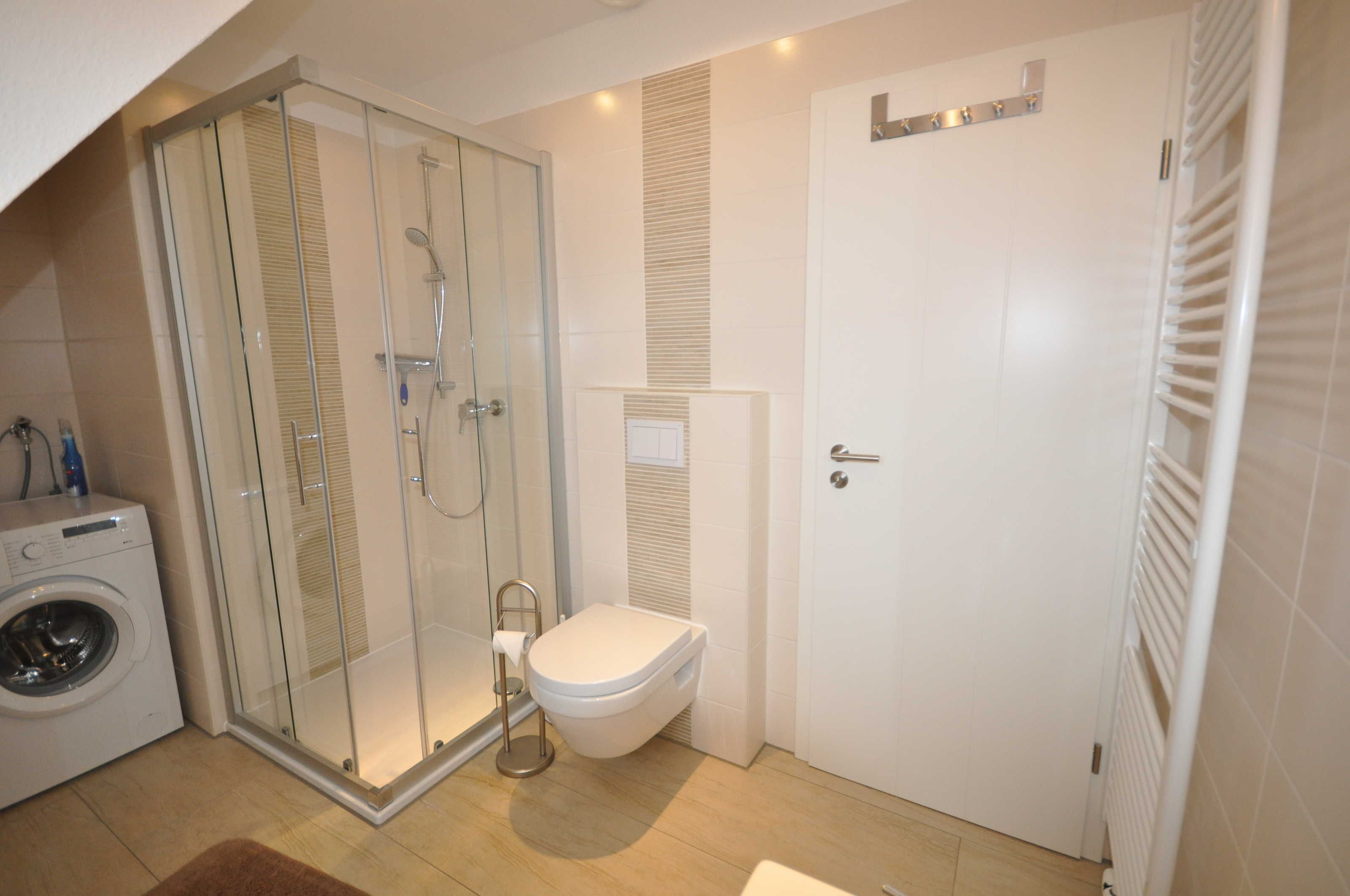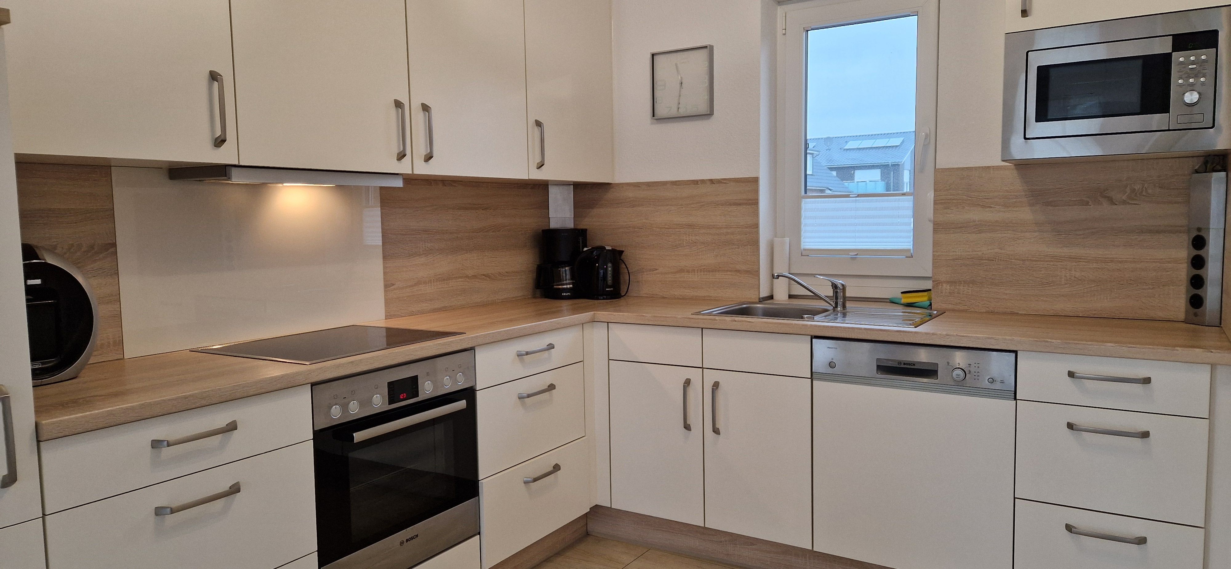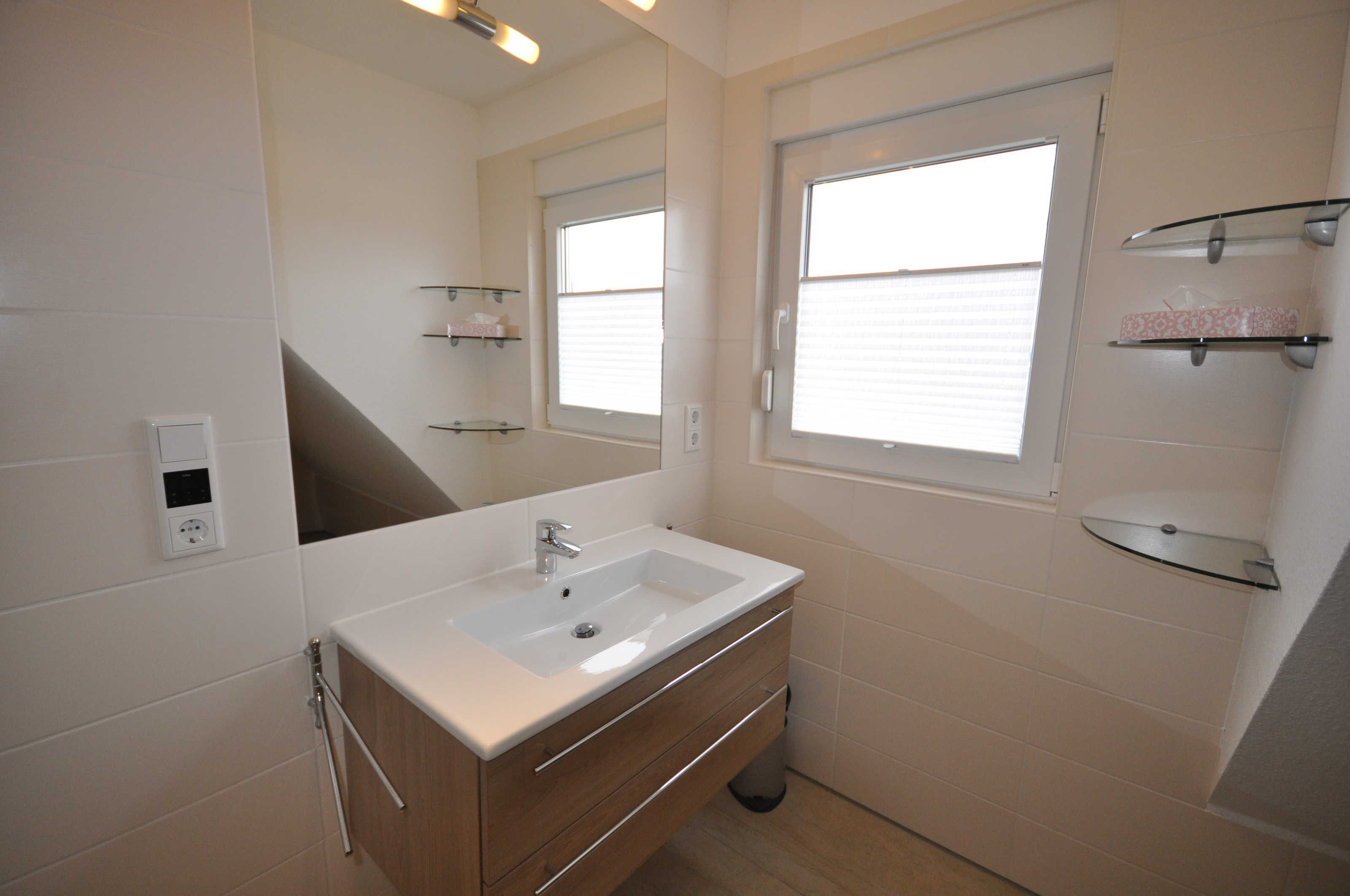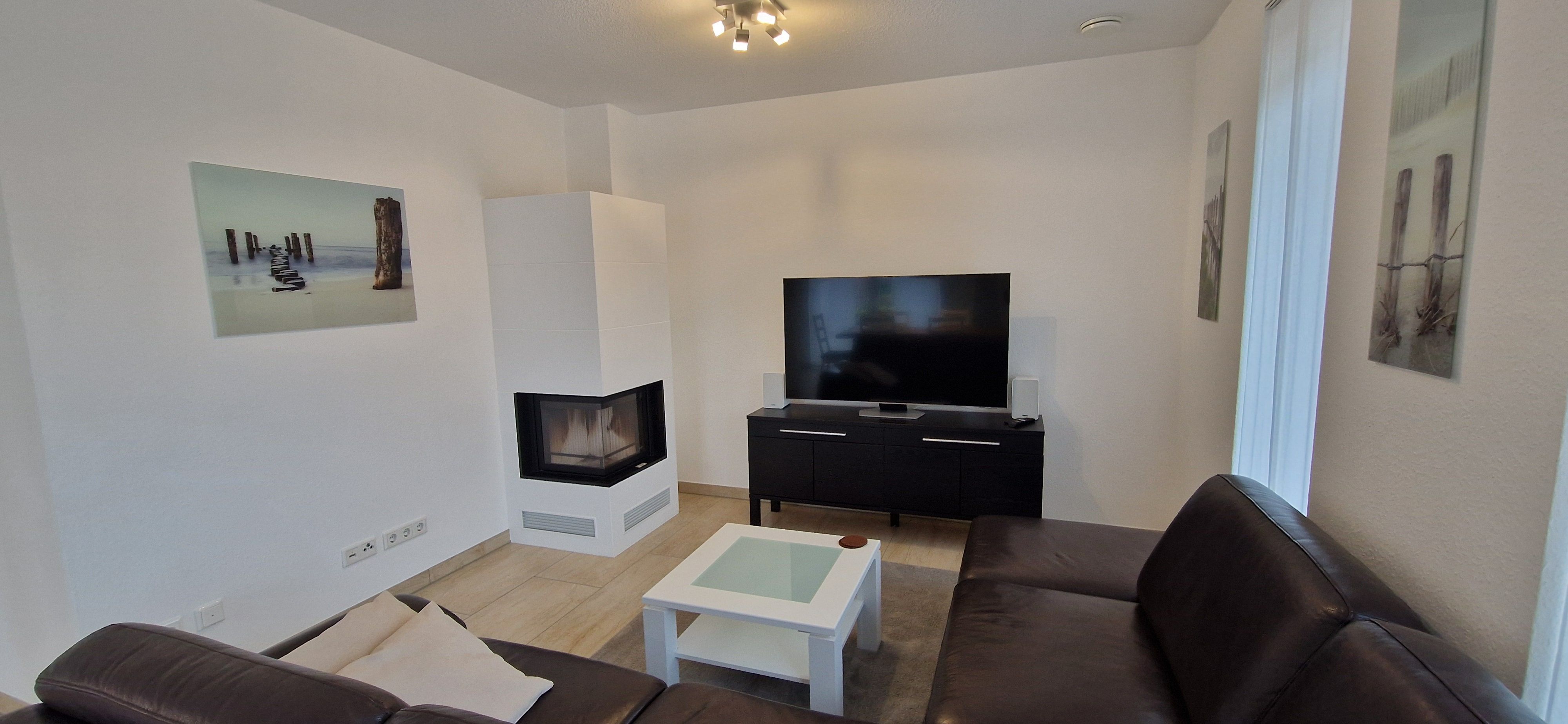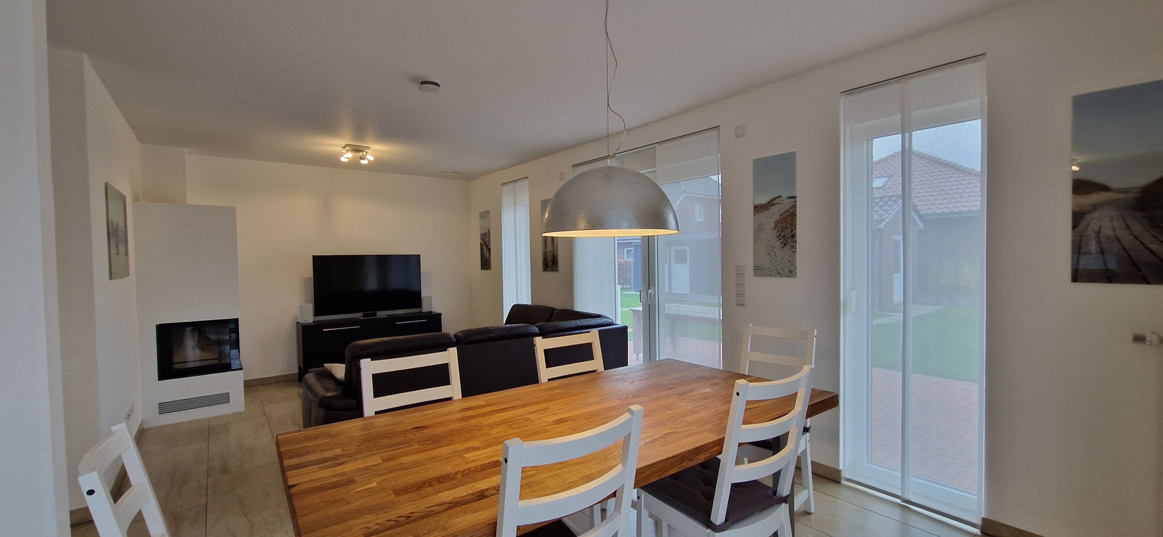 Im Erdgeschoss der 80m² großen Doppelhaushälfte befindet sich ein großzügiger und freundlicher Bereich für Kochen, Essen und Wohnen. Zudem ist ein Gäste-WC vorhanden. Das Obergeschoss verfügt über drei Schlafzimmer (ein Doppelbett, ein 1,40m-Bett und zwei Einzelbetten) sowie über ein großzügiges Duschbad und bietet somit ausreichend Platz für die ganze Familie. WLAN kann kostenlos genutzt werden. Das Ferienhaus verfügt außerdem über eine Lüftungsanlage. Alle Fenster sind mit Rollläden, teilweise mit Fliegenschutzgittern ausgestattet. Im gesamten Objekt sind Fliesen bzw. Laminat verlegt. Eine hochwertige Ausstattung sorgt für entsprechenden Wohnkomfort. Aufgrund der installierten Lüftungsanlage steht der Kamin leider nicht zur Nutzung bereit.