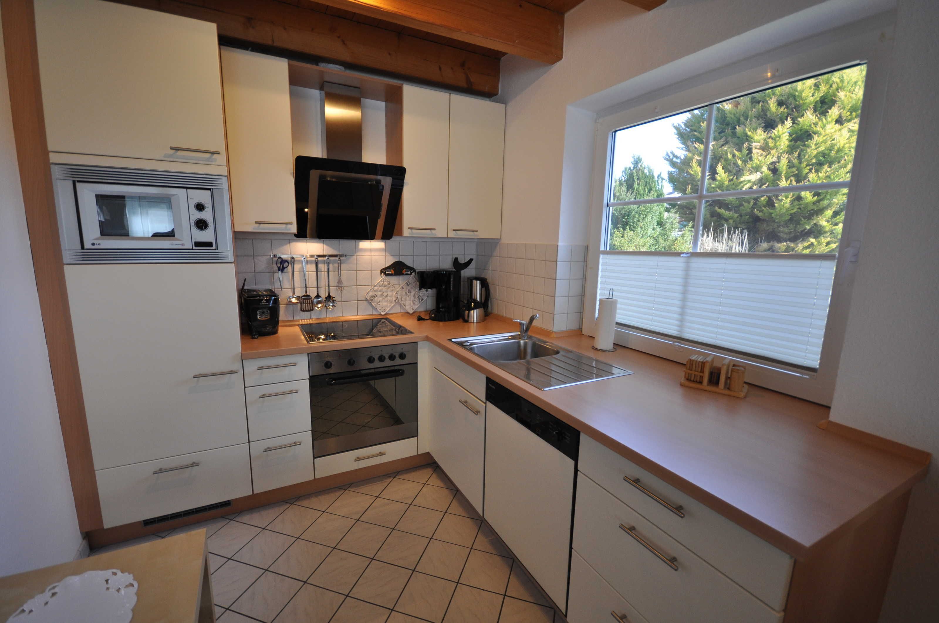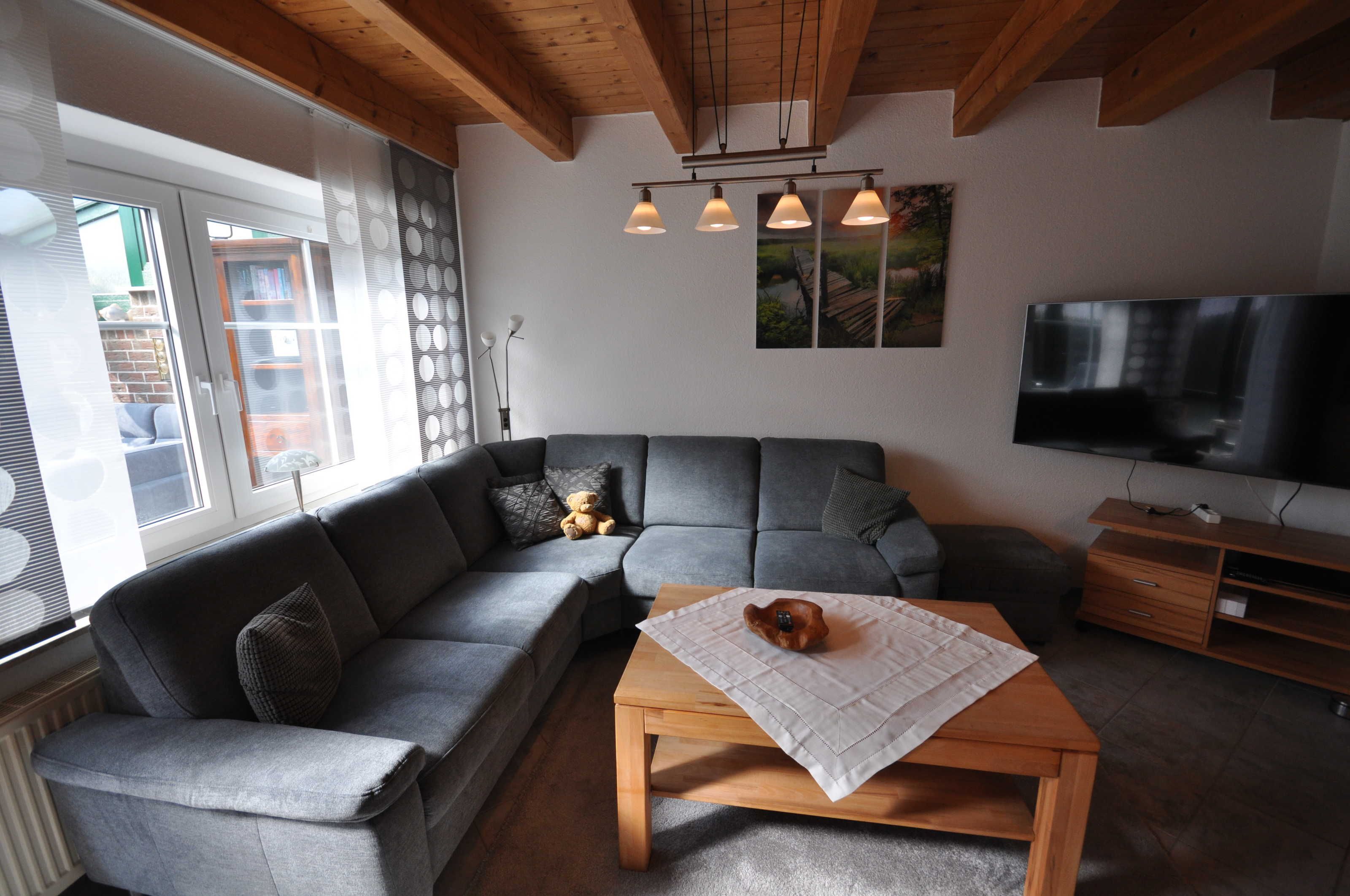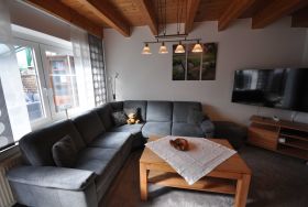 Das Erdgeschoss der geräumigen Doppelhaushälfte verfügt über einen großzügigen Wohnraum mit Essbereich und einer modernen Wohnküche. Ein Wintergarten bietet eine zusätzliche Möglichkeit zum Verweilen. Vom Flur aus erreichen Sie ein Duschbad. Eine geschlossene Holztreppe führt ins Obergeschoss mit drei Schlafzimmern (ein Schlafzimmer mit einem Doppelbett, ein Schlafzimmer mit einem Einzelbett (1,40m), ein Schlafzimmer mit zwei Einzelbetten) und einem weiteren Badezimmer mit Dusche. Alle Fenster im OG sind mit Rollläden, die Böden im gesamten Haus mit Fliesen bzw. Laminat ausgestattet. In diesem Ferienhaus ist derzeit leider kein WLAN vorhanden.