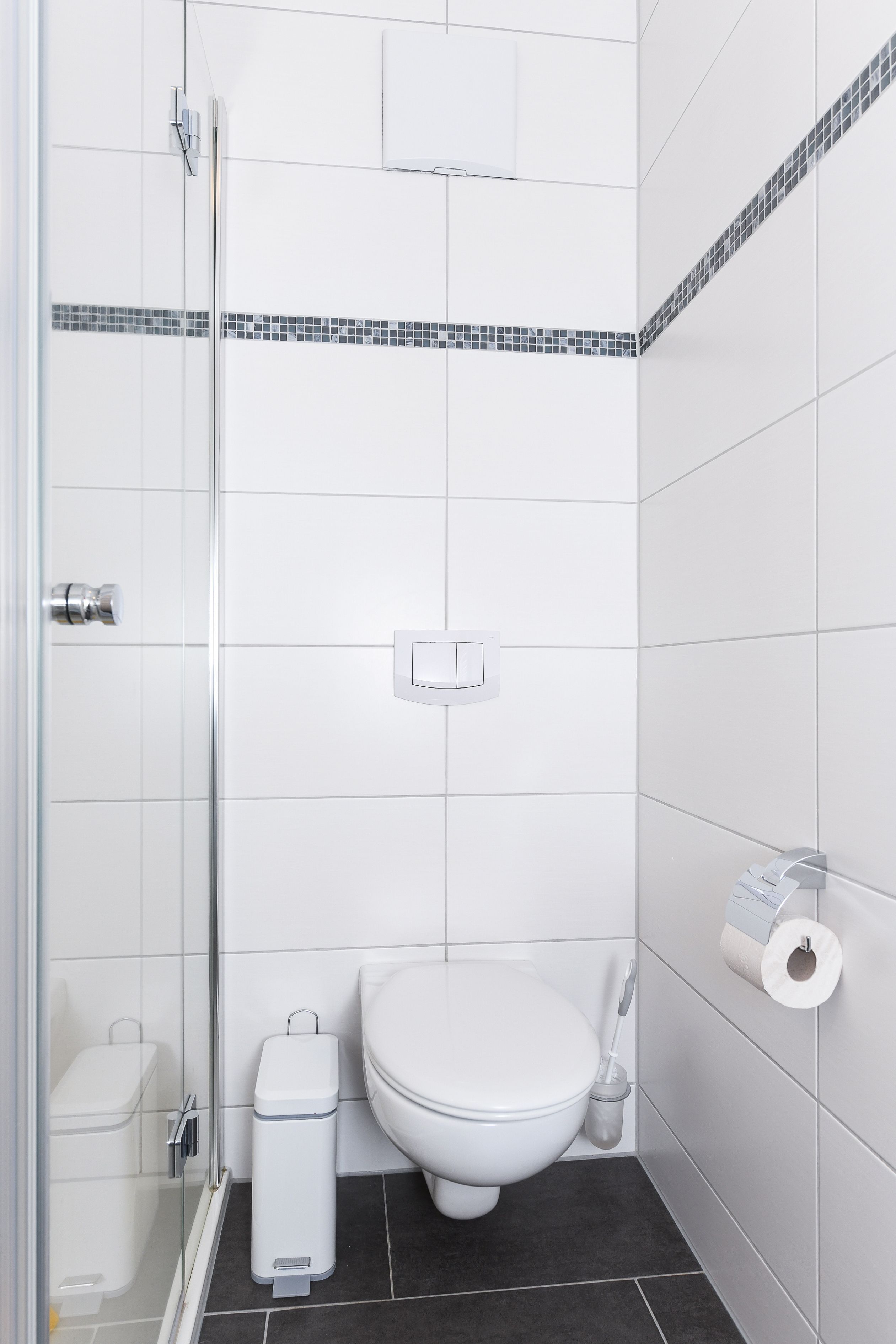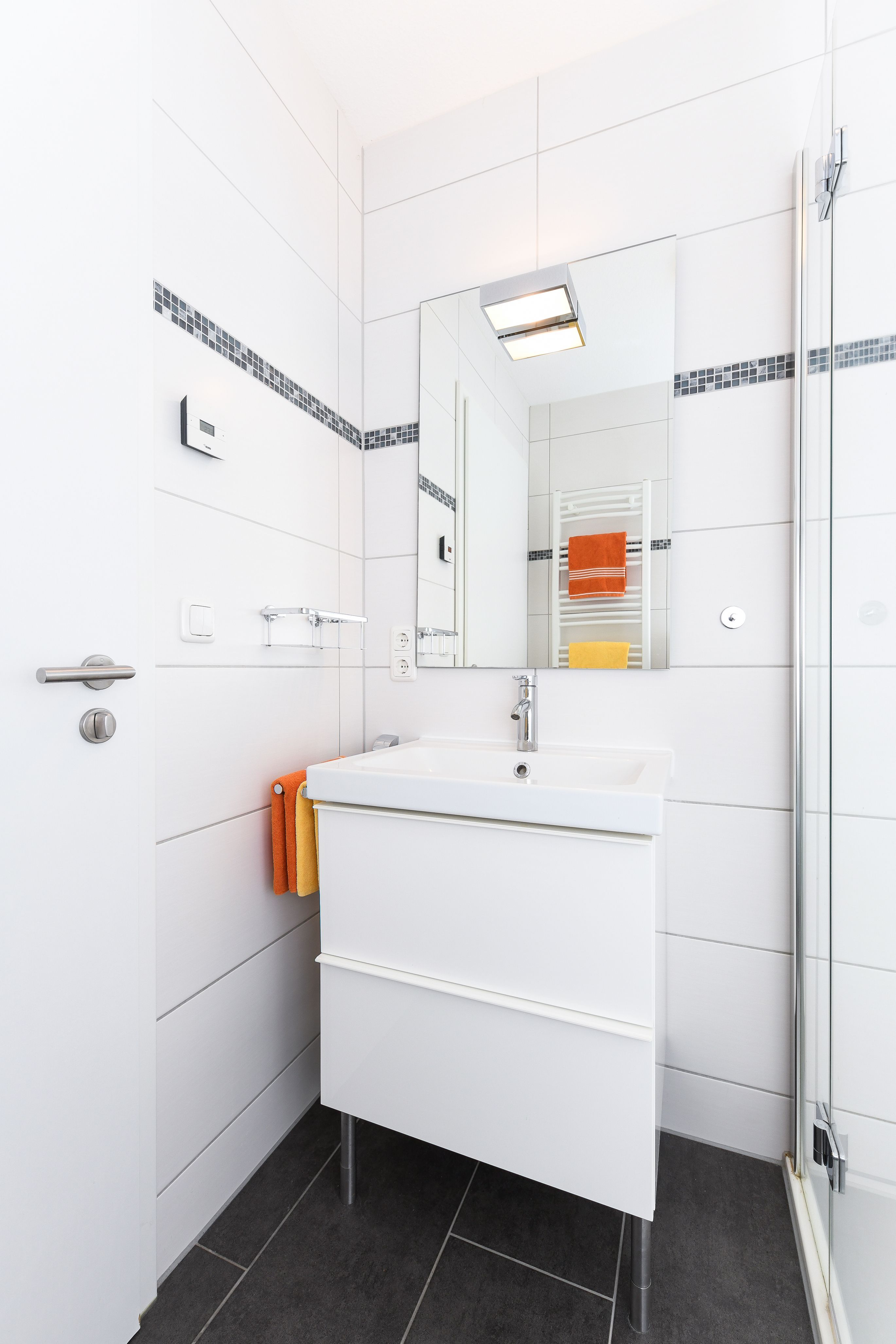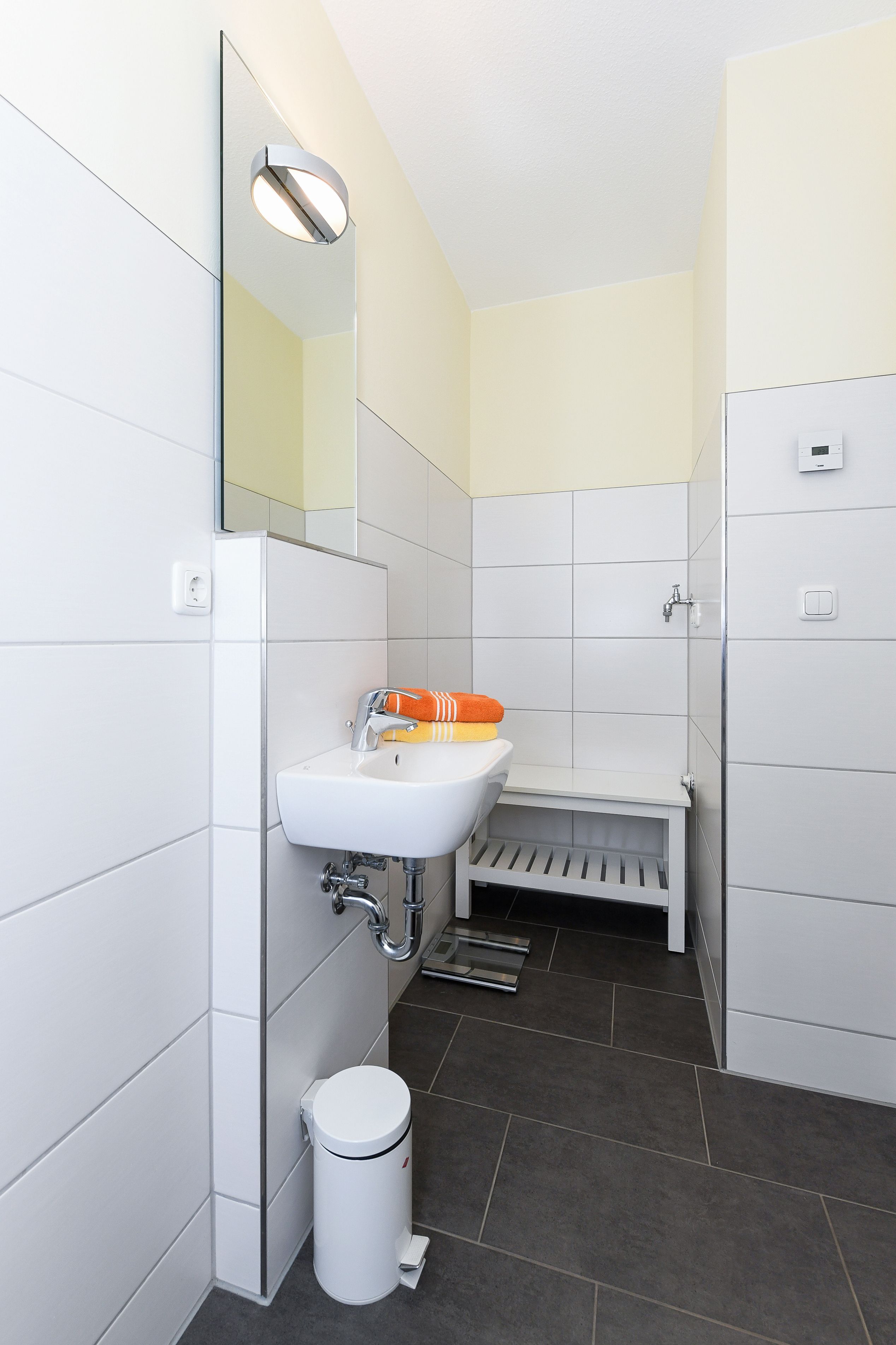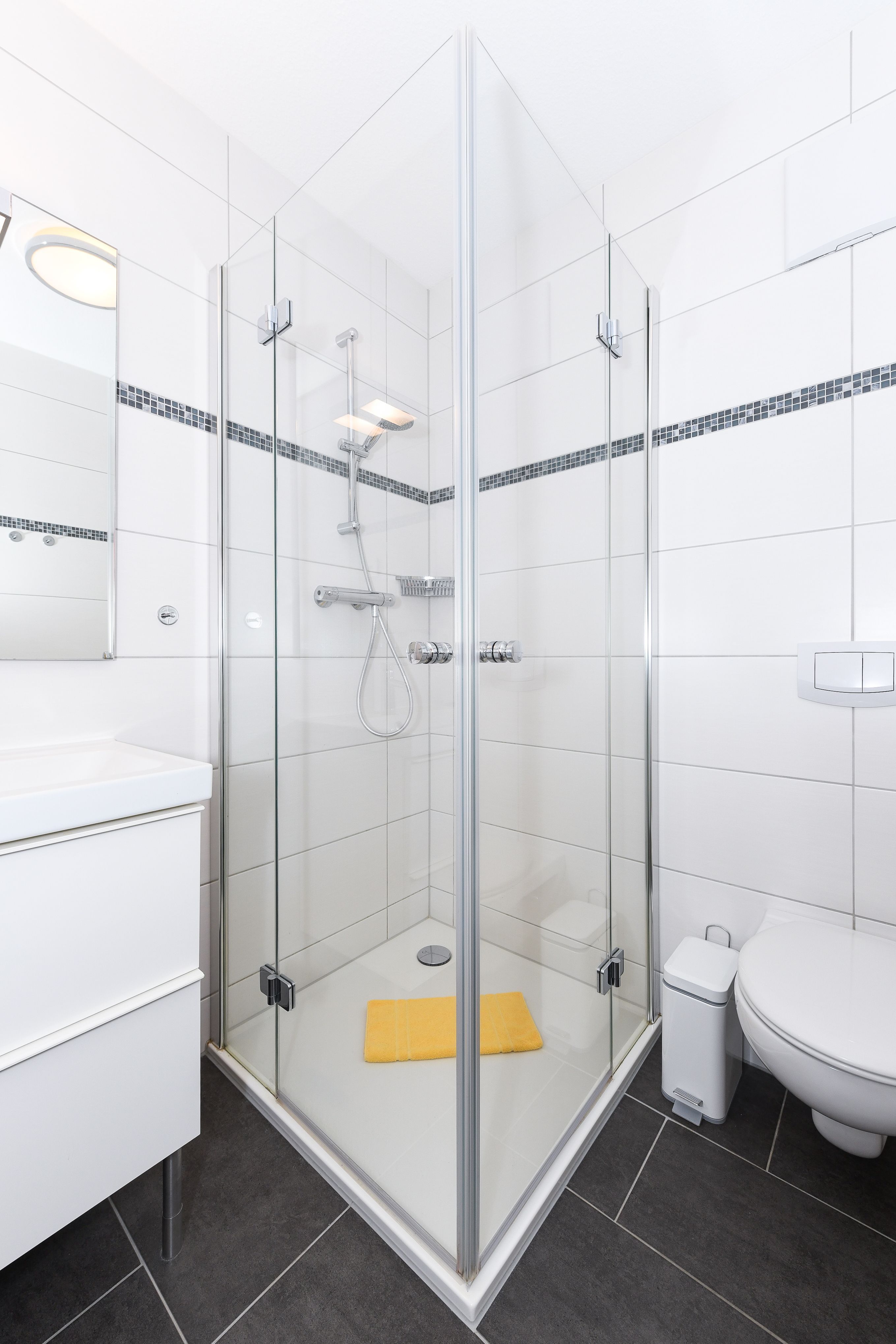 Badezimmer mit Dusche, Waschtisch und WC