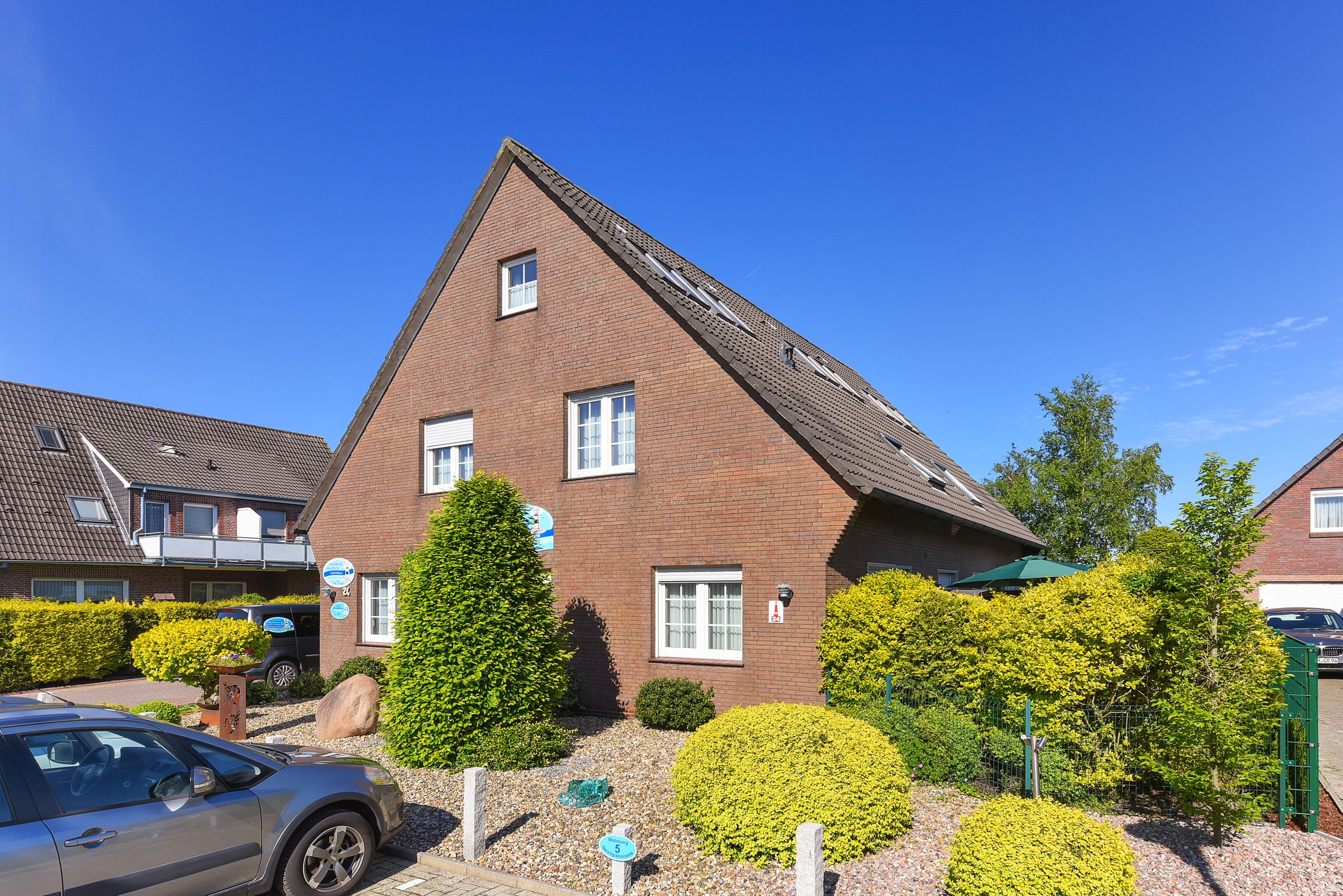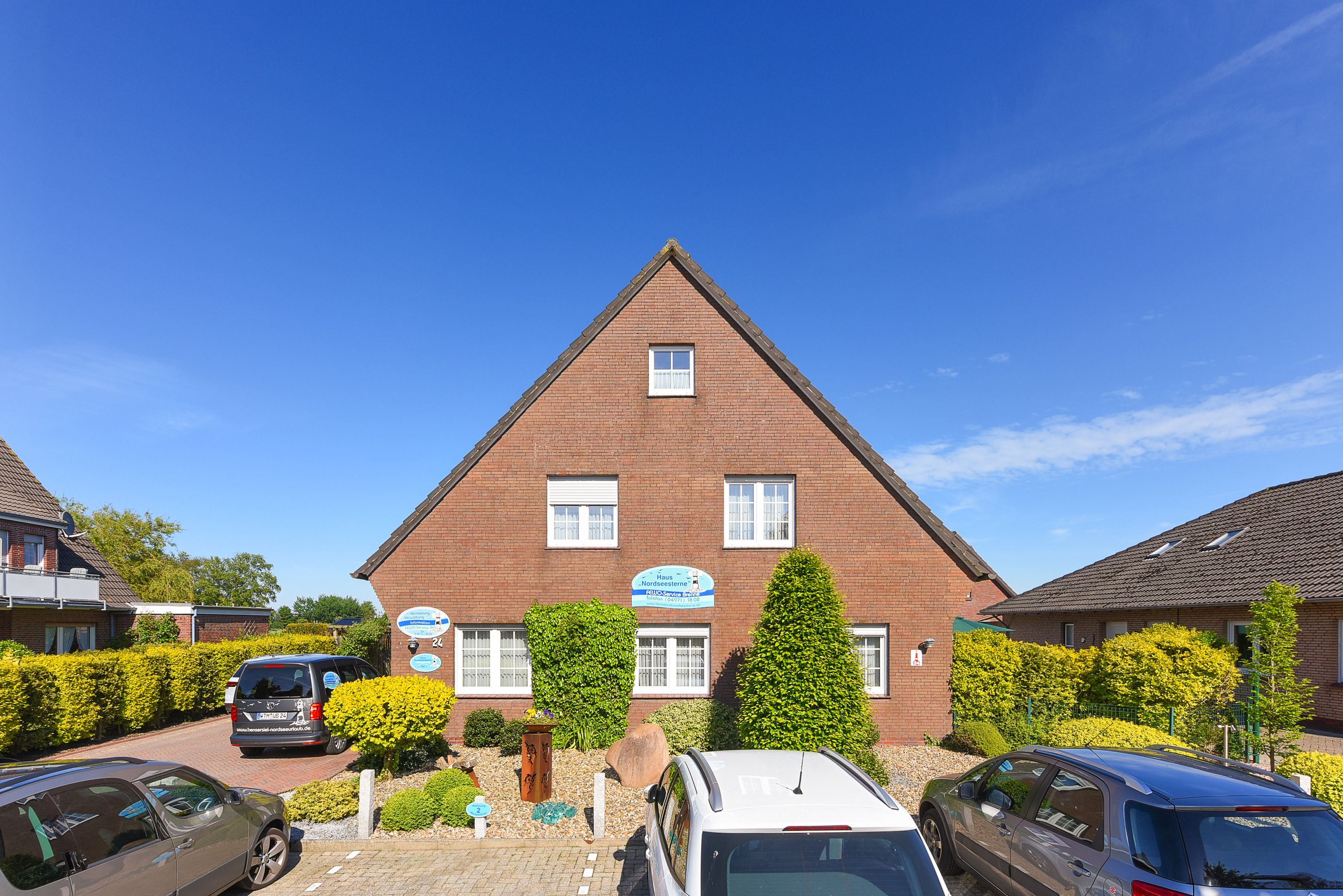 Das „Haus Nordseesterne“ liegt in einer ruhigen Anliegerstraße ohne Hinterlandbebauung. Sie haben also teilweise freie Sicht auf Ostfrieslands saftige Marschwiesen und -felder.