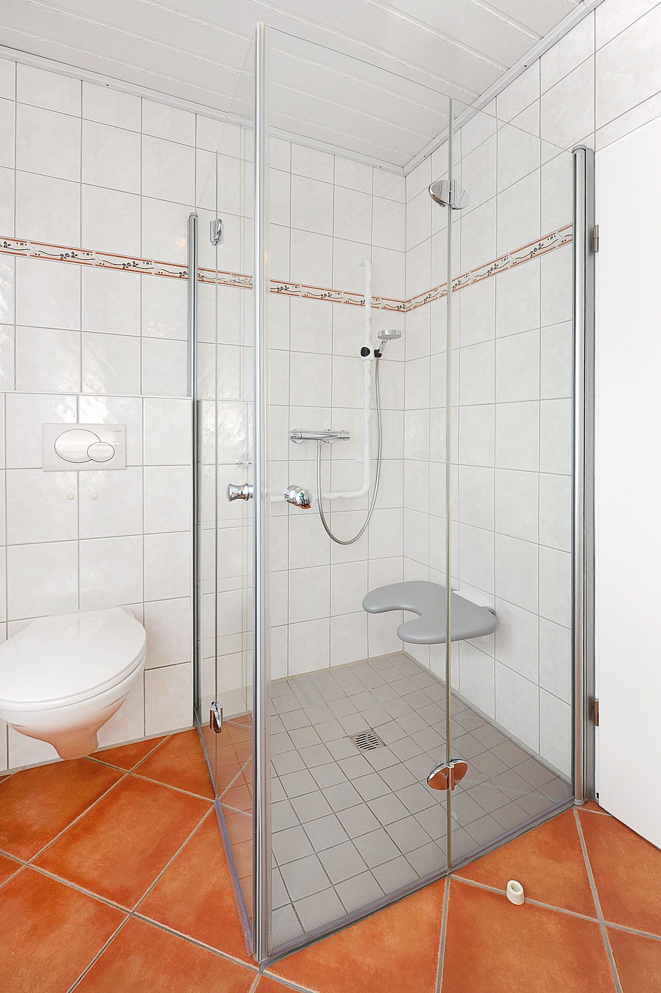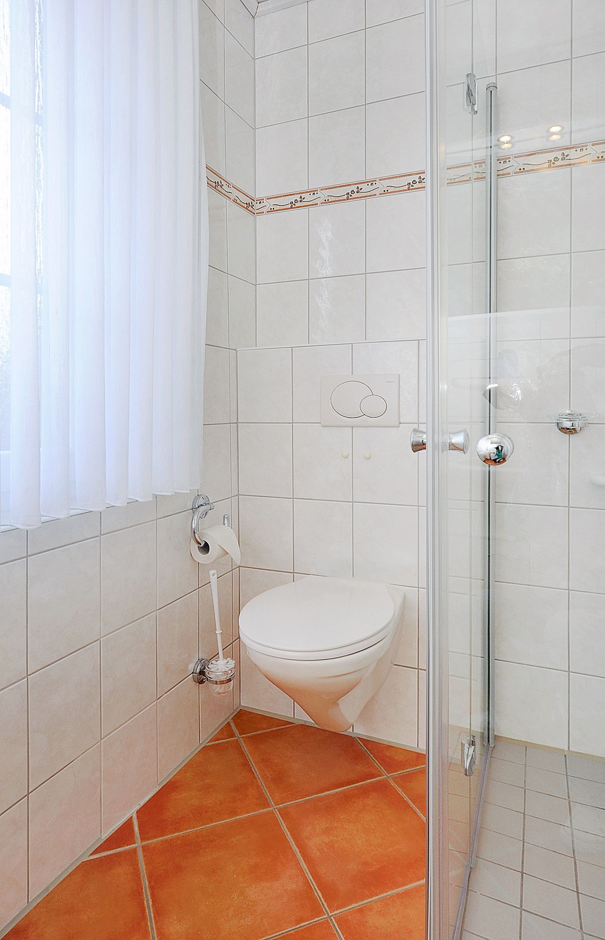 Badezimmer mit Dusche, Waschtisch und WC