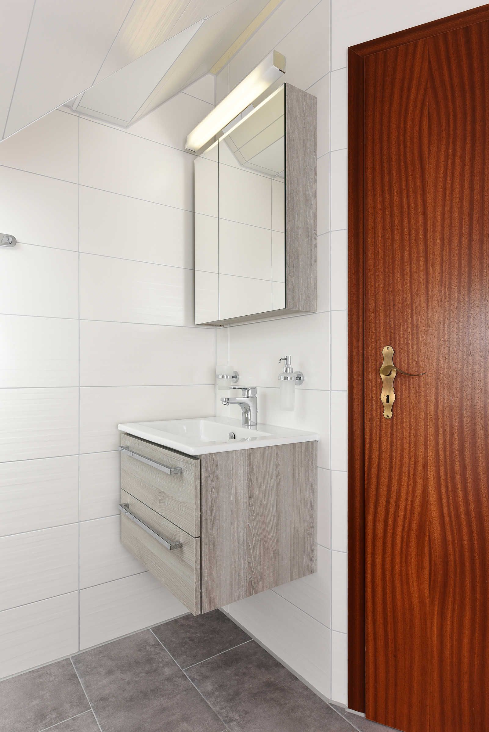 Badezimmer mit Dusche, Waschtisch und WC