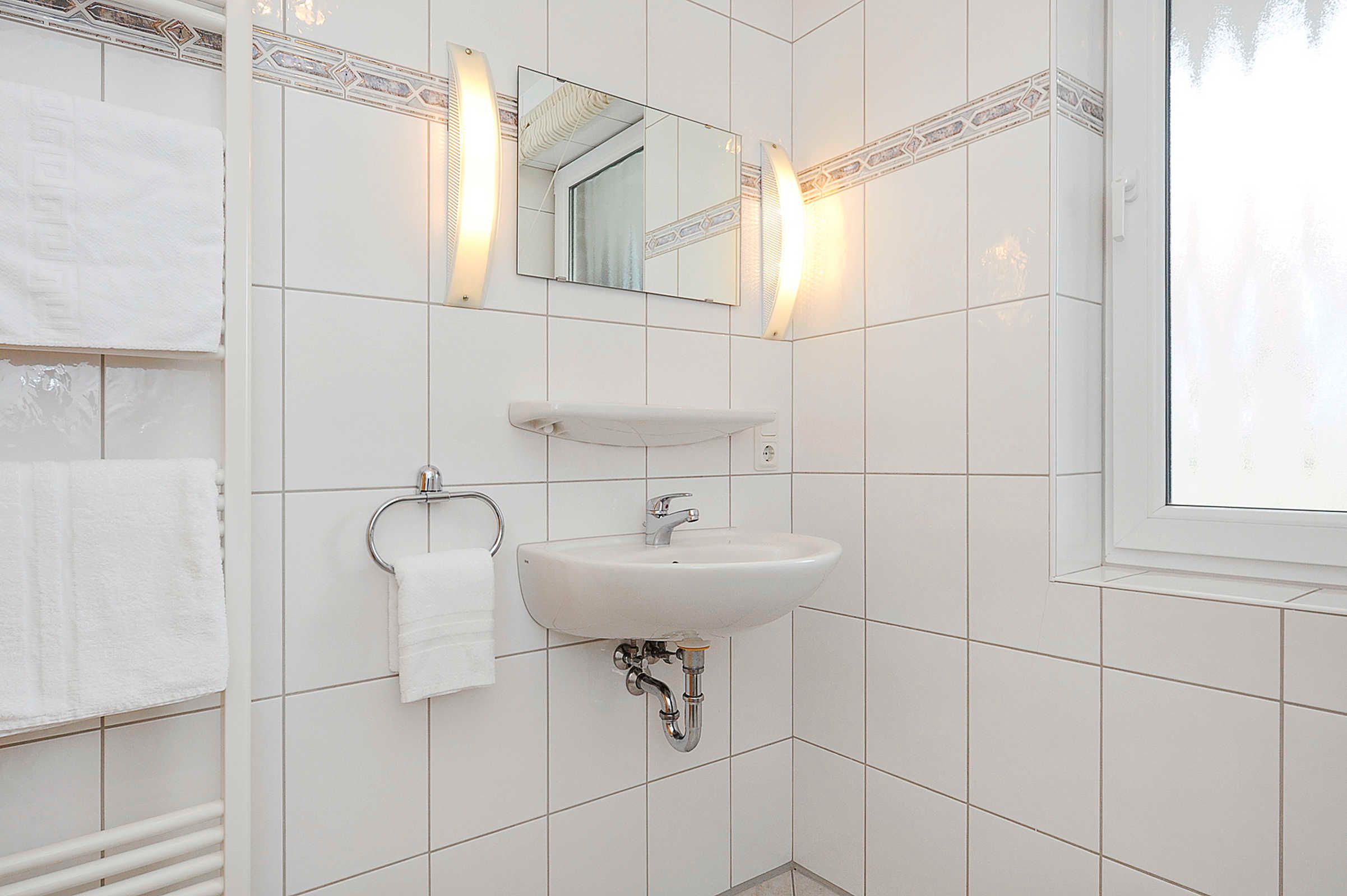 Badezimmer mit Dusche, Waschtisch und WC