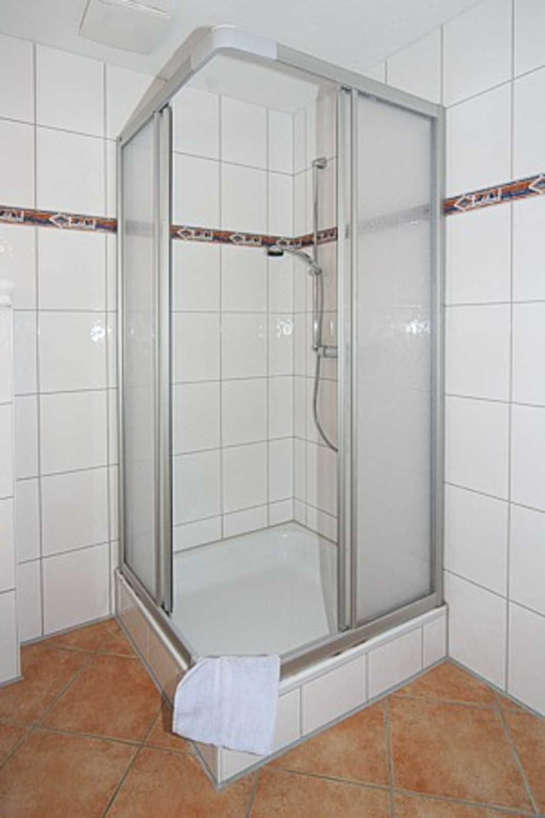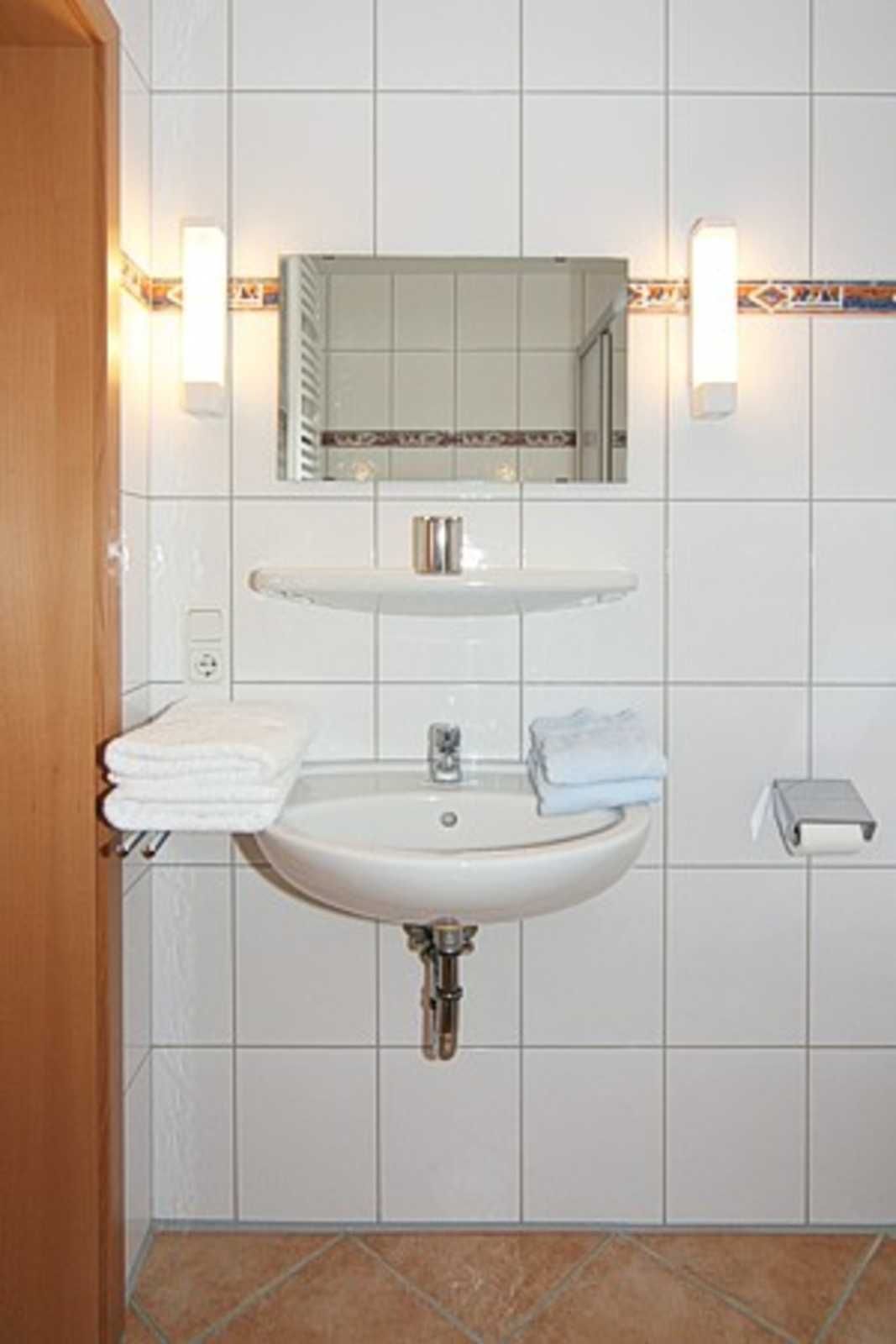 Badezimmer mit Dusche, Waschtisch und WC