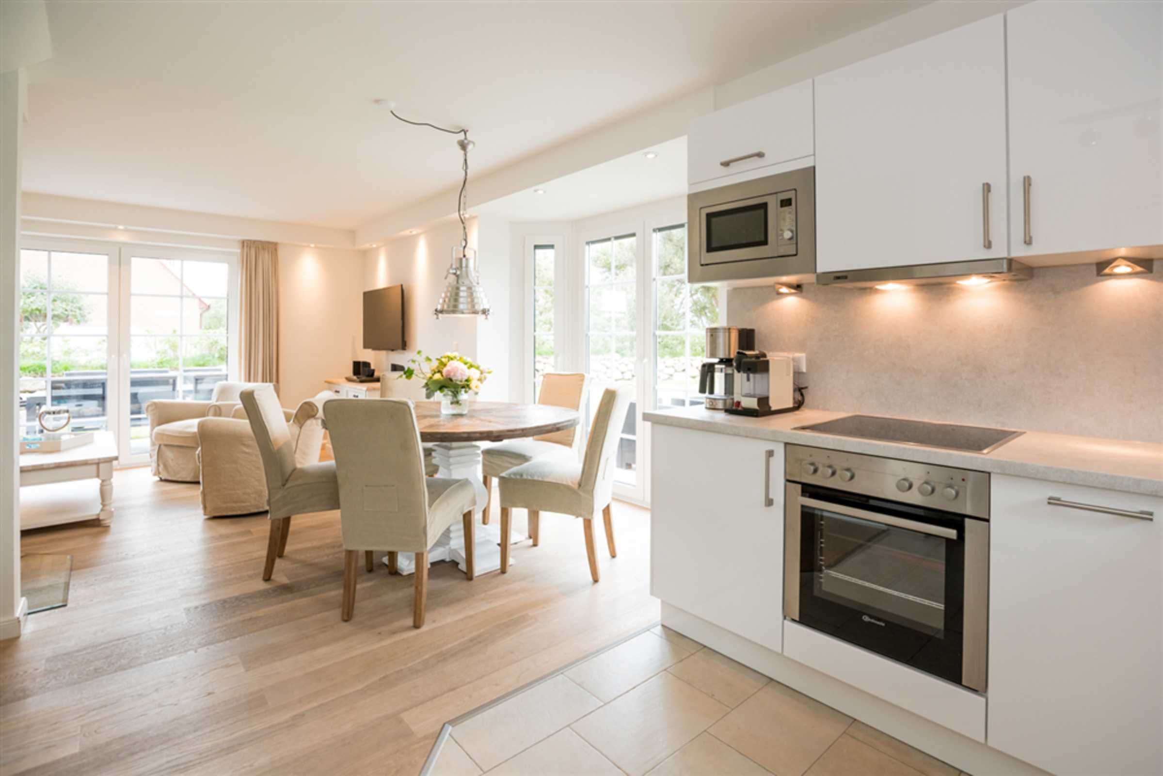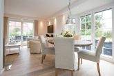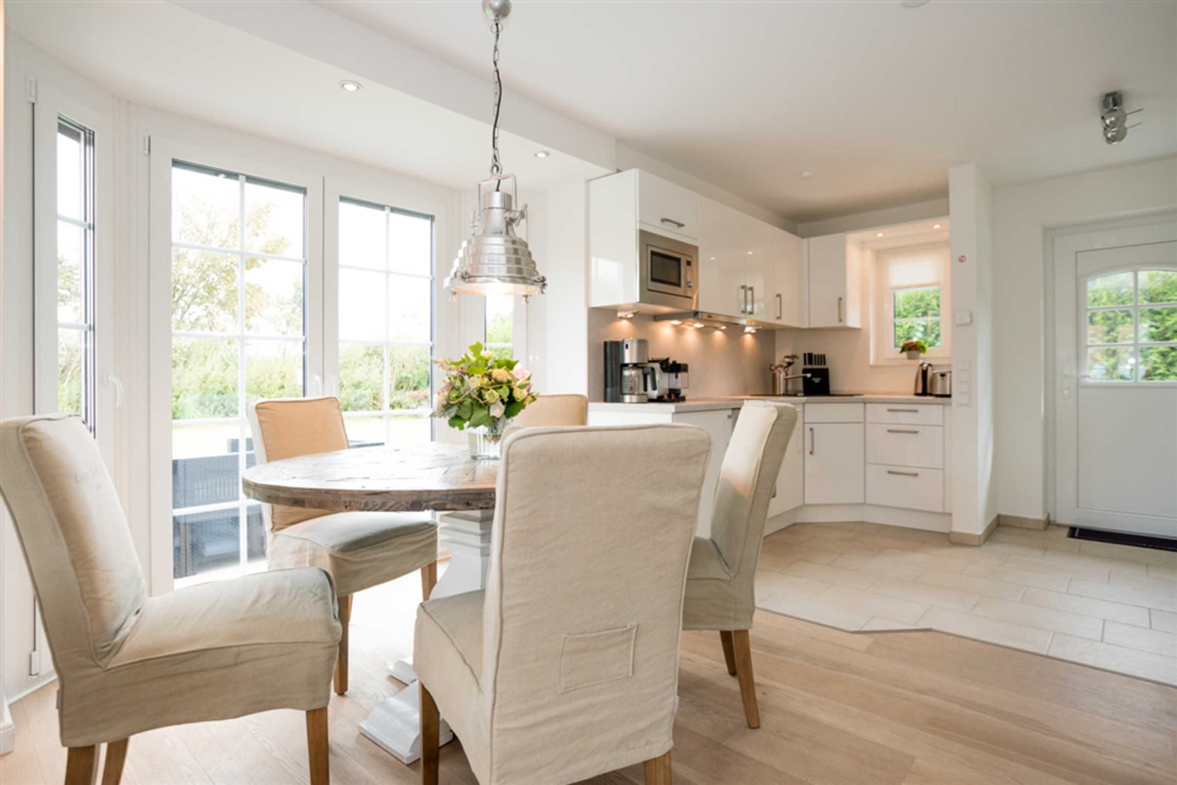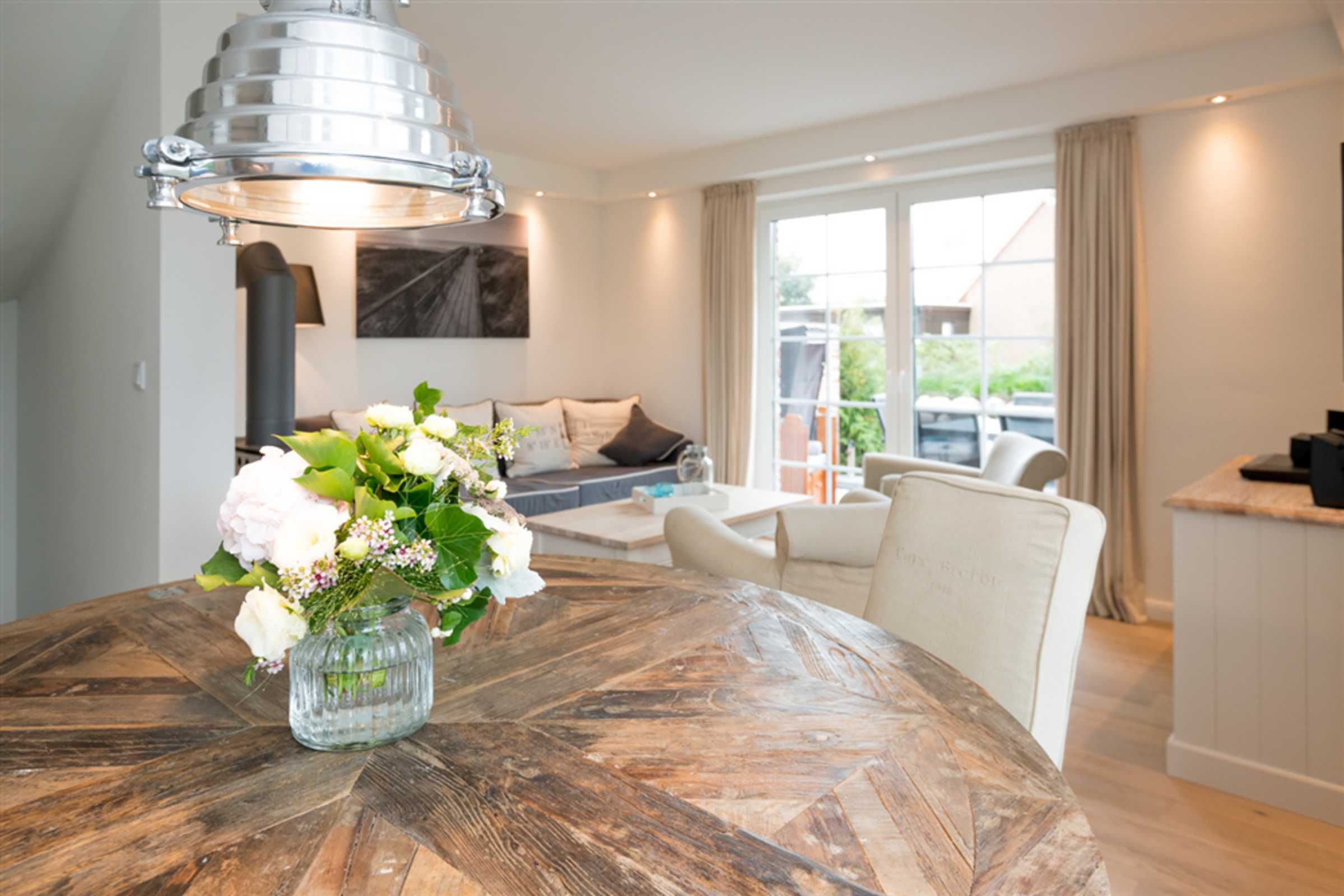 Im Erdgeschoss des Hauses finden Sie das wunderschön eingerichtete Wohn/Esszimmer mit der daran angrenzenden, komplett in weiß gehaltenen, voll ausgestatteten Küche. Das Wohnzimmer verfügt über ein großes Sofa und zwei Sessel - das Highlight hier ist natürlich der Kaminofen mit Sichtfenster, der Wohlfühlatmosphäre garantiert.