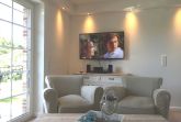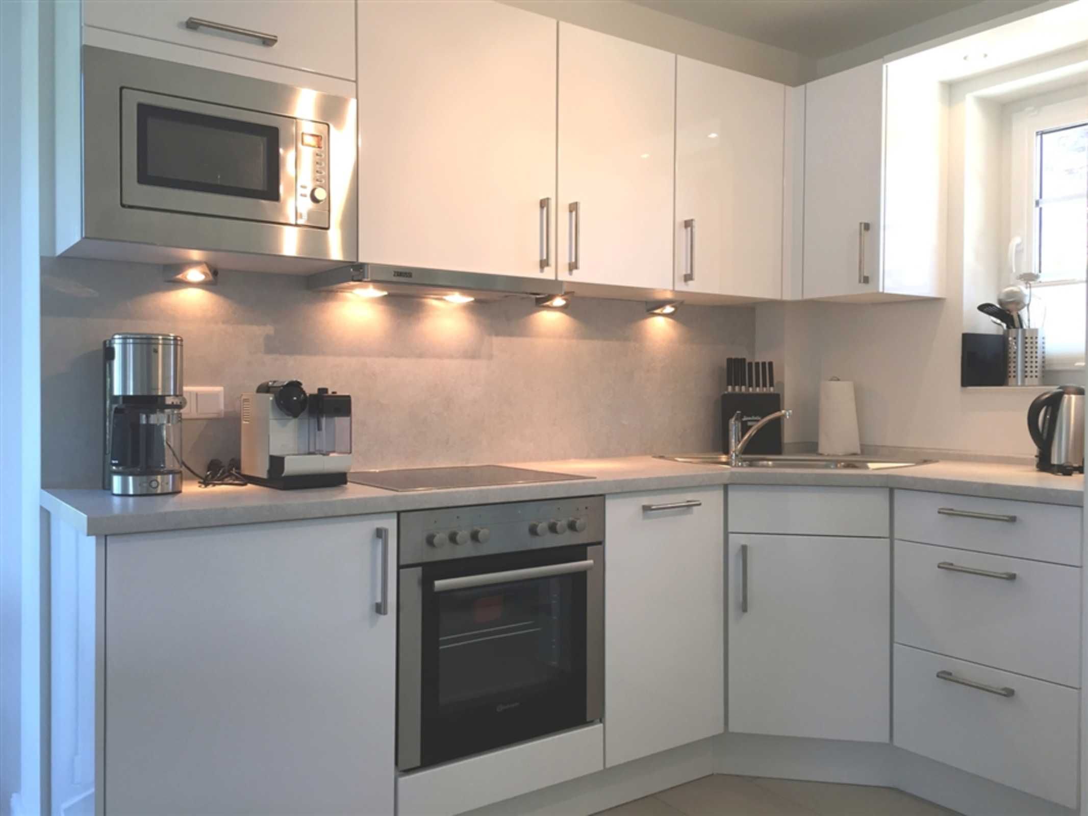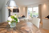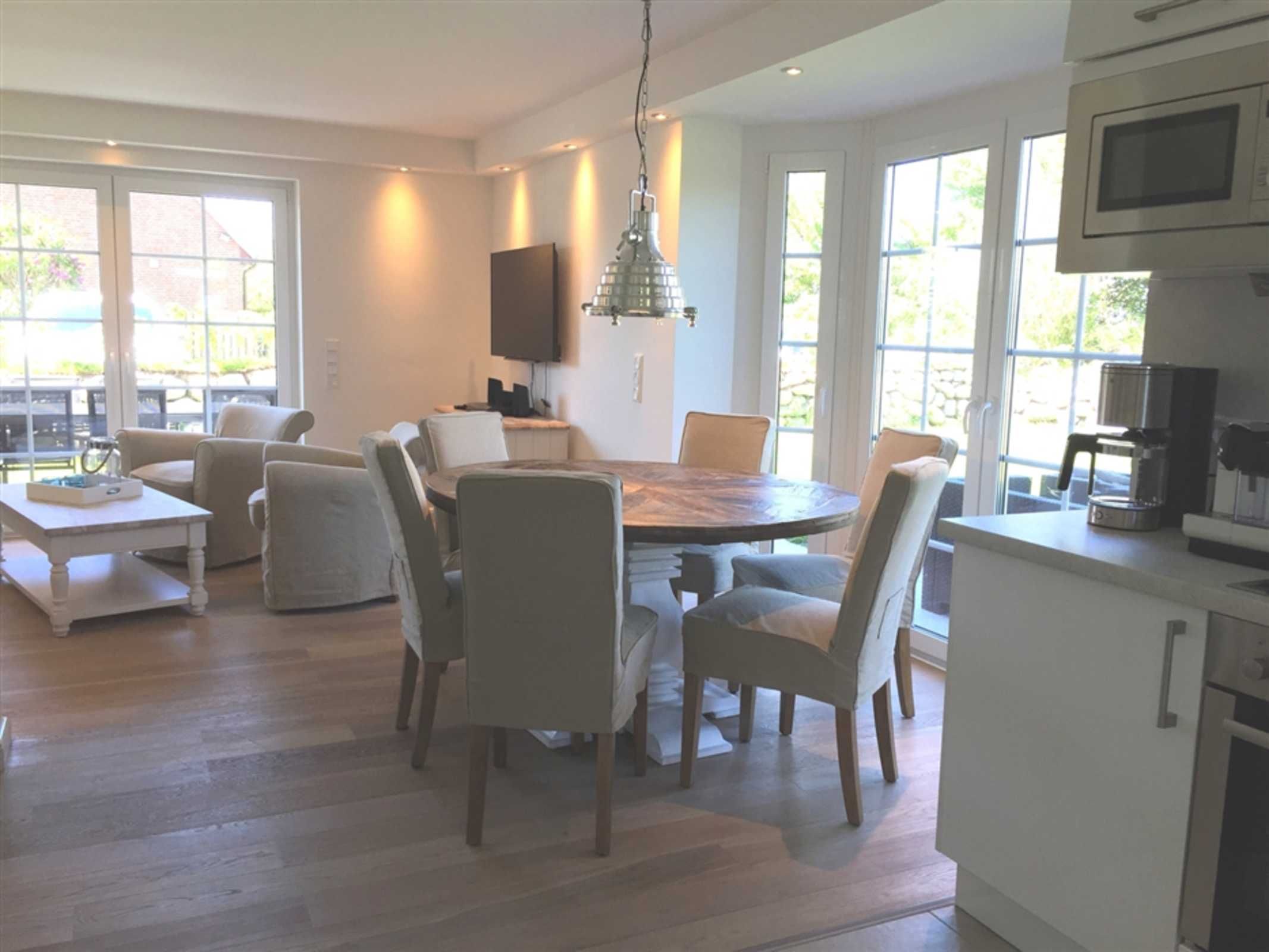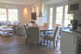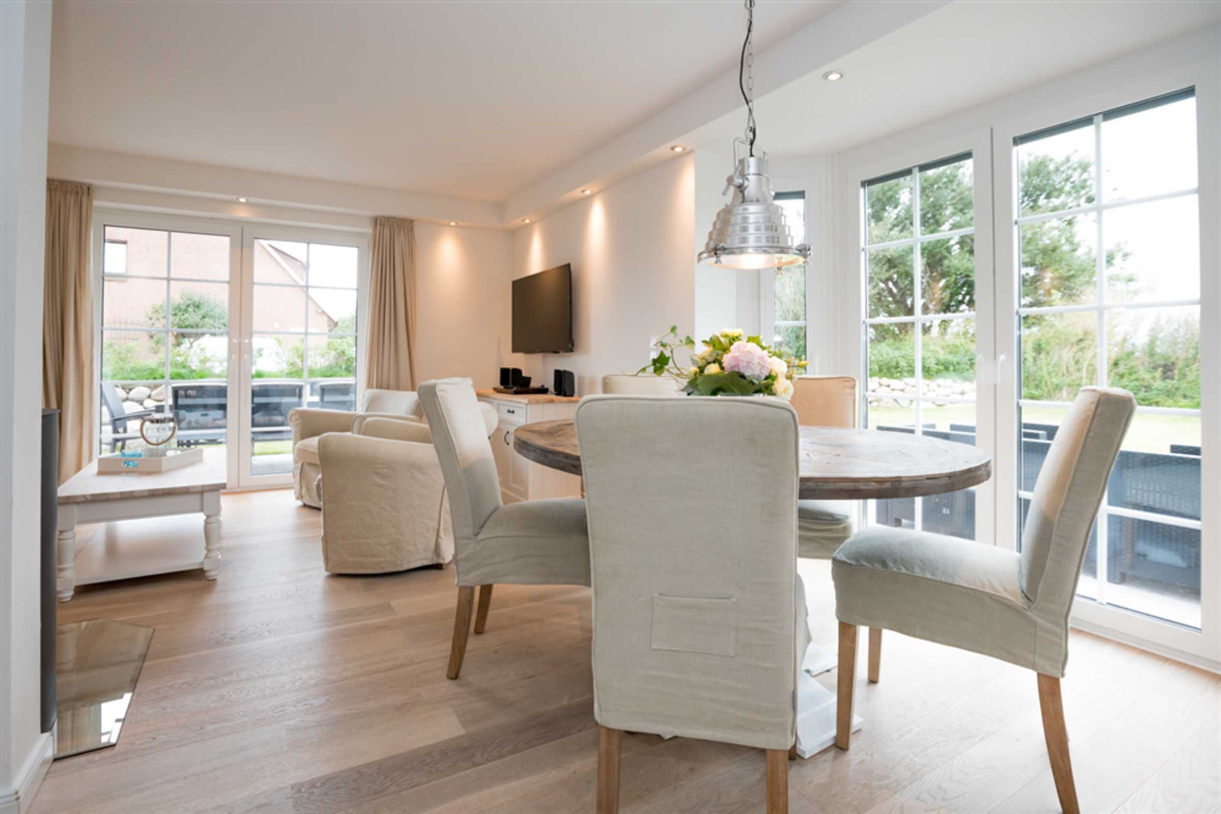 Im Erdgeschoss des Hauses finden Sie das wunderschön eingerichtete Wohn/Esszimmer mit der daran angrenzenden, komplett in weiß gehaltenen, voll ausgestatteten Küche. Das Wohnzimmer verfügt über ein großes Sofa und zwei Sessel - das Highlight hier ist natürlich der Kaminofen mit Sichtfenster, der Wohlfühlatmosphäre garantiert.