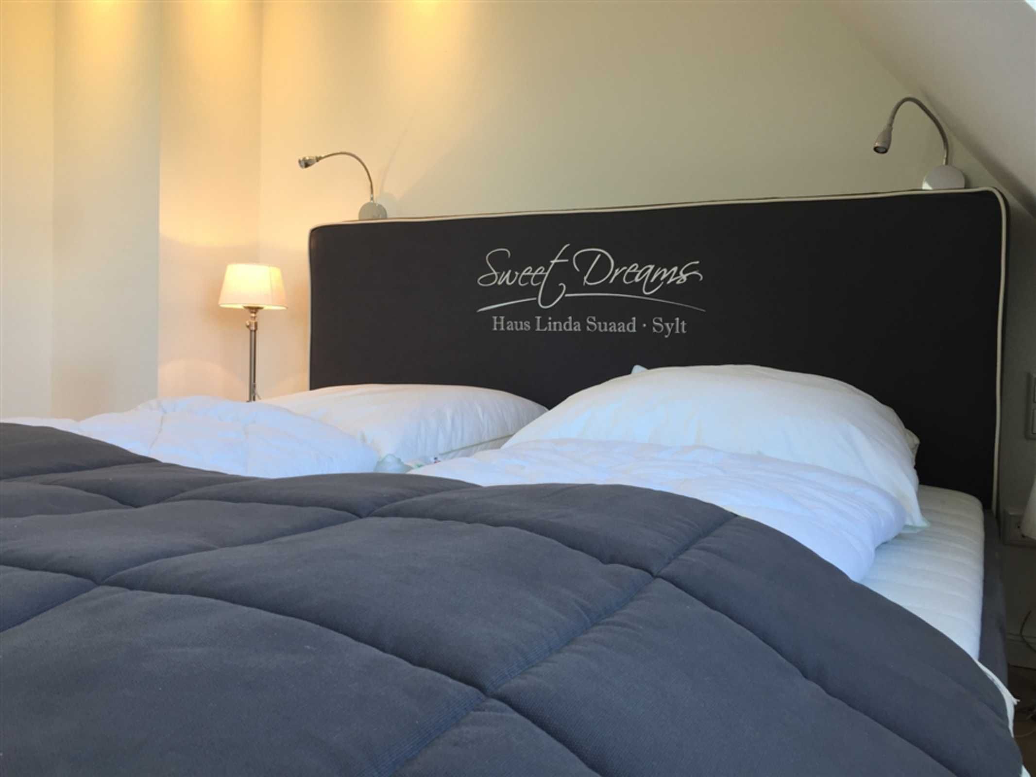 Das Haus verfügt insgesamt über vier Schlafzimmer. Im 1. Obergeschoss mit Dachschrägen sind ein größeres und ein sehr kleines Schlafzimmer vorzufinden. Die Betten haben die Größen 140x200cm (kleines Schlafzimmer) und 180x200cm (größeres Schlafzimmer). Das in Sandfarben gehaltene Bad im 1. OG verfügt über zwei Doppelwaschbecken, eine ebenerdige Dusche und eine Toilette. Im Untergeschoss finden Sie das dritte Schlafzimmer mit einem Doppelbett mit den Maßen 180x200cm, sowie ein weiteres Badezimmer.