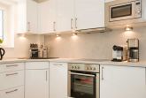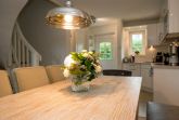 Im Erdgeschoss des Hauses finden Sie das wunderschön eingerichtete Wohn/Esszimmer mit der daran angrenzenden, komplett in weiß gehaltenen, voll ausgestatteten Küche. Das Wohnzimmer verfügt über ein großes Sofa und zwei Sessel - das Highlight hier ist natürlich der Kaminofen mit Sichtfenster, der Wohlfühlatmosphäre garantiert.