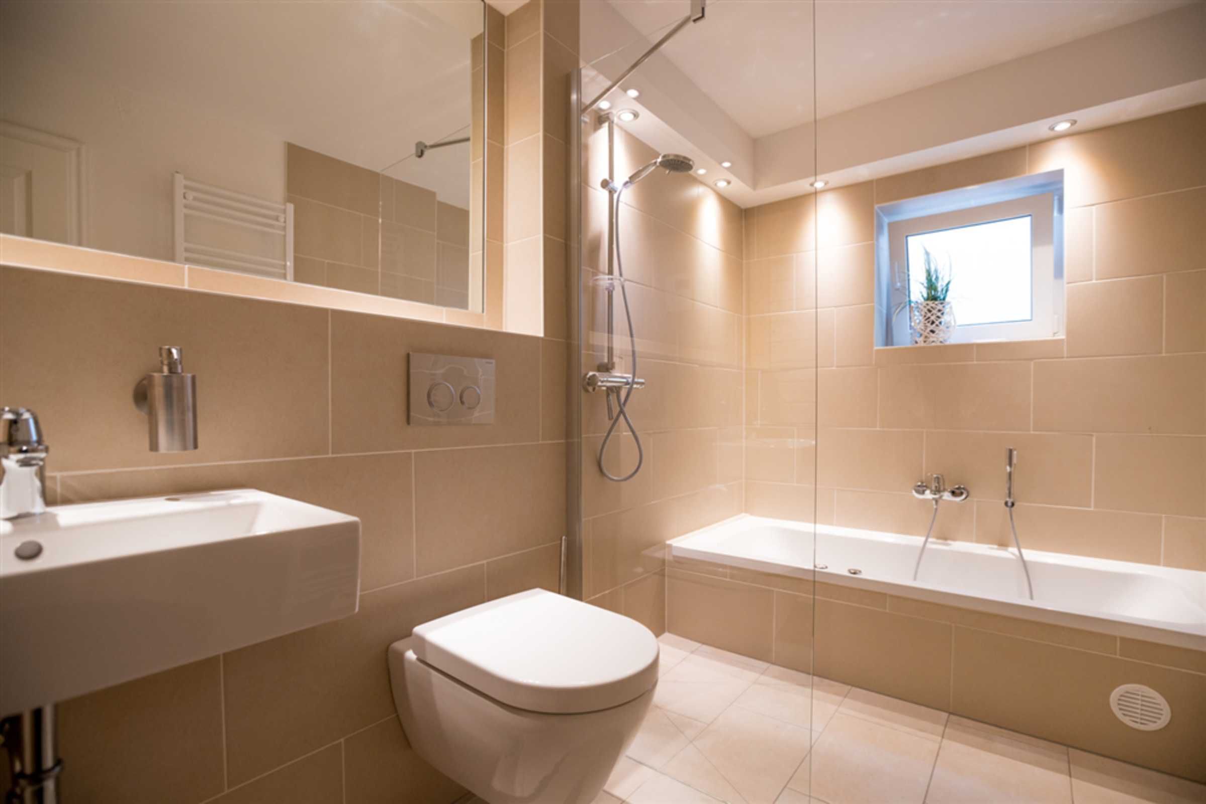 Das Badezimmer im Untergeschoss verfügt neben ebenerdiger Dusche zusätzlich noch über eine Whirlbadewanne sowie eine 2-Personen Sauna.