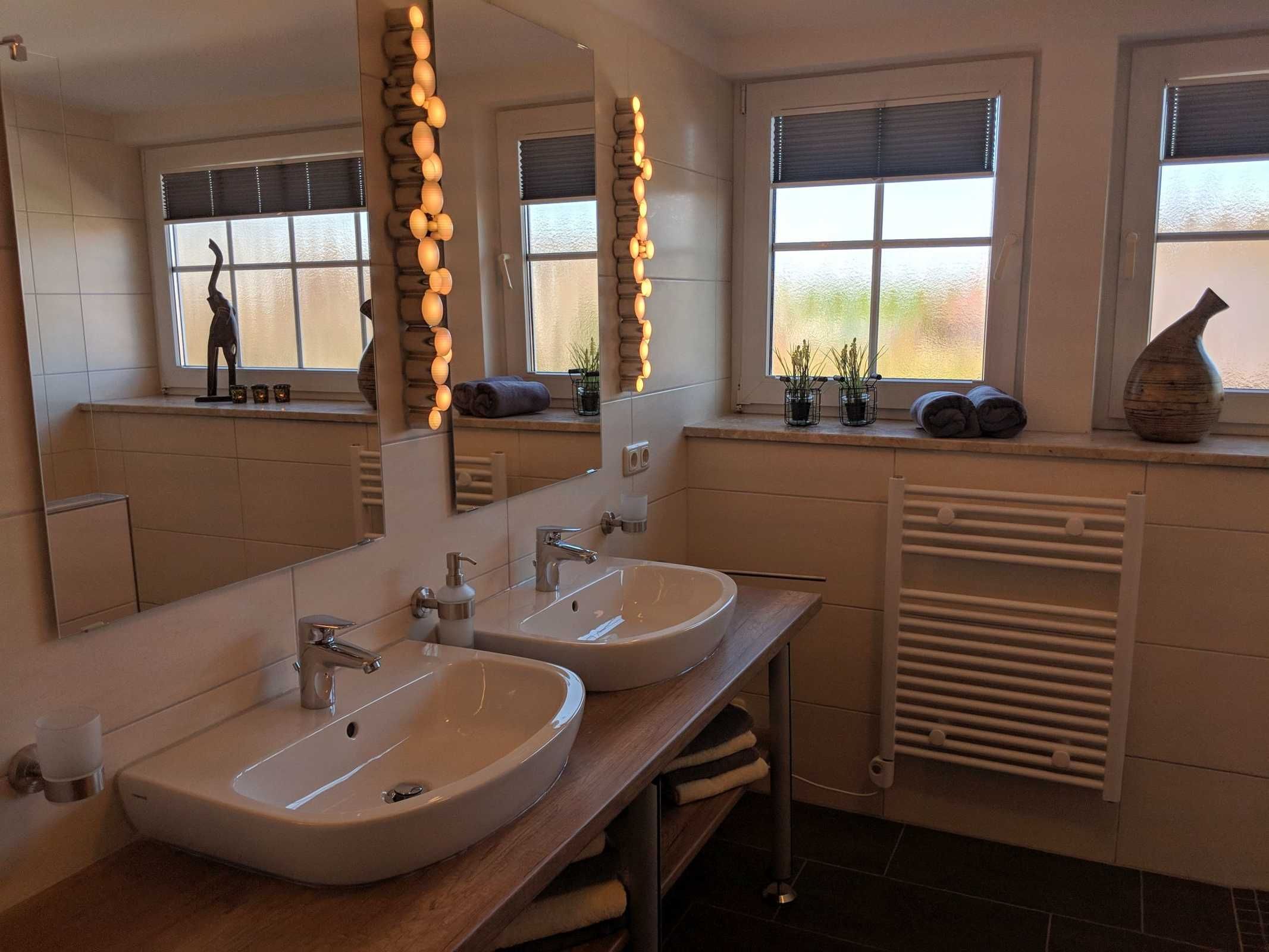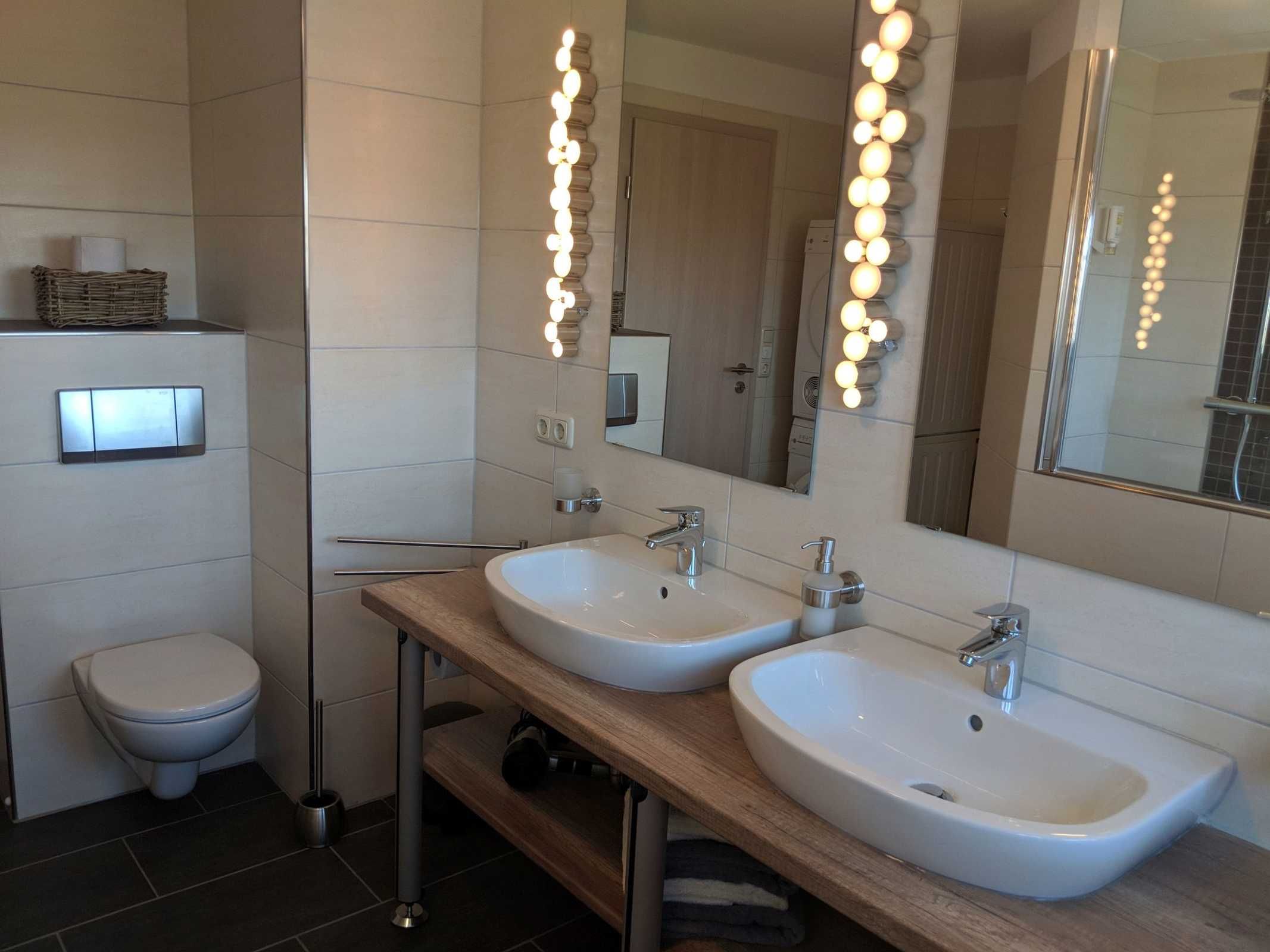 • Badezimmer: mit Walk in Dusche, 2 Waschbecken und WC, Fön