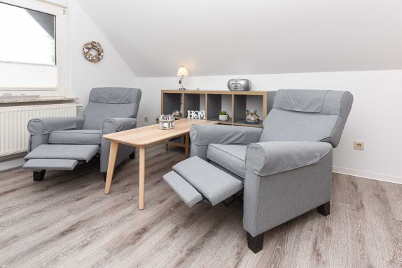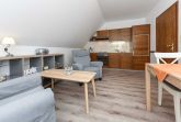 Die Wohnungen Strandnest und Strandmuschel sind jeweils ungefähr 35Quadratmeter groß und ideal für Paare geeignet, ausgestattet mit Schlafzimmer, Badezimmer und Wohnzimmer mit integrierter Küche.
