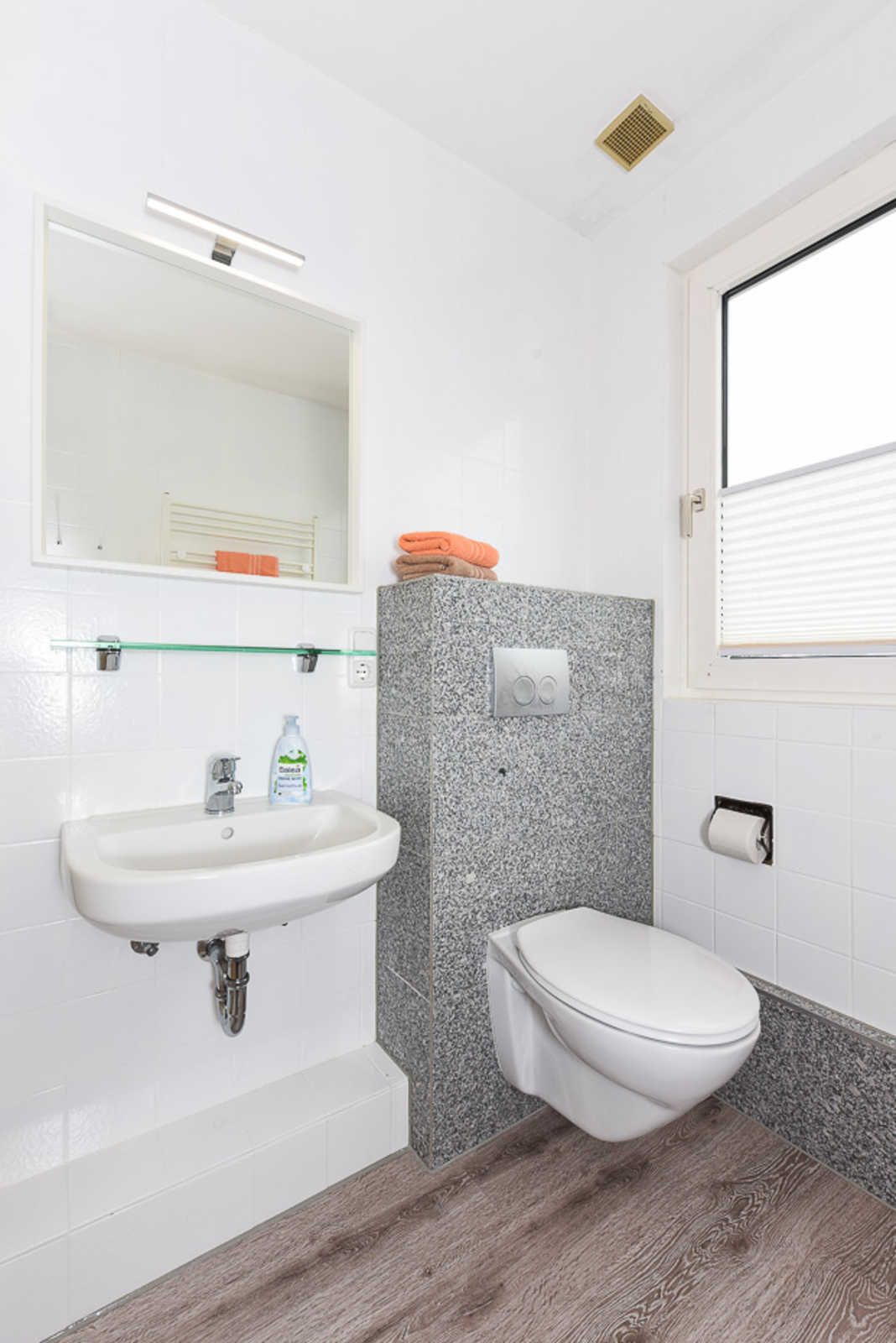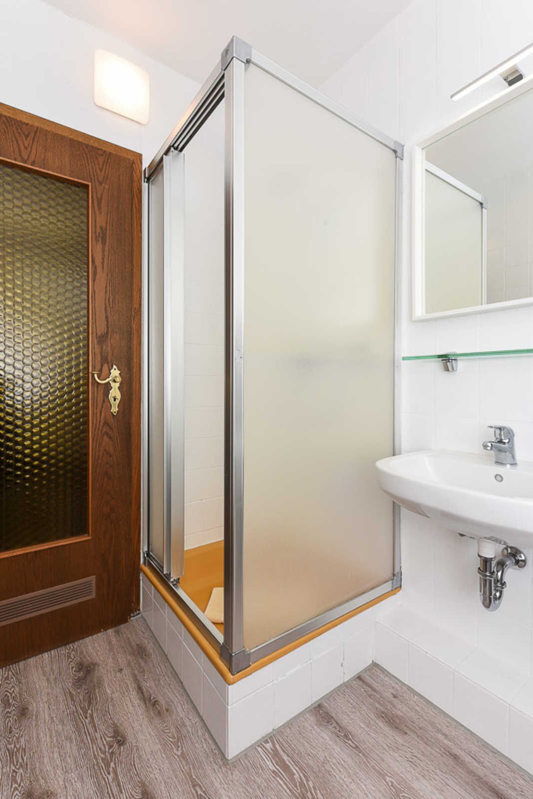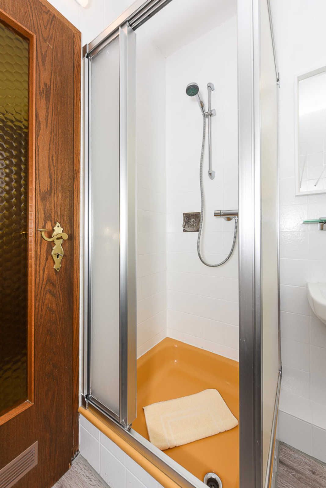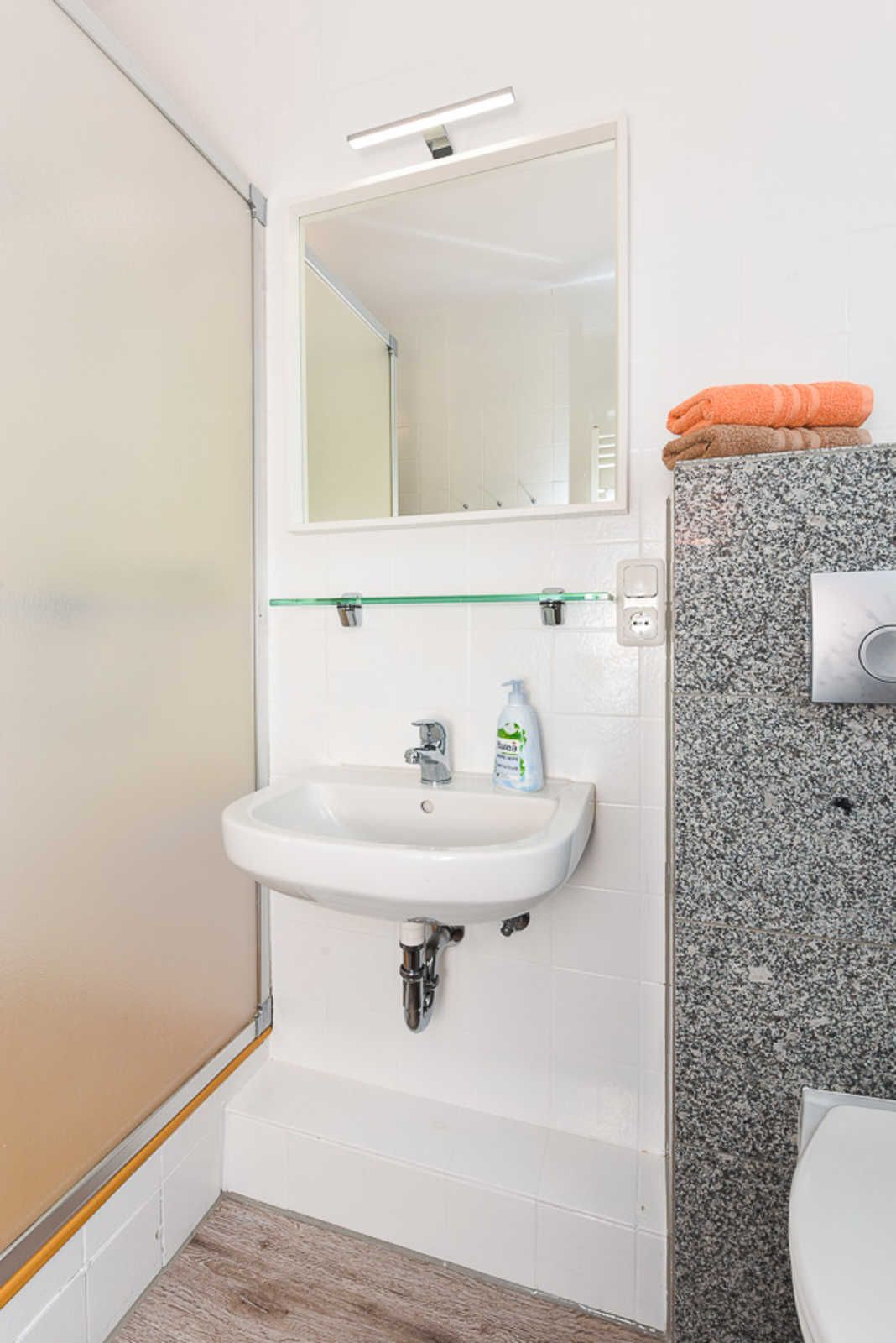 Badezimmer mit Dusche, Waschtisch und WC