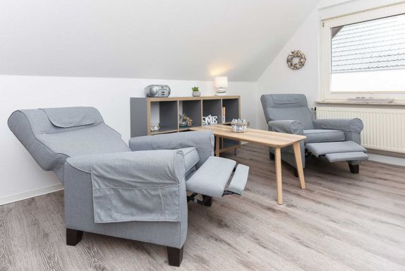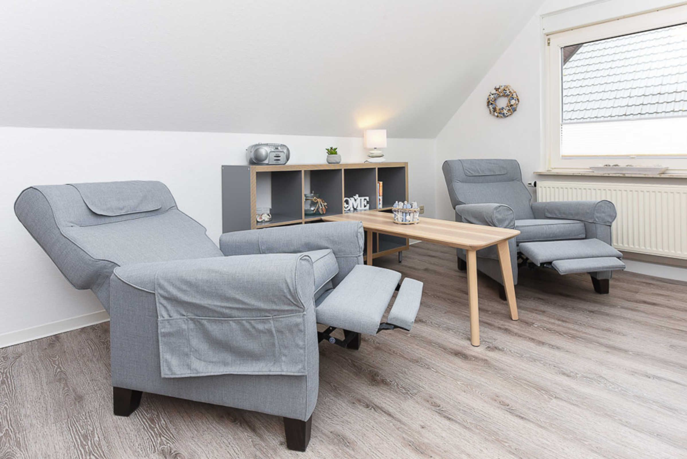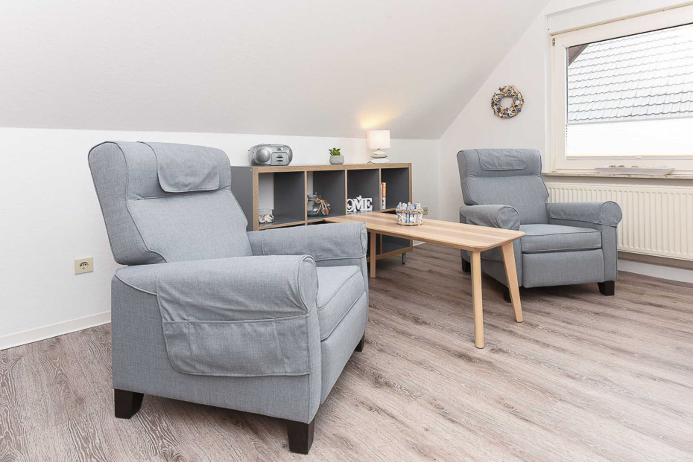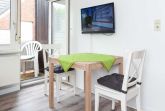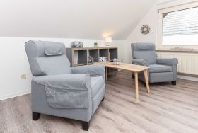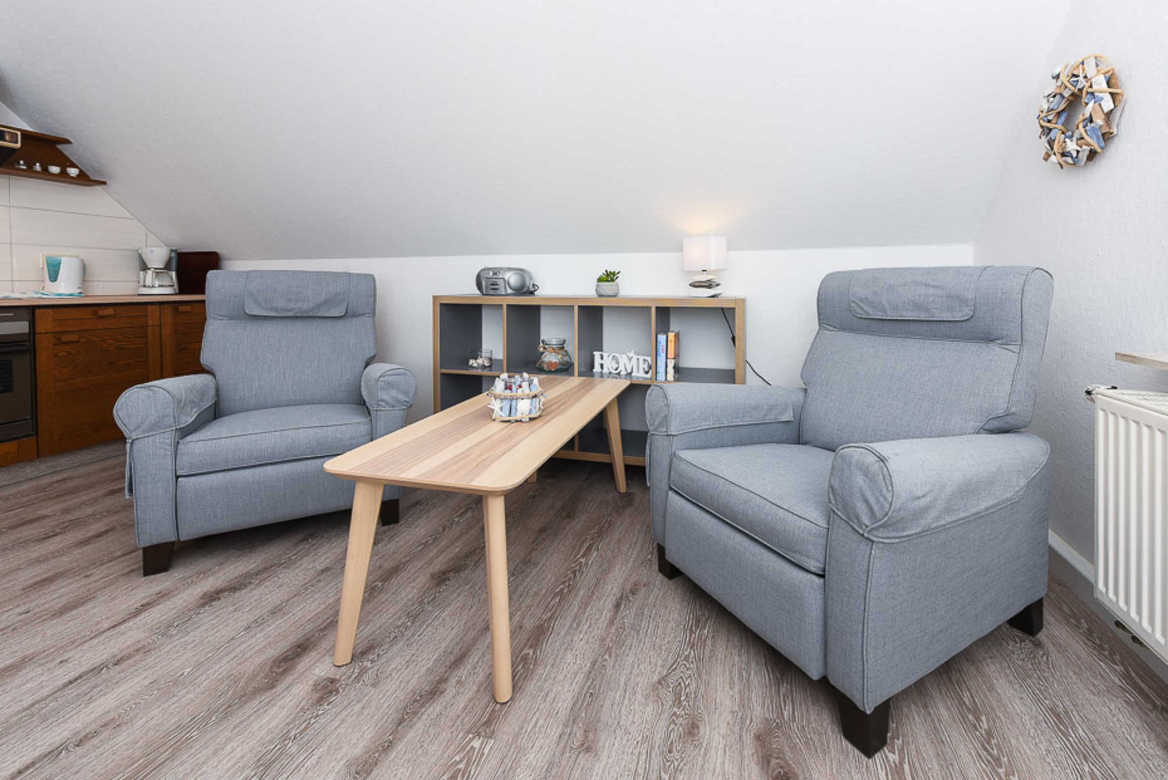 Die Wohnungen Strandnest und Strandmuschel sind jeweils ungefähr 35Quadratmeter groß und ideal für Paare geeignet, ausgestattet mit Schlafzimmer, Badezimmer und Wohnzimmer mit integrierter Küche.