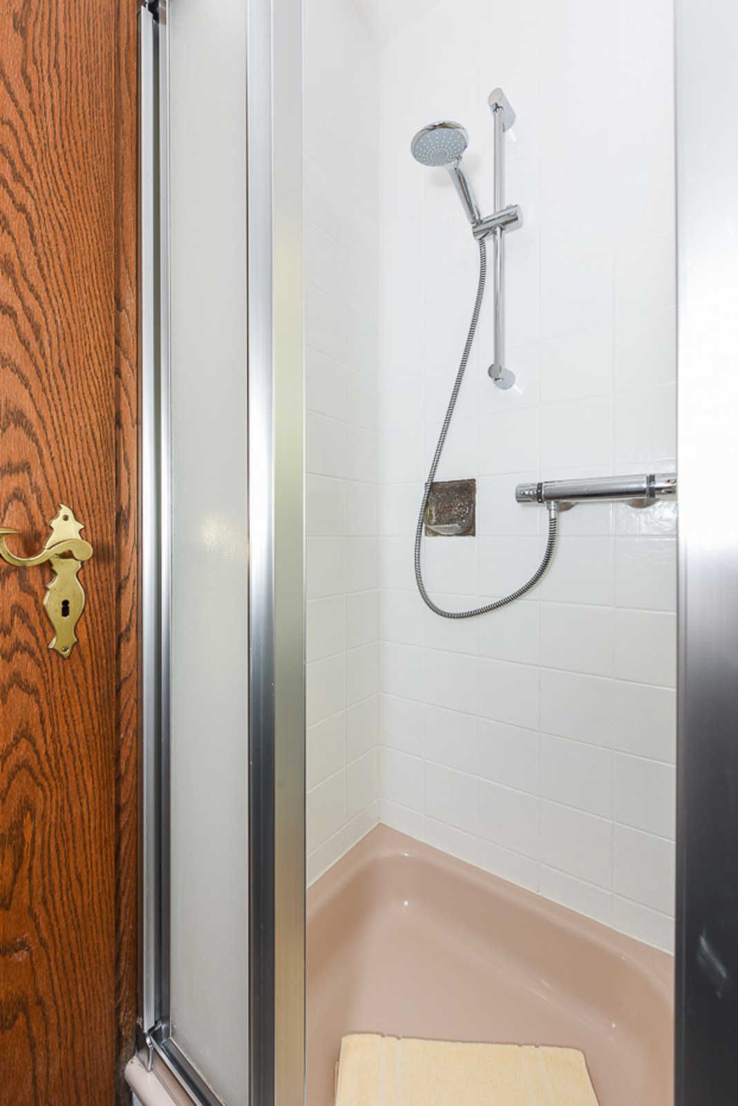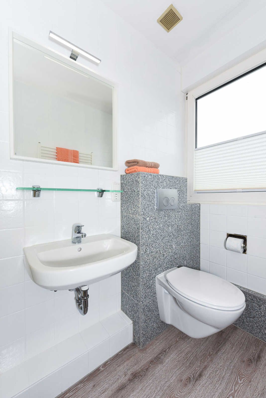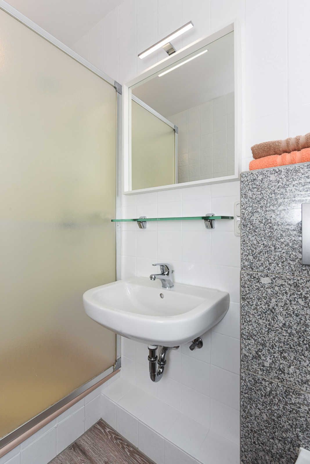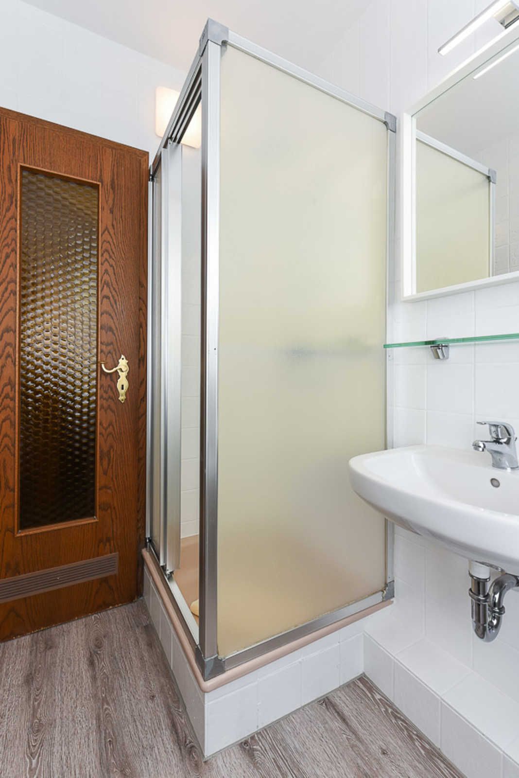 Badezimmer mit Dusche, Waschtisch und WC