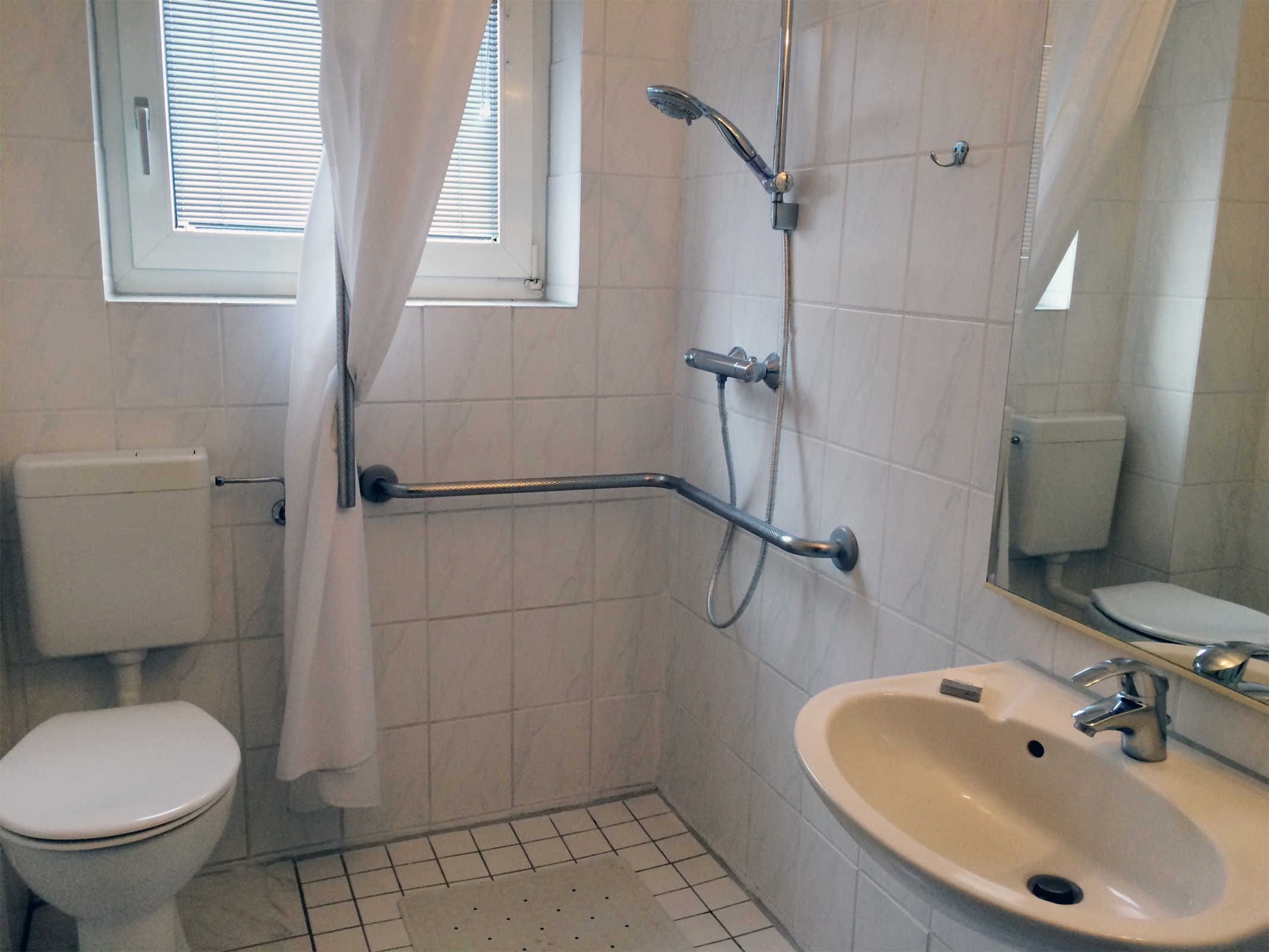 Duschbad: modern, erhöhtes WC, rundum stabile Griffe