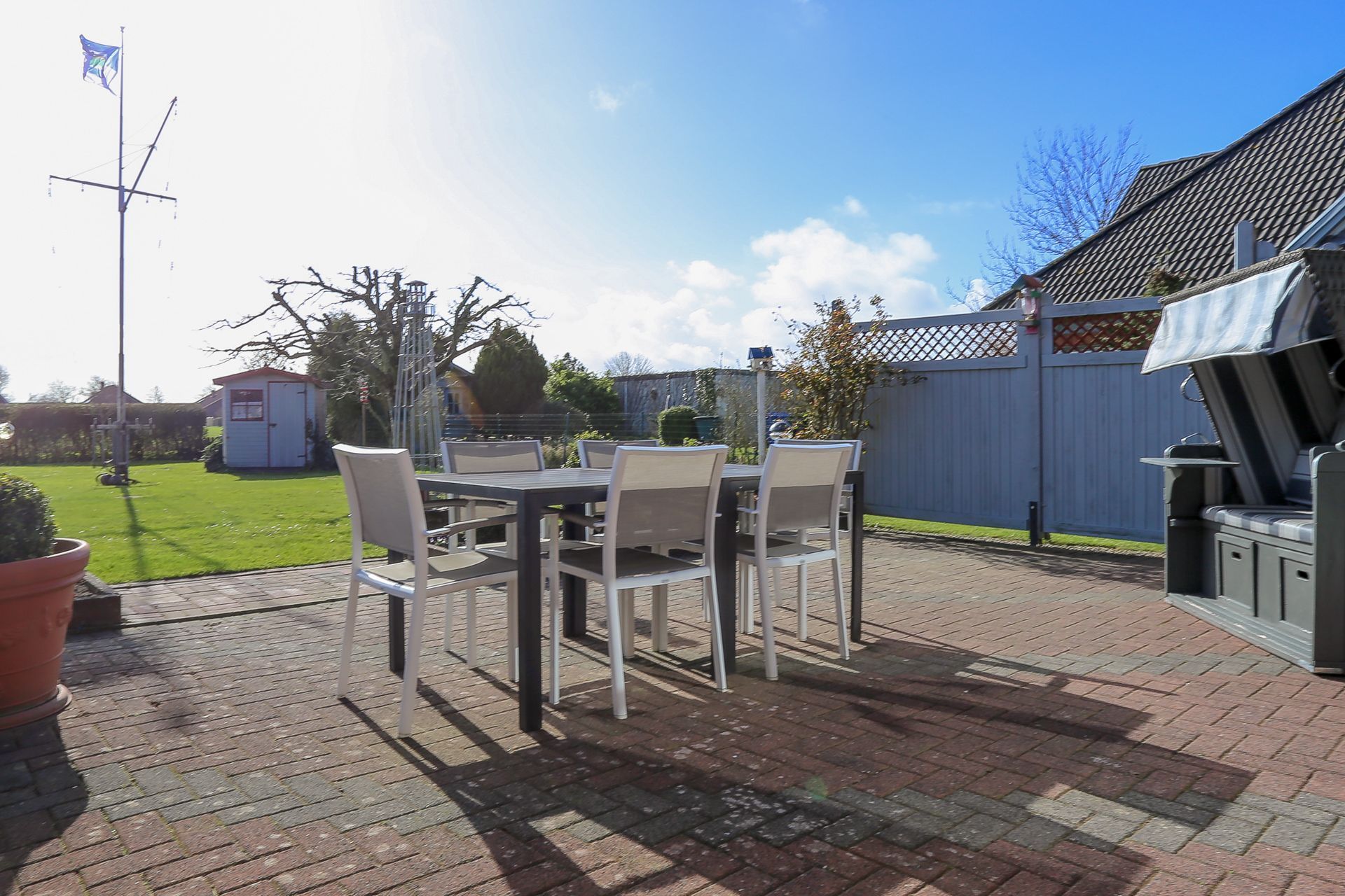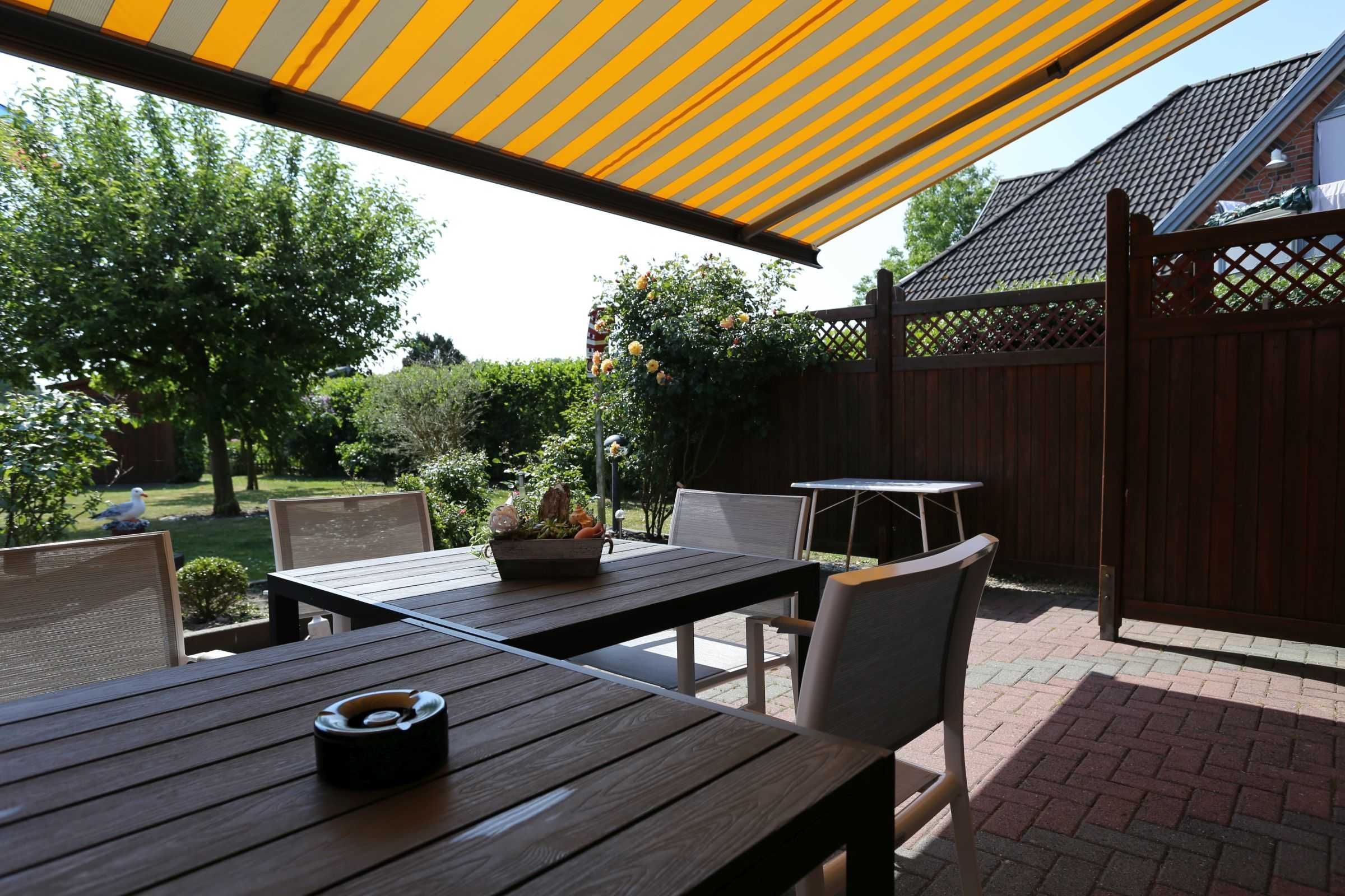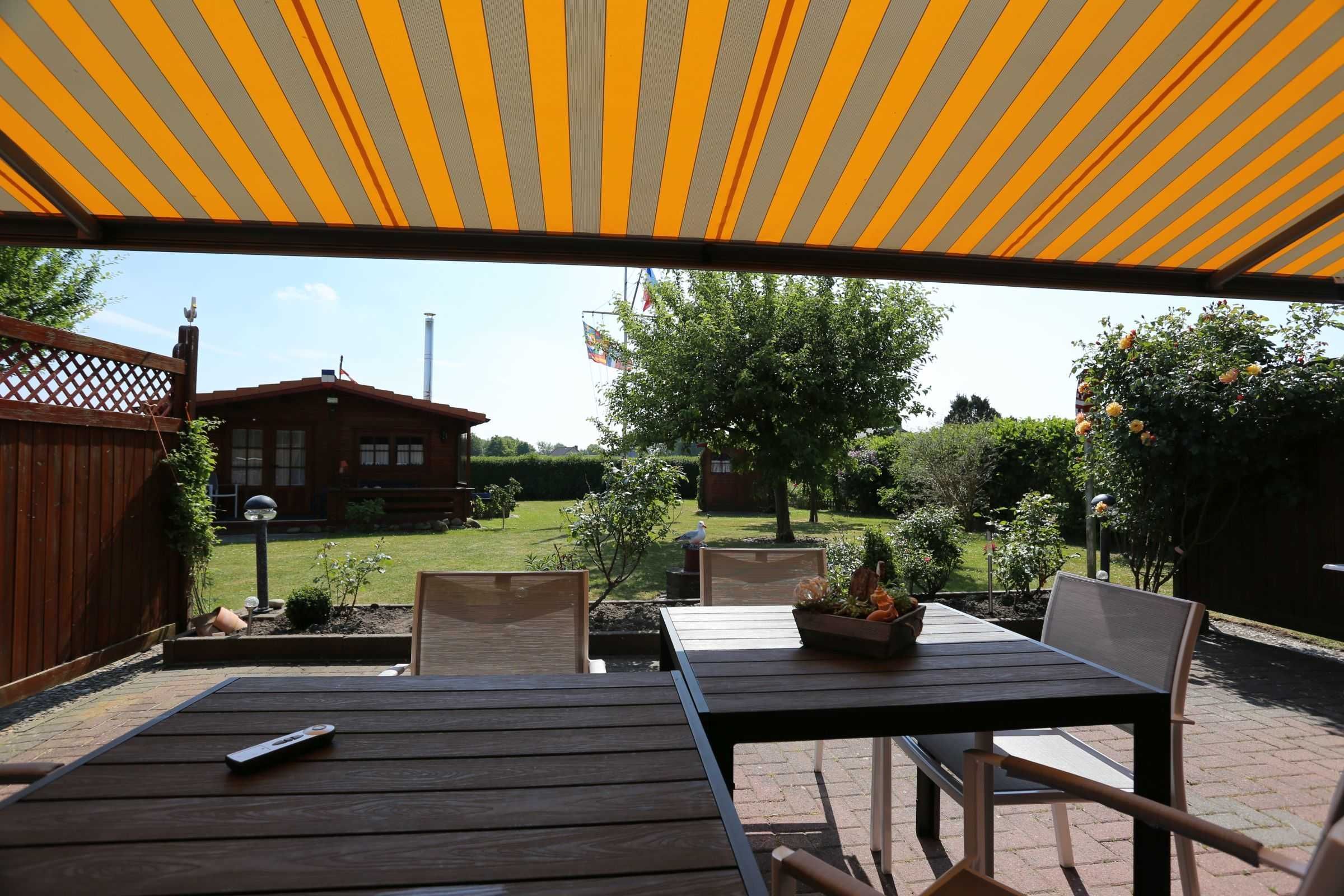 Terrasse: Auf der Terrasse stehen Ihnen 8 Gartenstühle und 2 Gartentische zu Verfügung. Weiterhin steht Ihnen auch eine Sonnenschutzmarkise zur Verfügung.